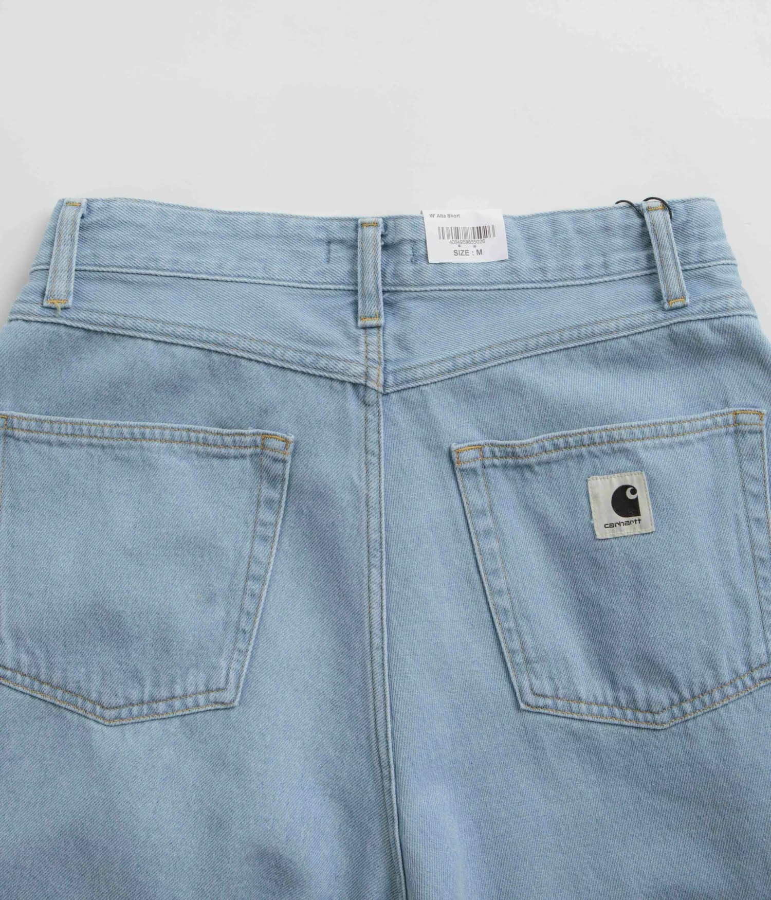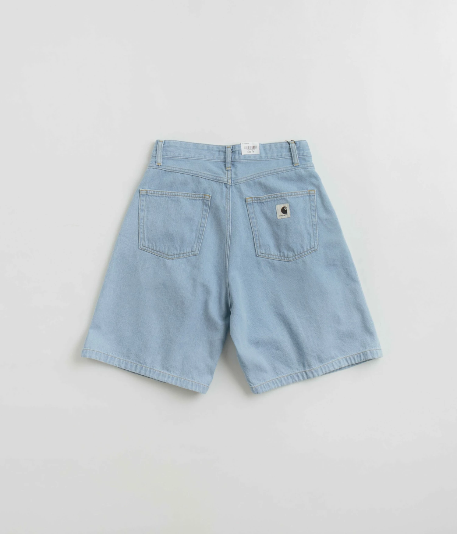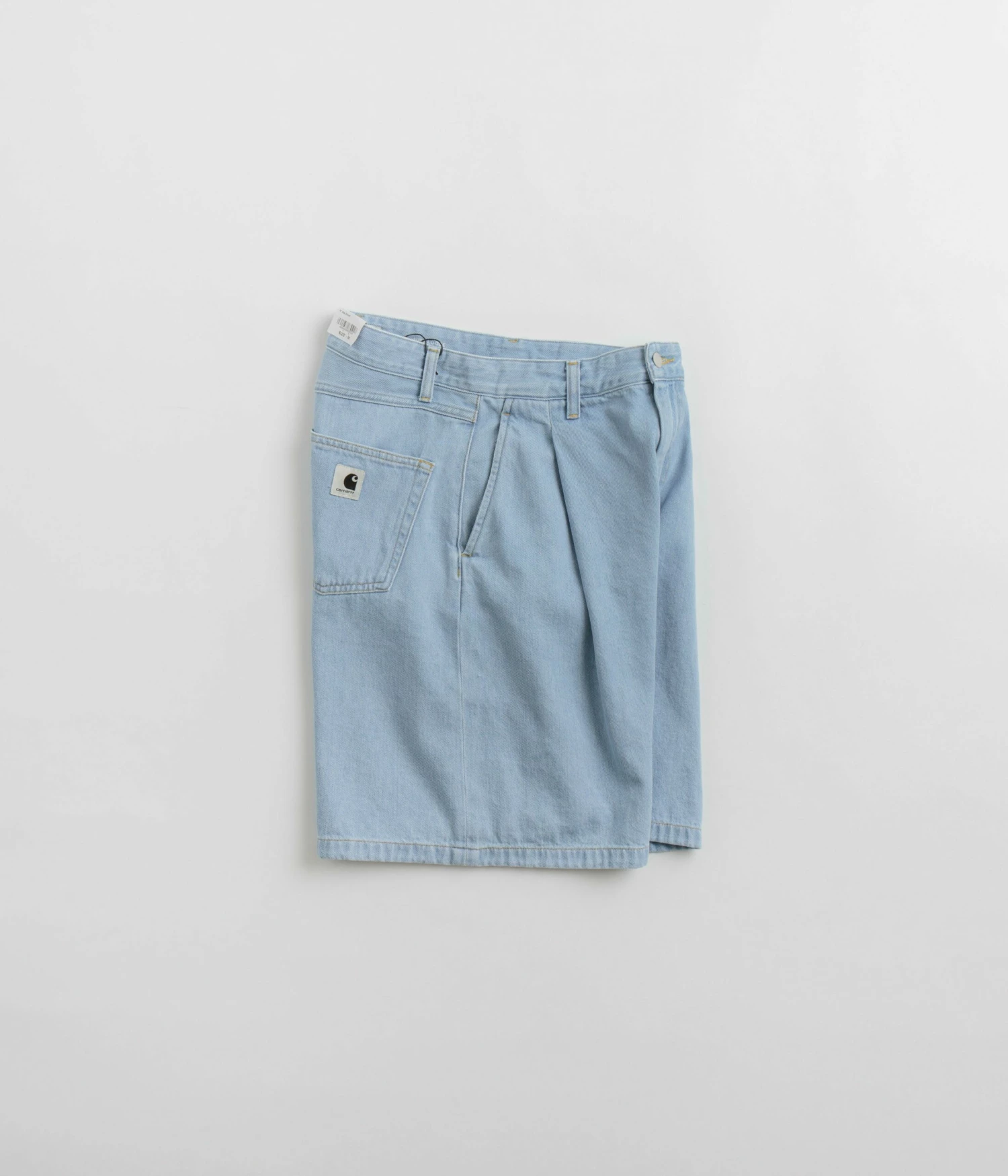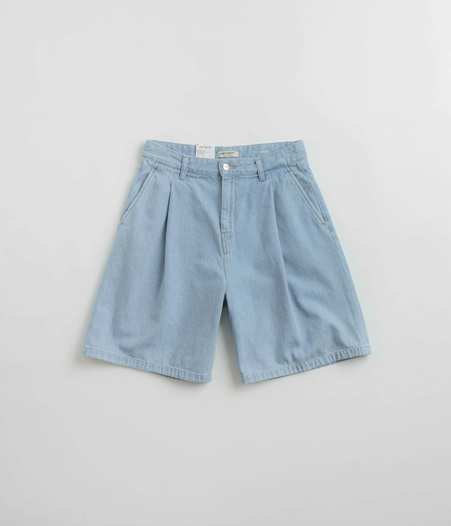 Carhartt Womens Alta Shorts in Stone Bleached Blue. Tailored to a loose fitting from 100% cotton ‘Olympia’ denim, these pleated Carhartt shorts are designed with a belt loop waistband and a single button secured zipper fly. Finished with a stone bleached fabrication, these blue Carhartt womens shorts also feature four classic pockets and woven flag label branding./p>