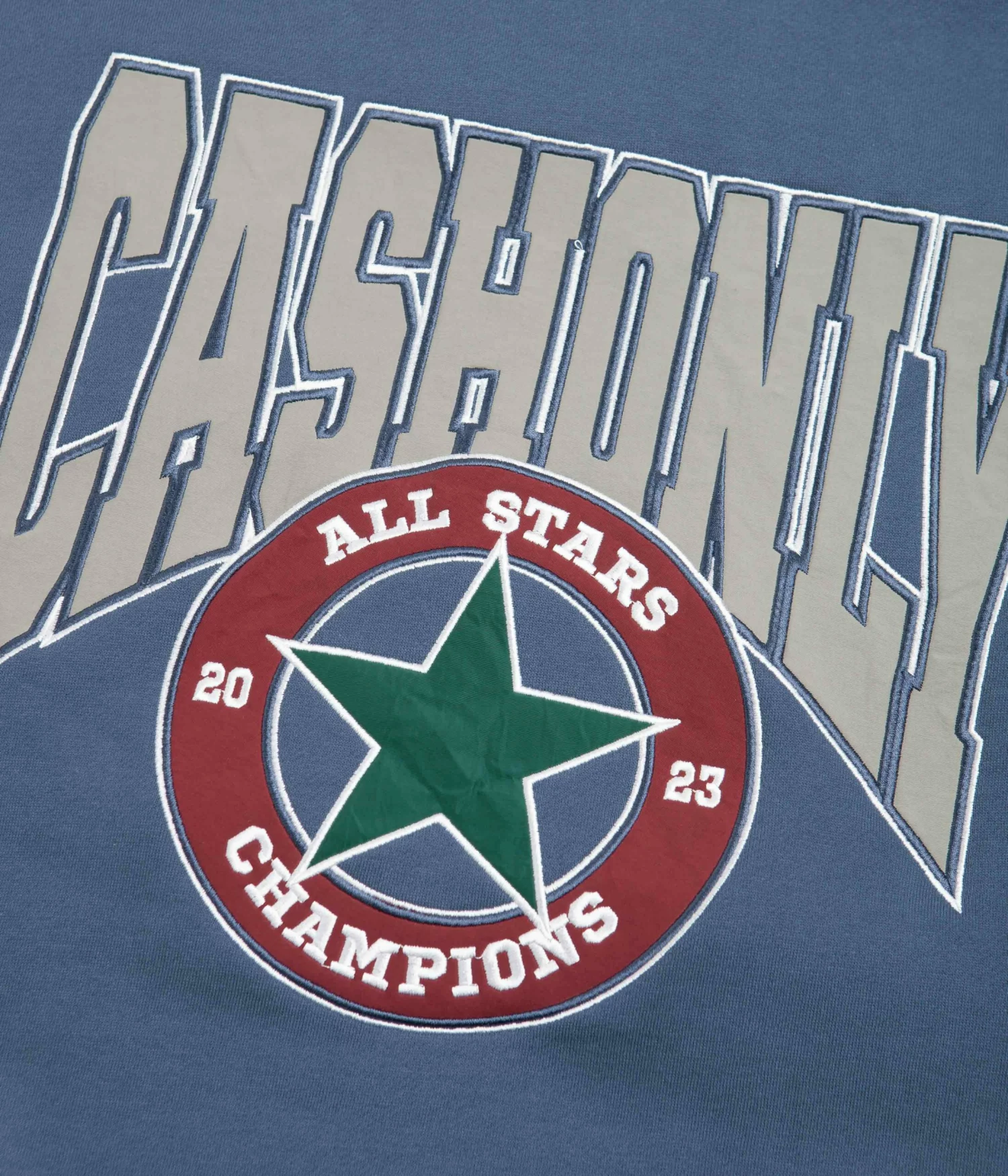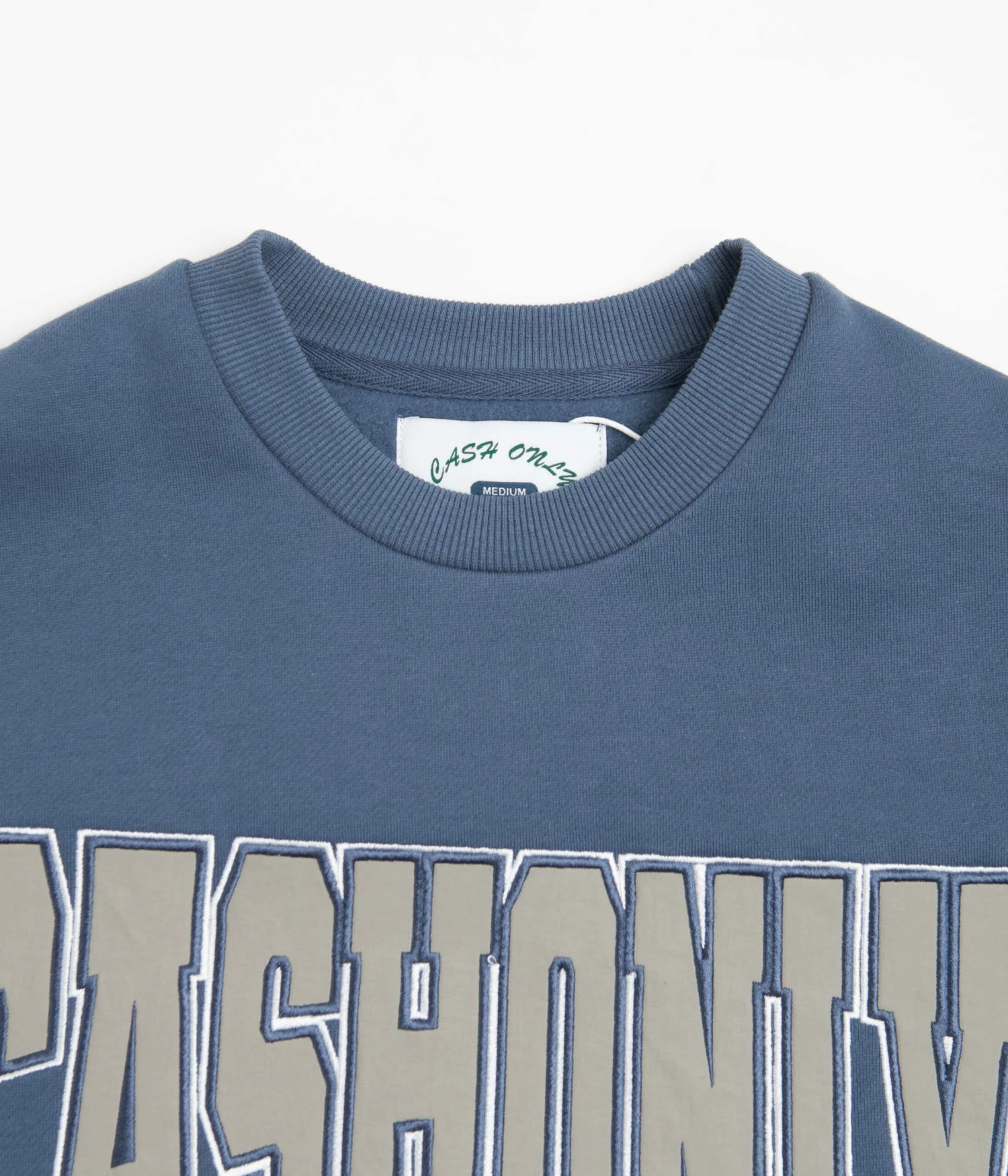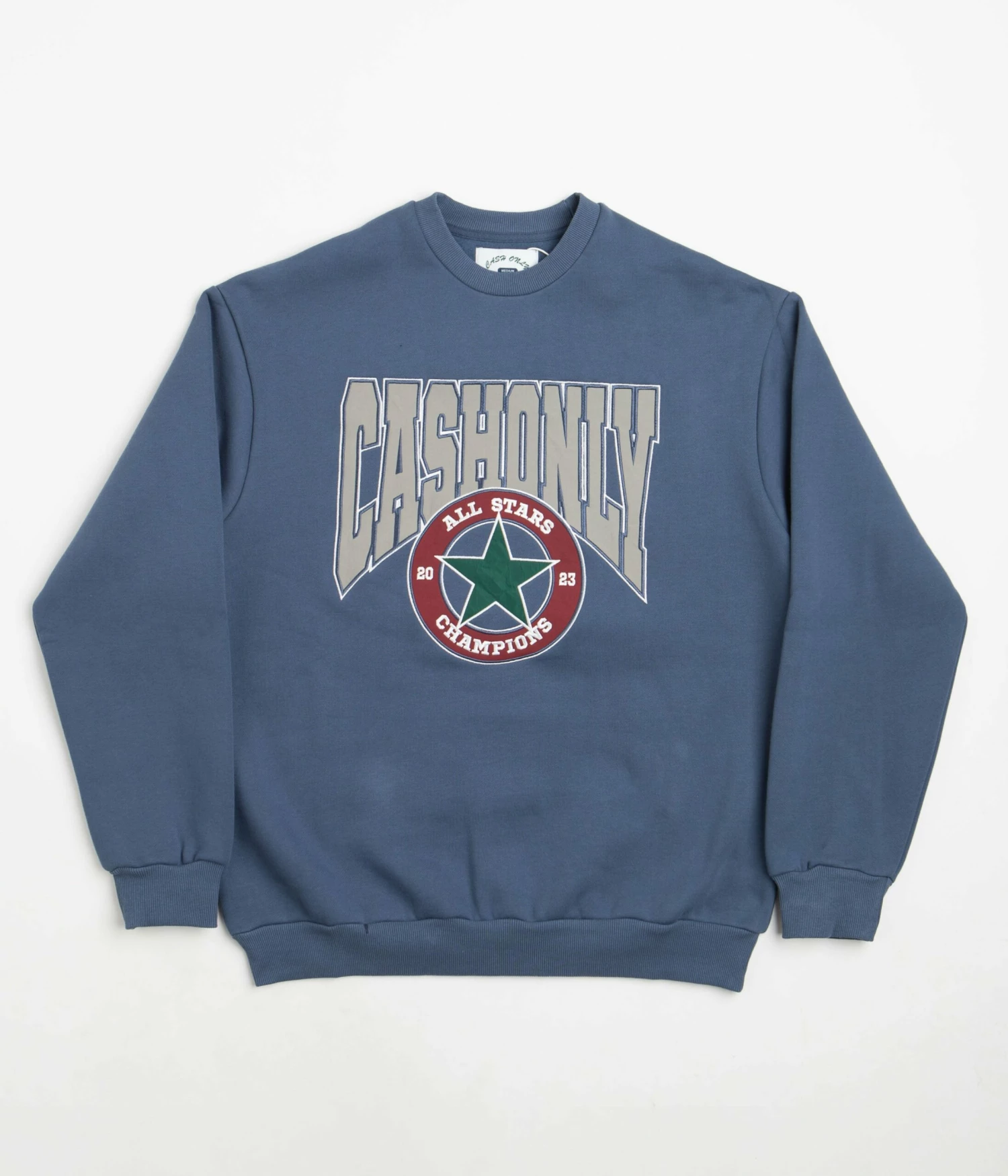 Cash Only All Star Applique Crewneck Sweatshirt in Slate. Vintage inspired and tailored to a regular fitting, this heavyweight Cash Only sweatshirt is made from a cotton-polyester blend. Featuring a thick rib crew collar, dropped shoulders, ribbed cuffs and a woven elastic hem, this grey Cash Only sweater is finished with an applique ‘All Star Champions’ logo embroidered across the centre chest.