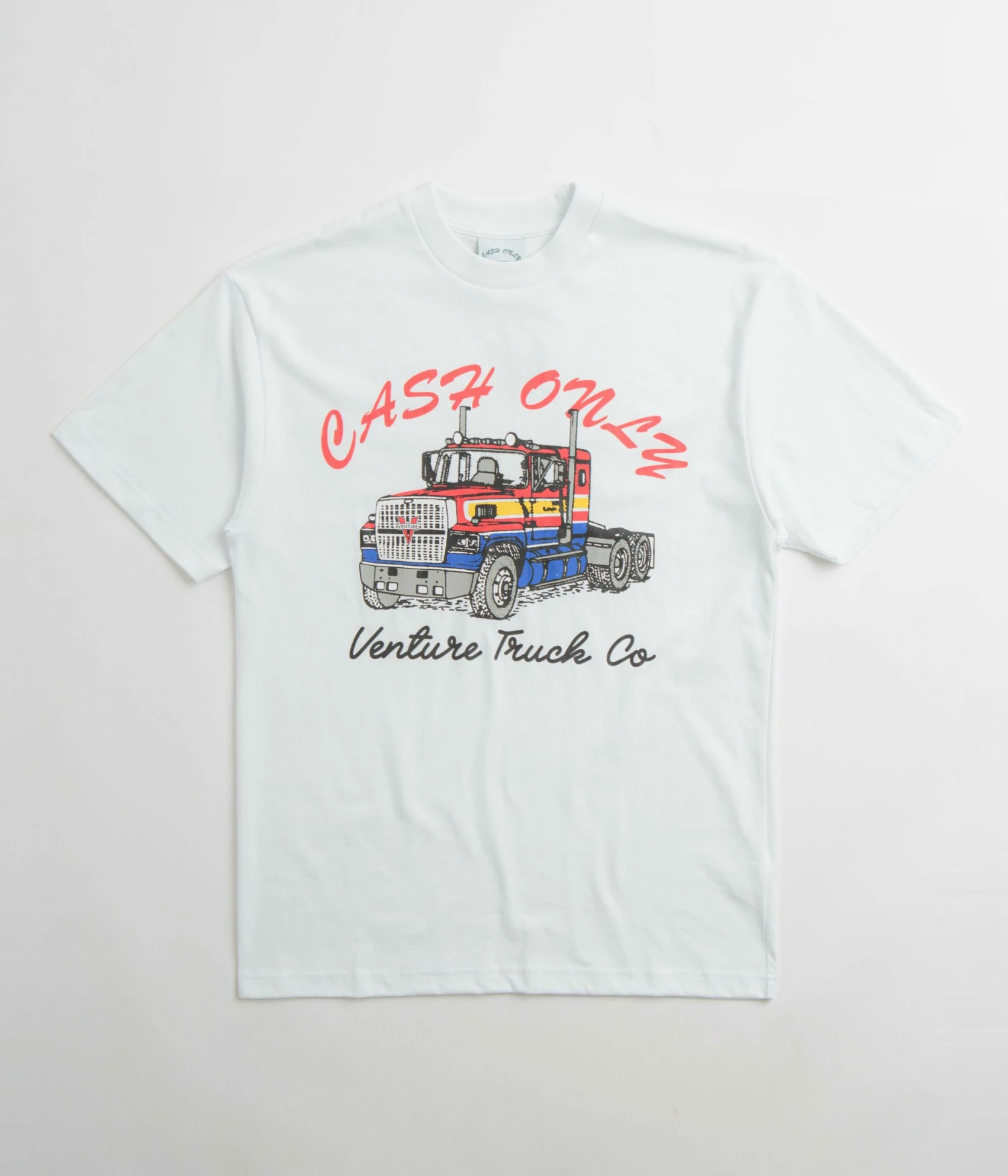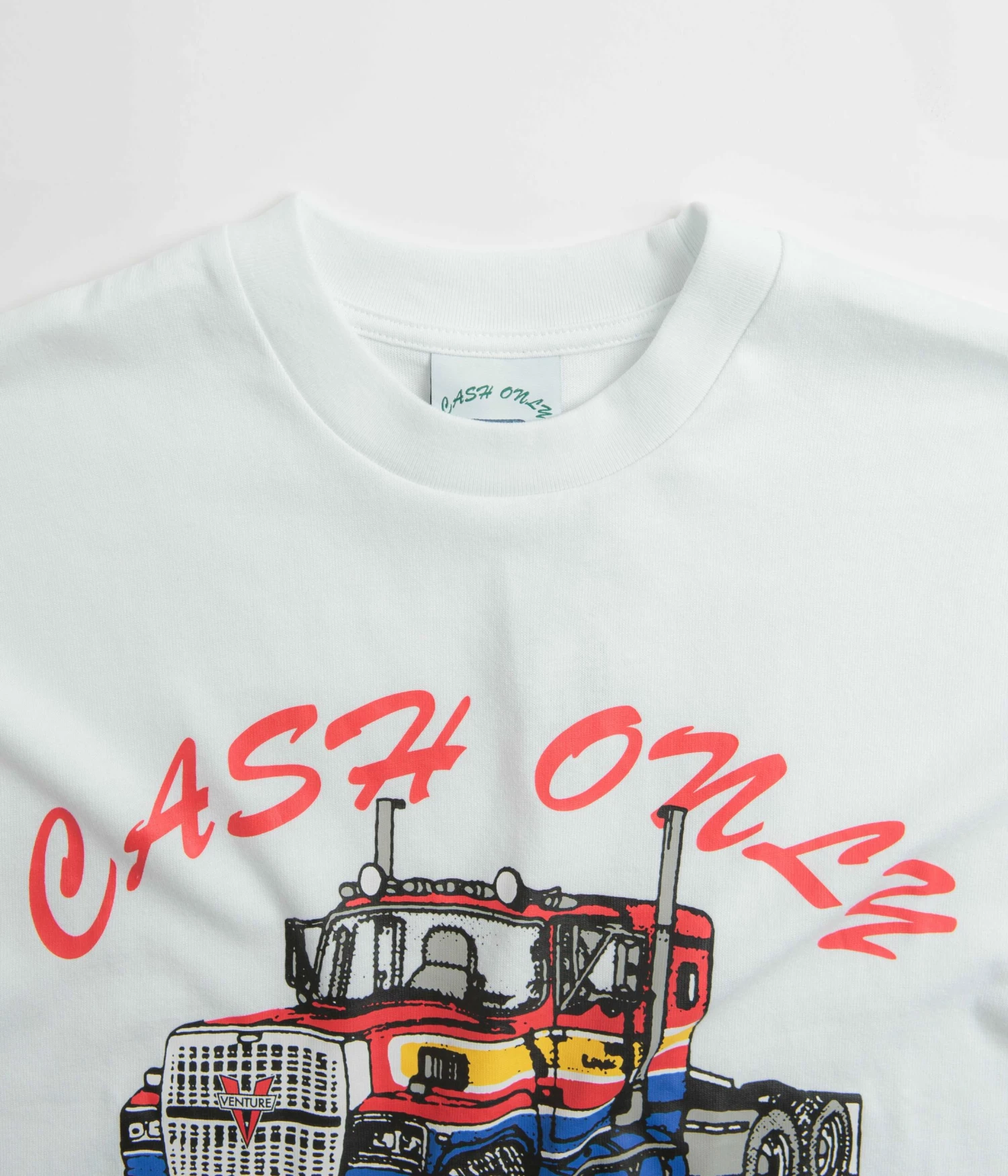Cash Only x Venture Truck T-Shirt in White. Part of the brand’s latest collaboration with Venture Trucks, this regular fitting Cash Only t-shirt is made from 100% heavyweight cotton. Featuring a flexible rib knit collar and a straight cut hem, this white Cash Only t-shirt is finished with a printed Cash Only x Venture Truck Co. centre chest graphic.
