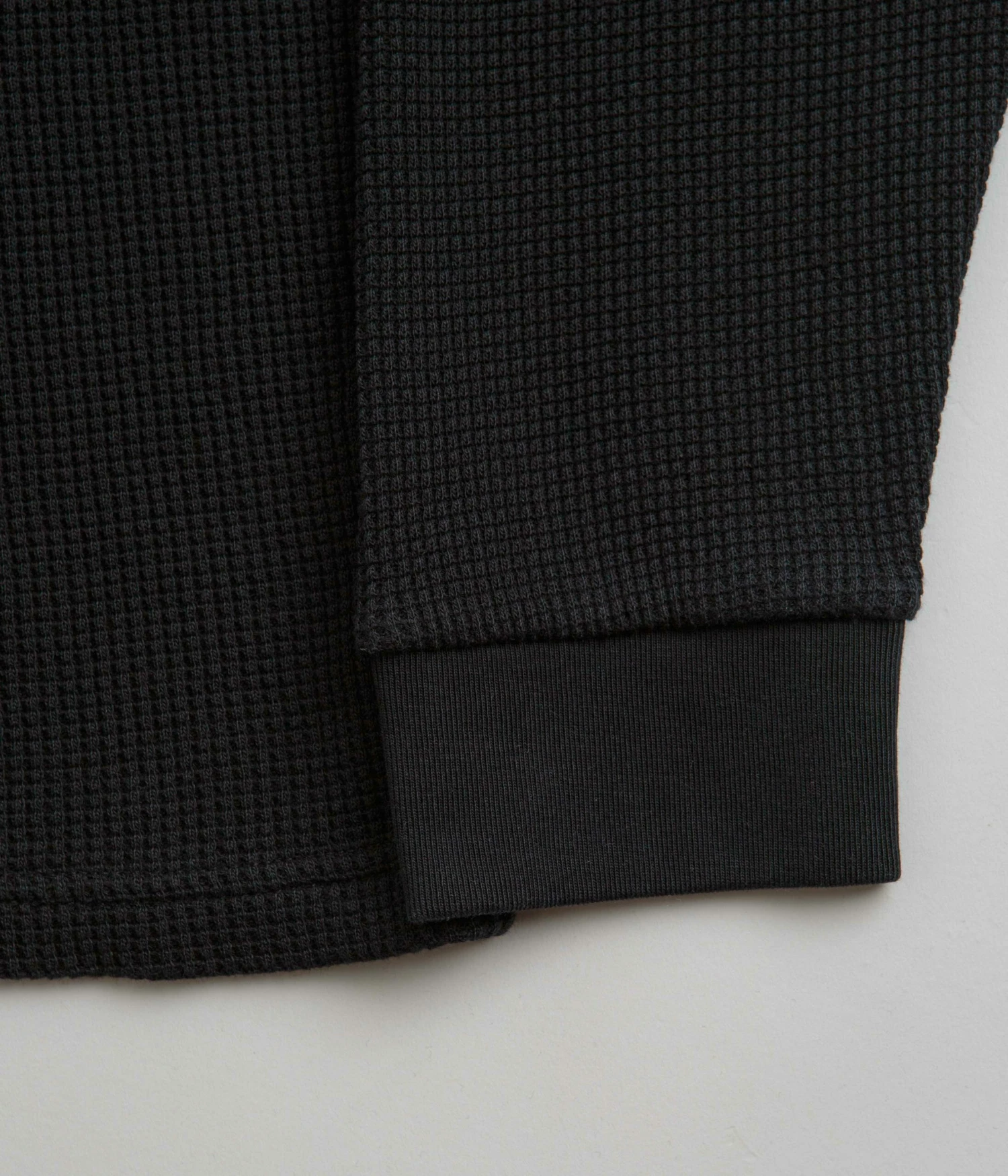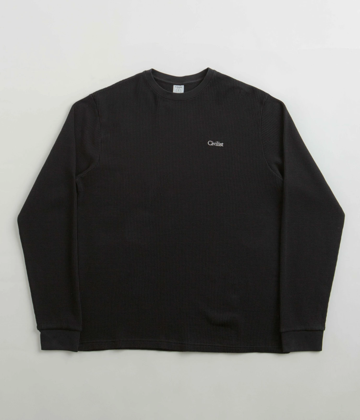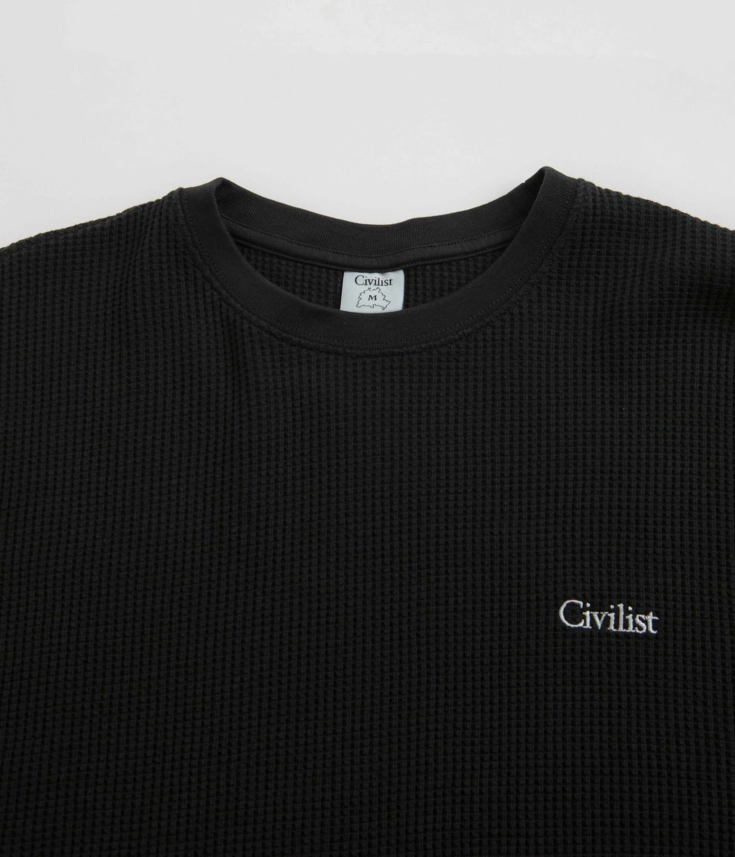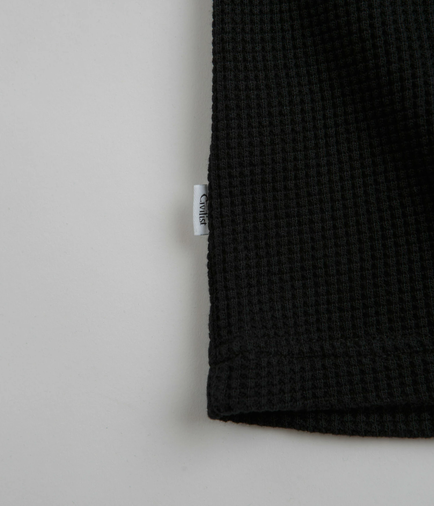 Civilist Thermal Waffle Long Sleeve T-Shirt in Black. Made from 100% cotton, this pre-shrunk Civilist t-shirt is tailored to a regular fitting with a classic waffle knit construction. Featuring a rib knit collar, ribbed cuffs and a straight cut hem, this black Civilist t-shirt is finished with embroidered left chest branding.