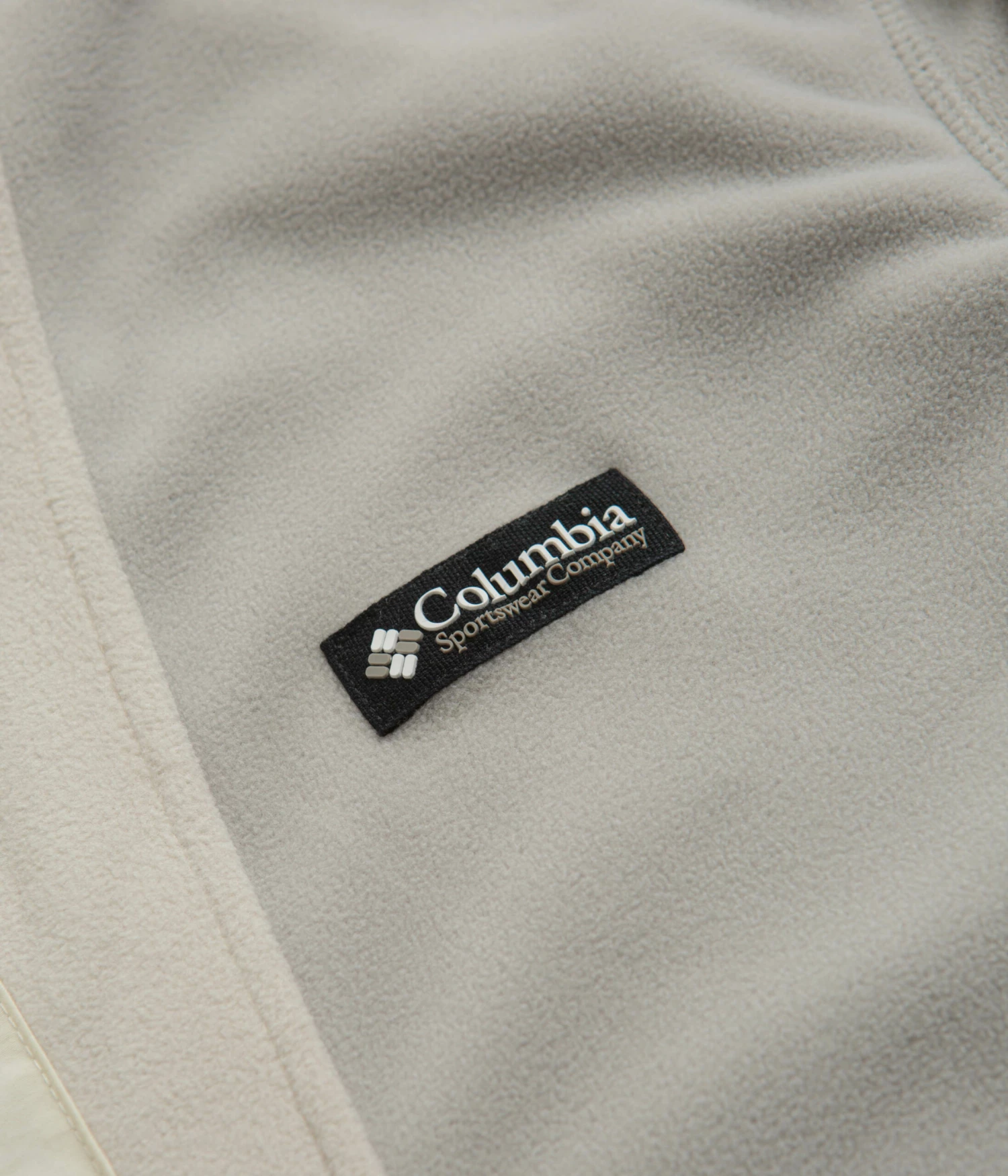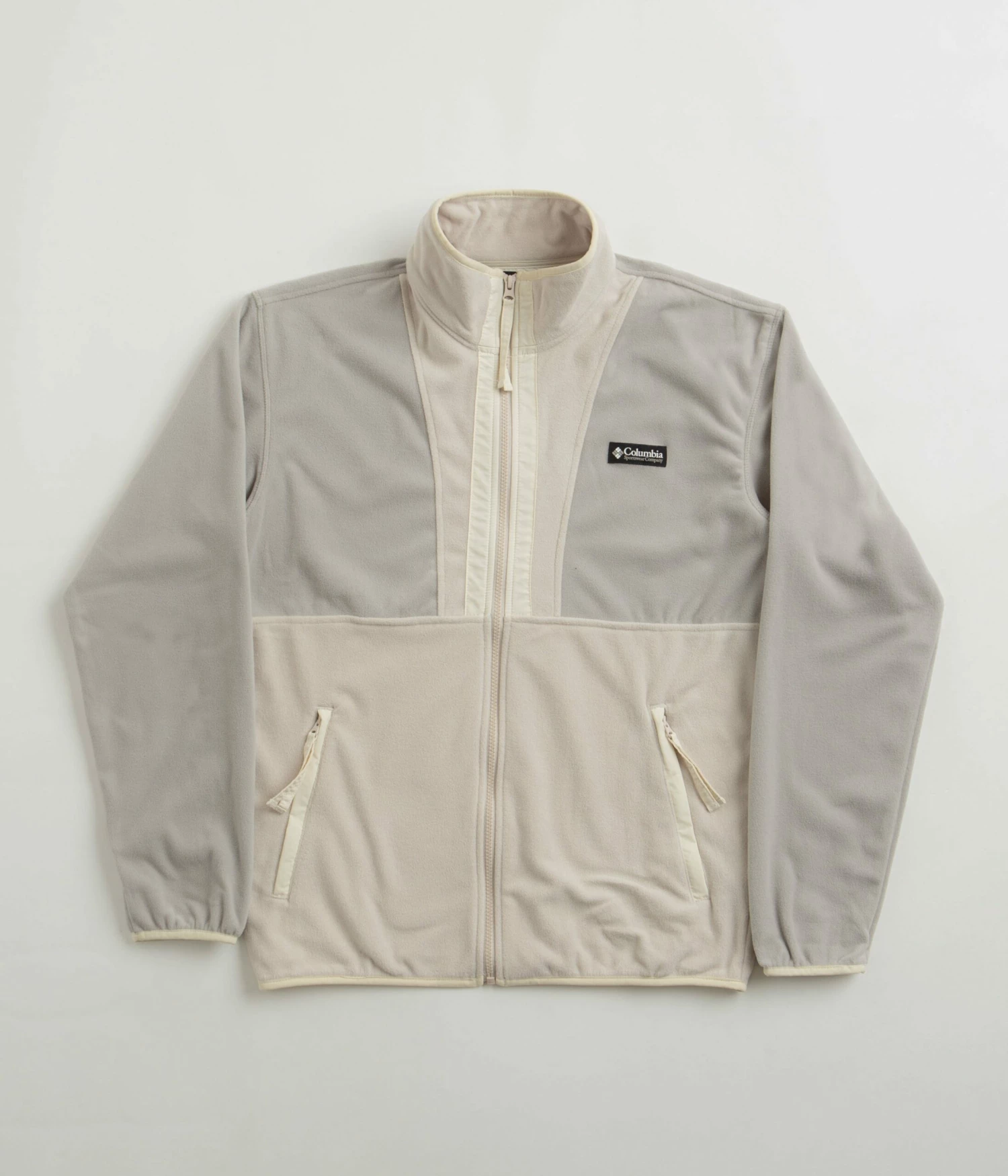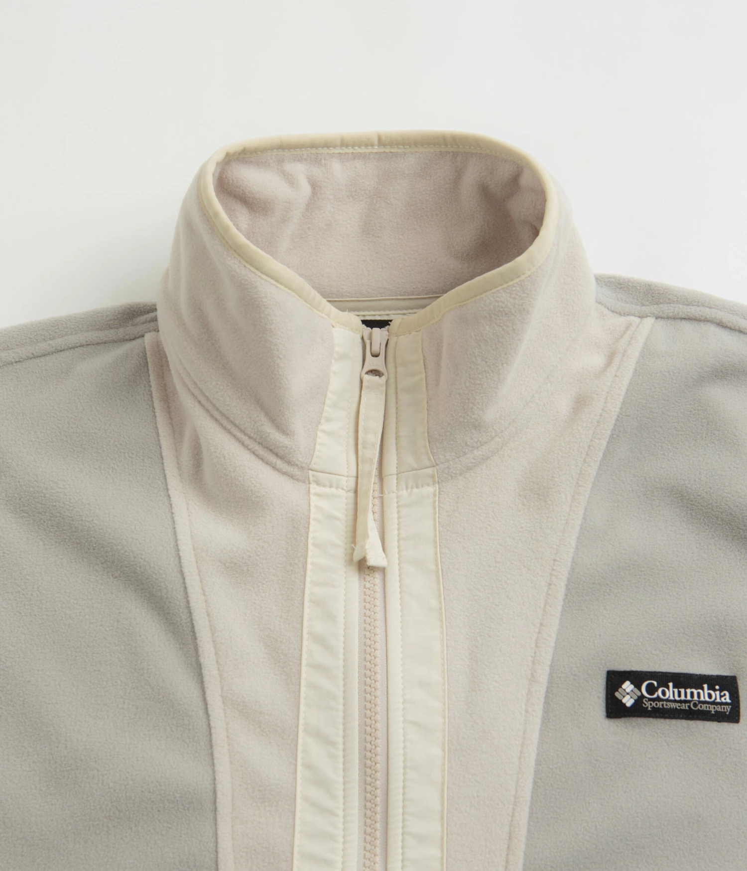 Columbia Back Bowl Lightweight Fleece in Flint Grey, Dark Stone and Chalk. Panelled and tailored to a regular fitting, this Columbia fleece is made from 100% polyester Micro™ Fleece fabric. Featuring a classic stand collar, a full length zipper fastening and elasticated cuffs, this grey beige Columbia fleece is finished with a woven elastic hem, taped seams, two zippered waist pockets and with woven flag label branding.