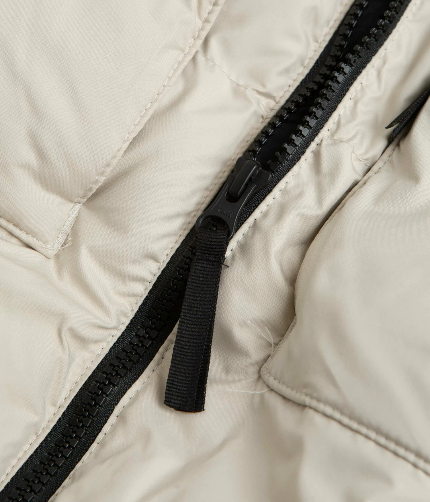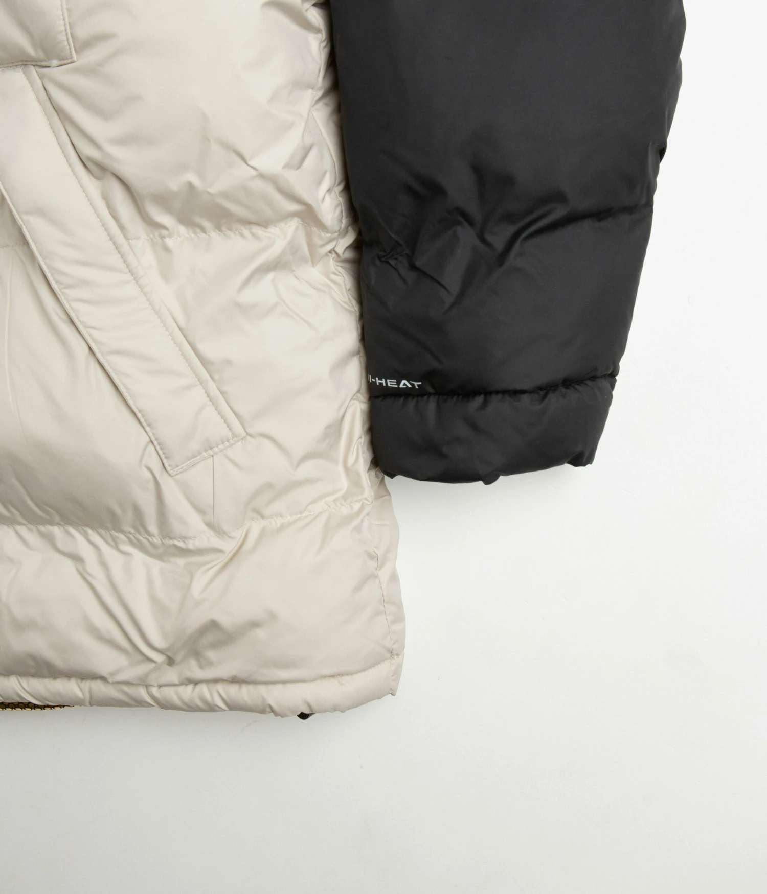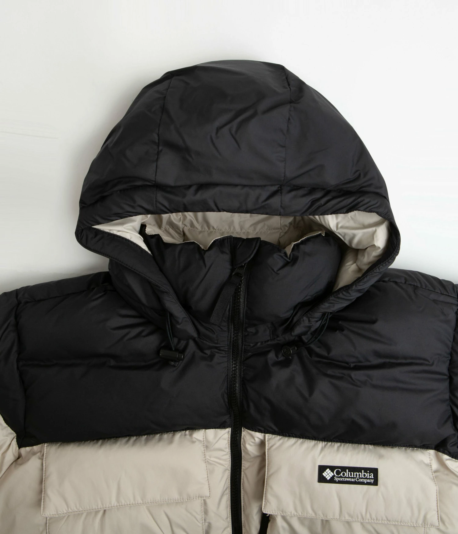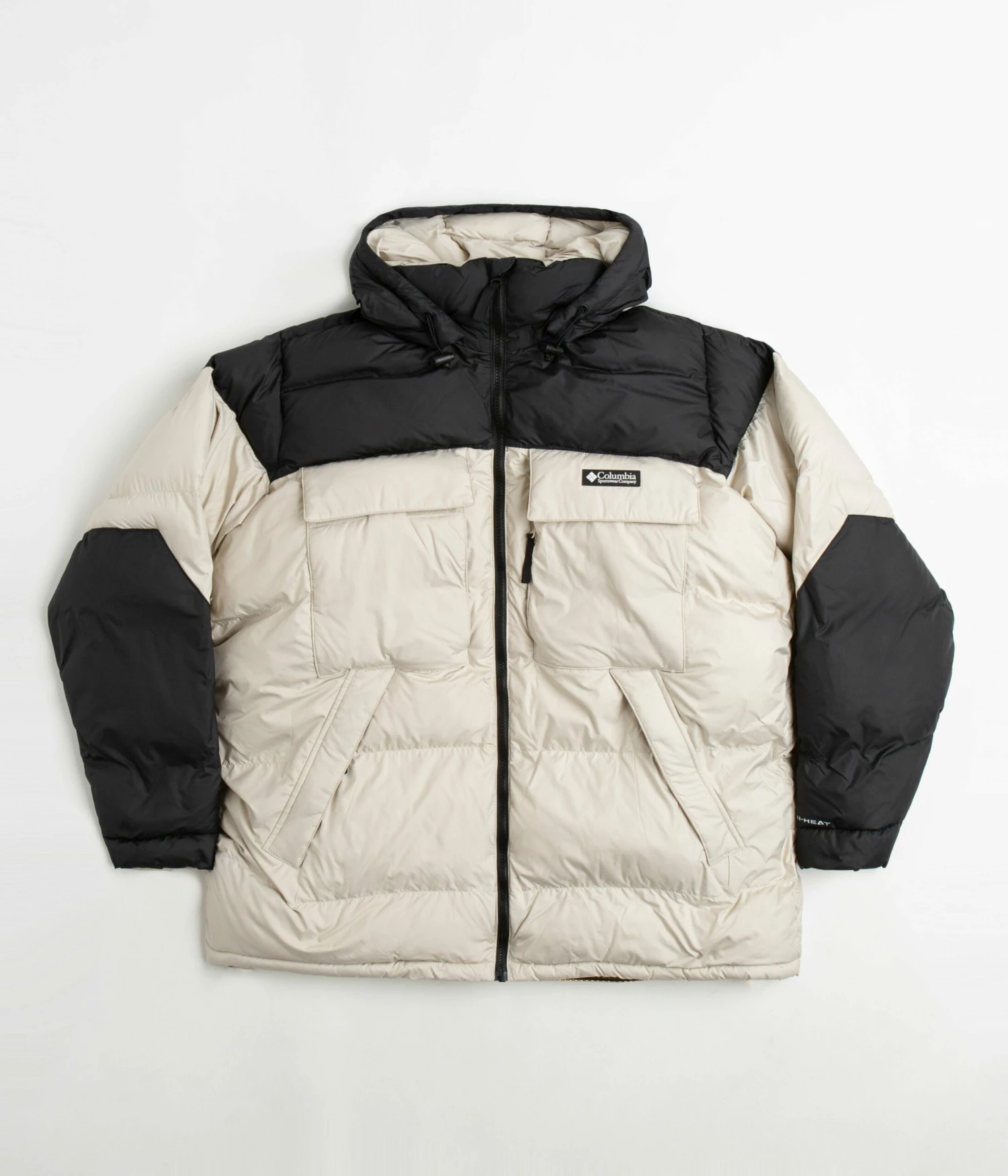 Columbia Ballistic Ridge Oversized Puffer Jacket in Dark Stone and Black. Tailored to a regular fitting with an oversized cut, this Columbia jacket is made from 100% polyester Storm-Lite DP II with Omni-Heat™ insulation. Featuring a full length zipper fastening, an integrated chin guard and a removable toggle-cord hood, this khaki black Columbia jacket also features adjustable cuffs and an adjustable hem. Finished with two zippered waist pockets, two dual-entry chest pockets and with woven flag label branding.
