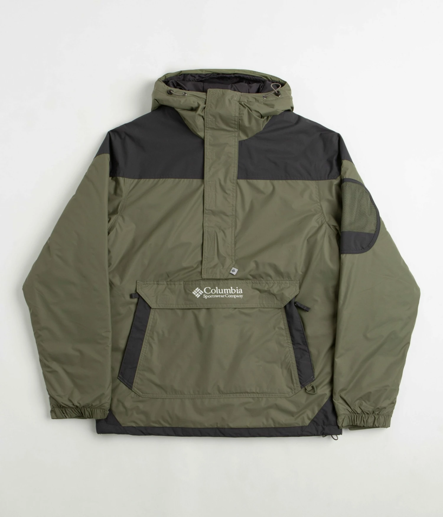 Columbia Challenger Pullover Jacket in Stone Green and Shark. Designed with Microtemp XF II insulation and a plain-weave Hydra Cloth 3000 shell, this water-resistant Columbia jacket is tailored to a regular fitting. Featuring a toggle-cord adjustable hood, a half length zipper fastening, a side-zip opening system and with an integrated chin guard, this green Columbia jacket also features adjustable cuffs. Finished with two zippered waist pockets, a zipped sleeve pocket, a centre map pocket and with both embroidered and woven flag label branding.