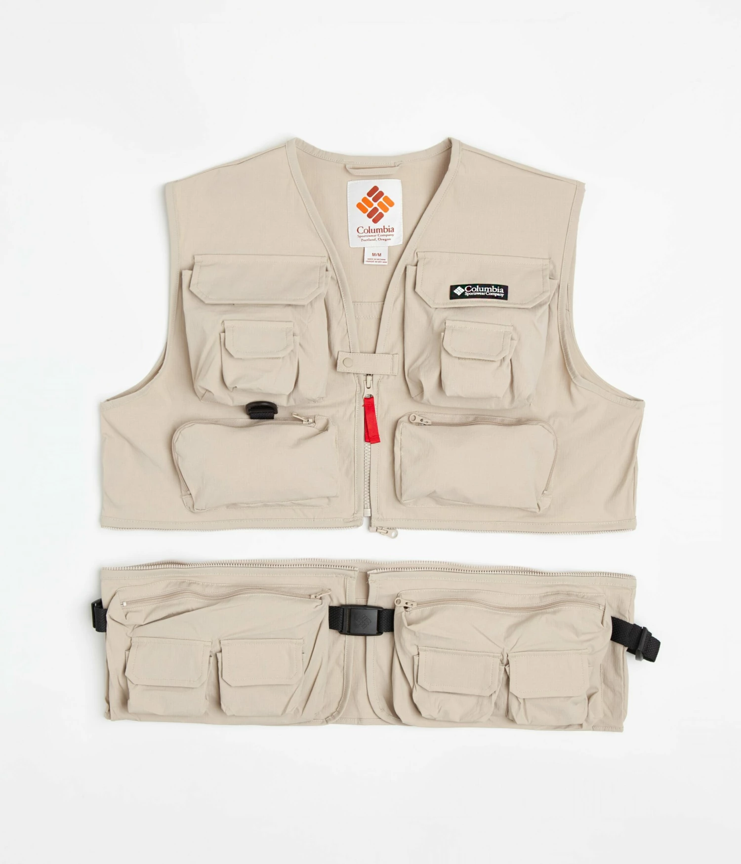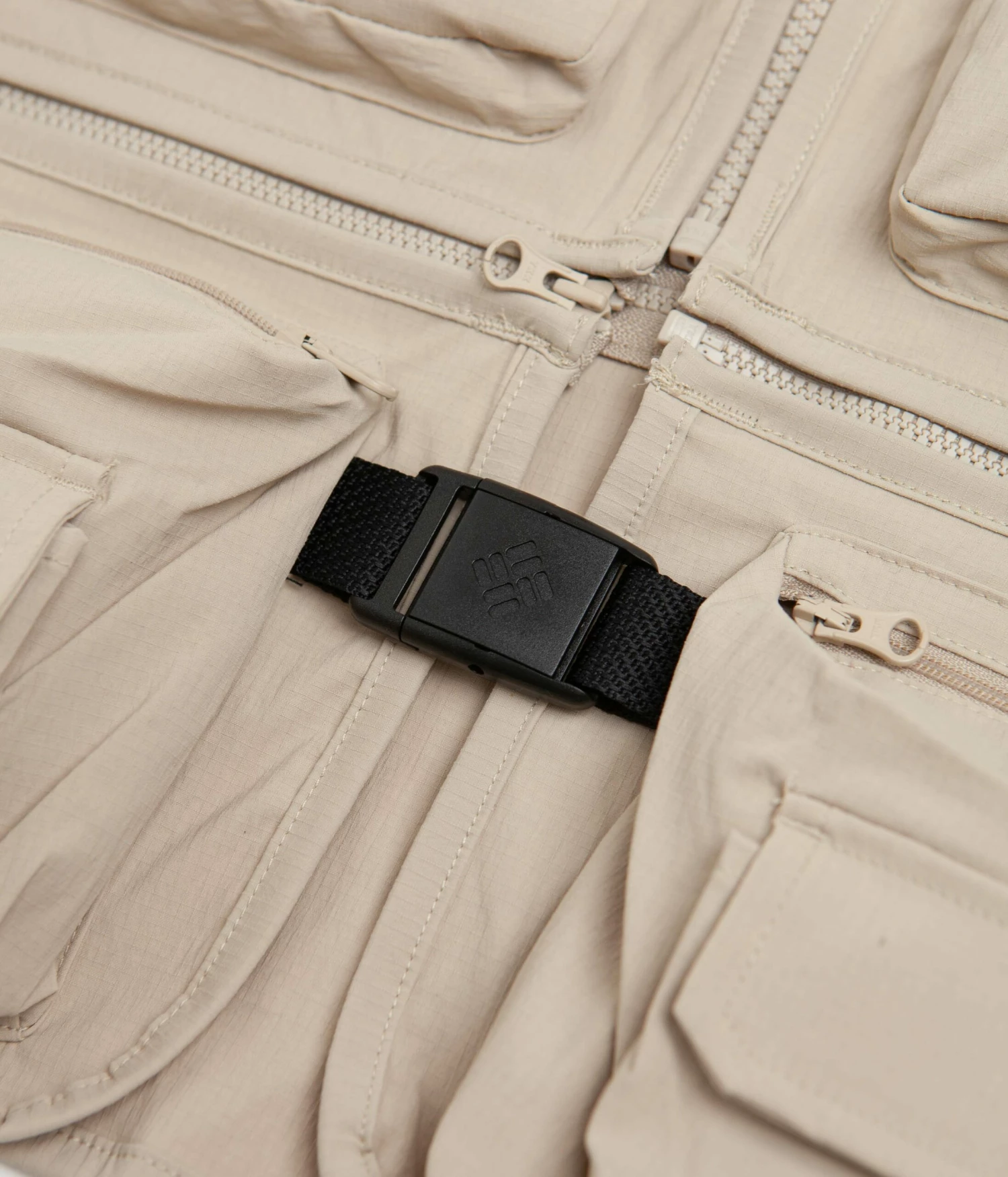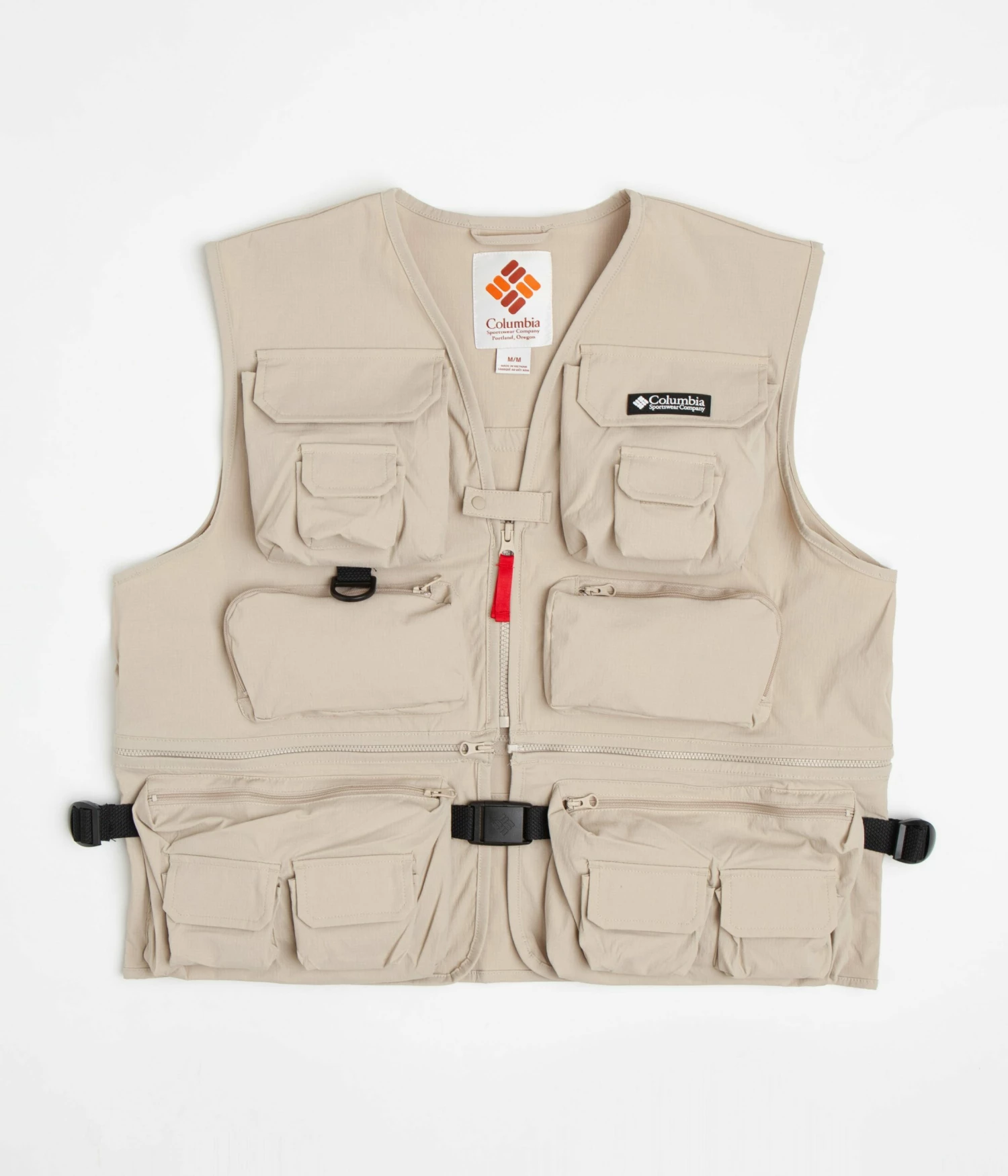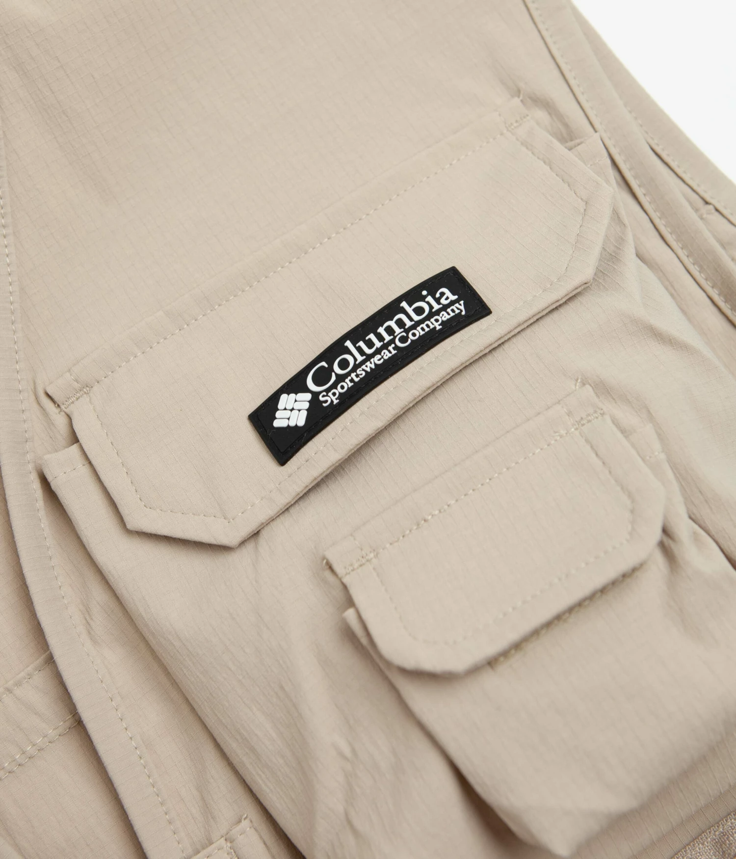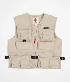 Columbia Field Creek Big Horn Vest in Ancient Fossil. Designed with a removable bottom waistband with 3D pockets, this sleeveless Columbia vest is made from a nylon elastane-stretch ripstop blend with a water-resistant and stain-repellent shell. Featuring a V-neck collar, taped seams and a full length zipper fastening with a secure centre snap popper, this khaki Columbia vest is finished with a woven flag label, zippered pockets, 3D stash pockets and with a D-ring attachment point.
