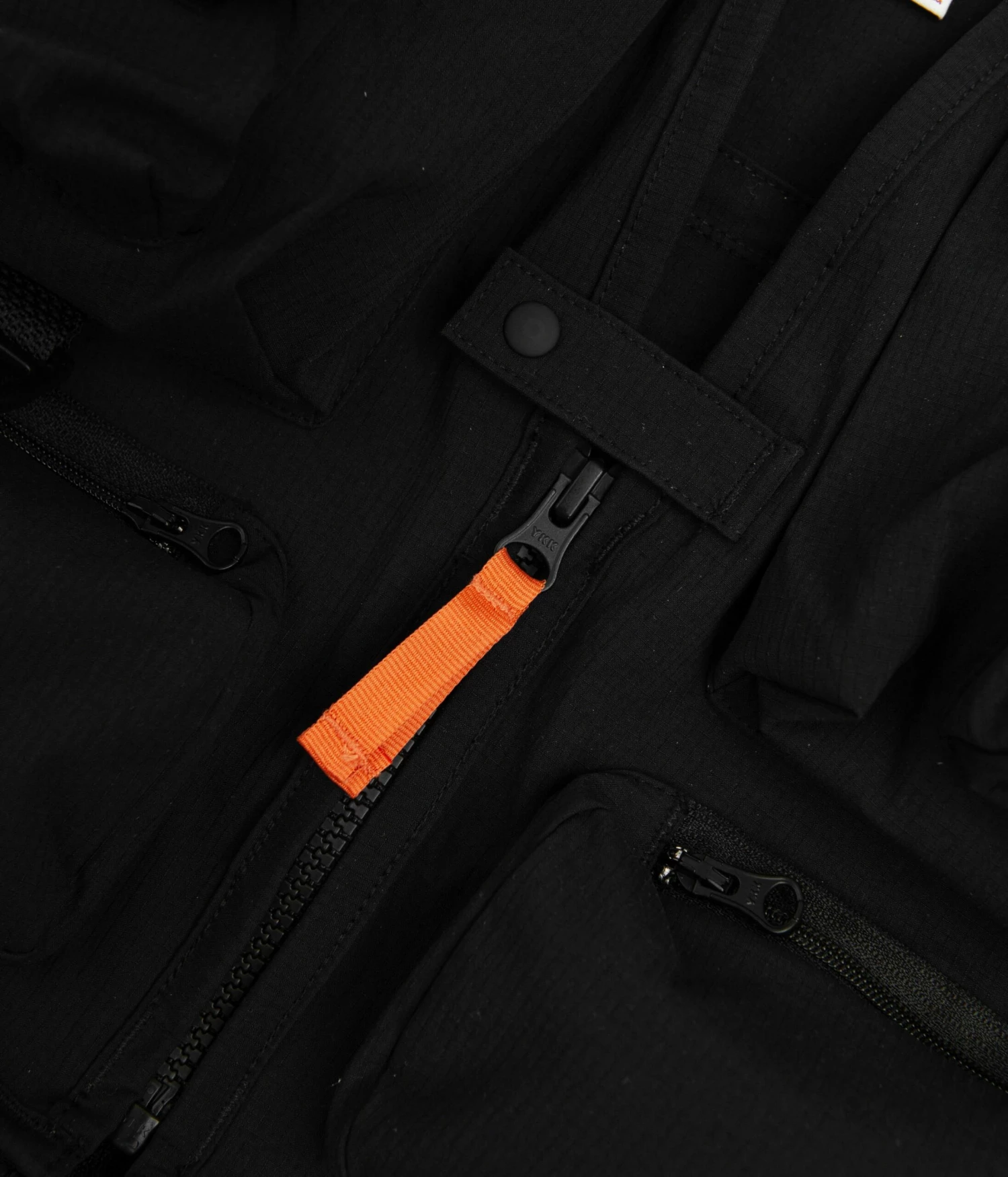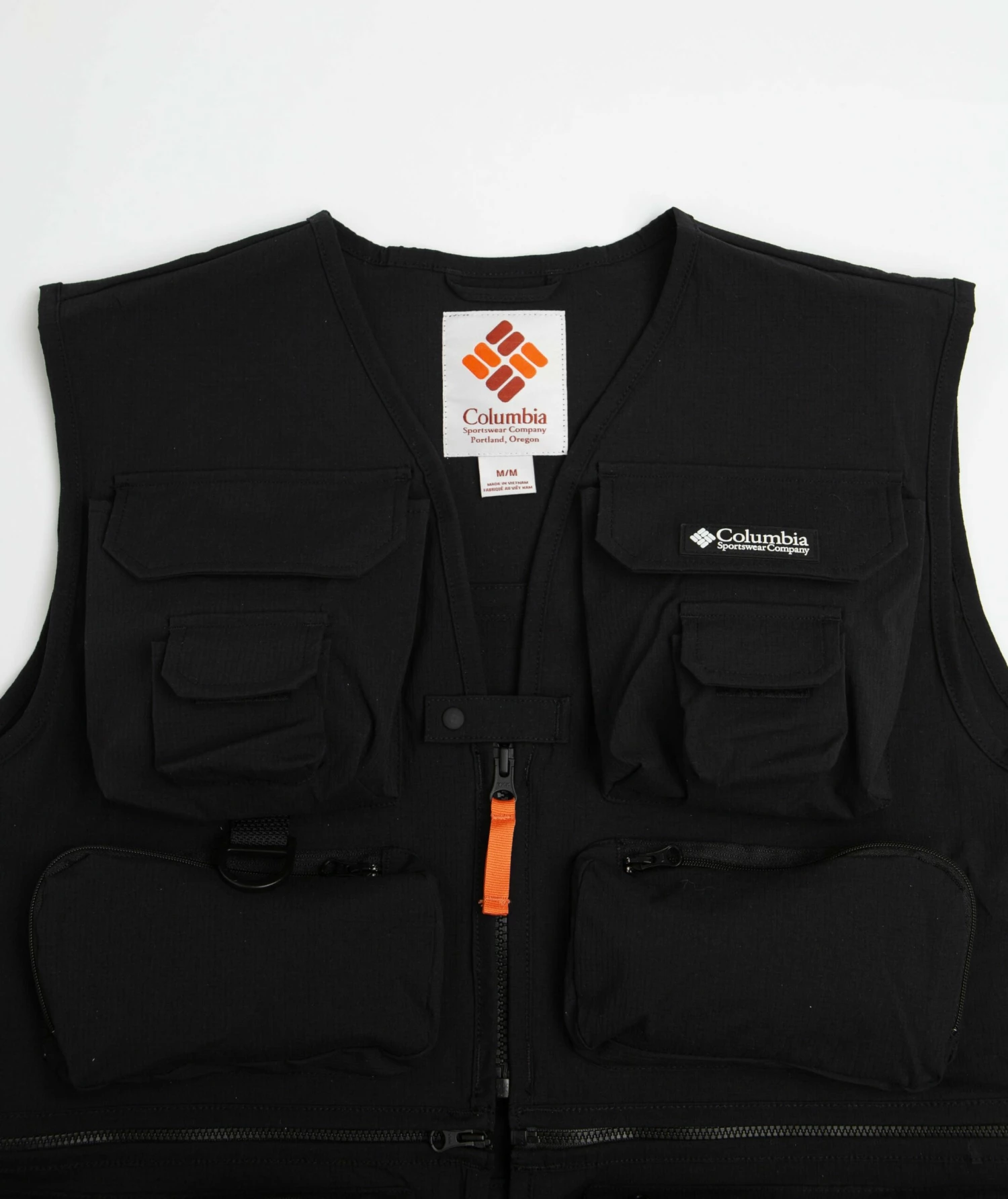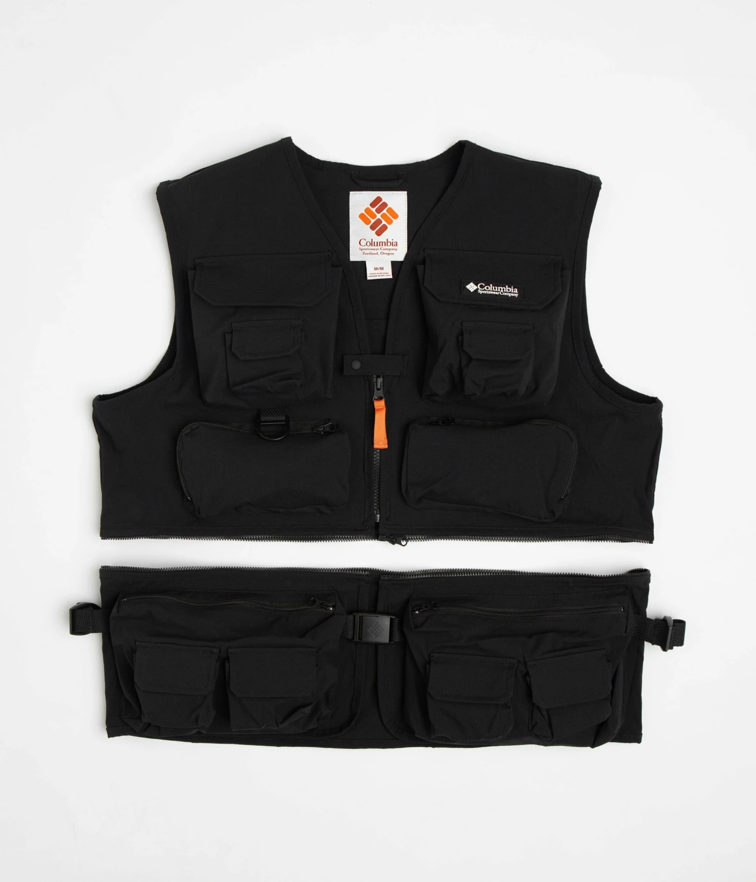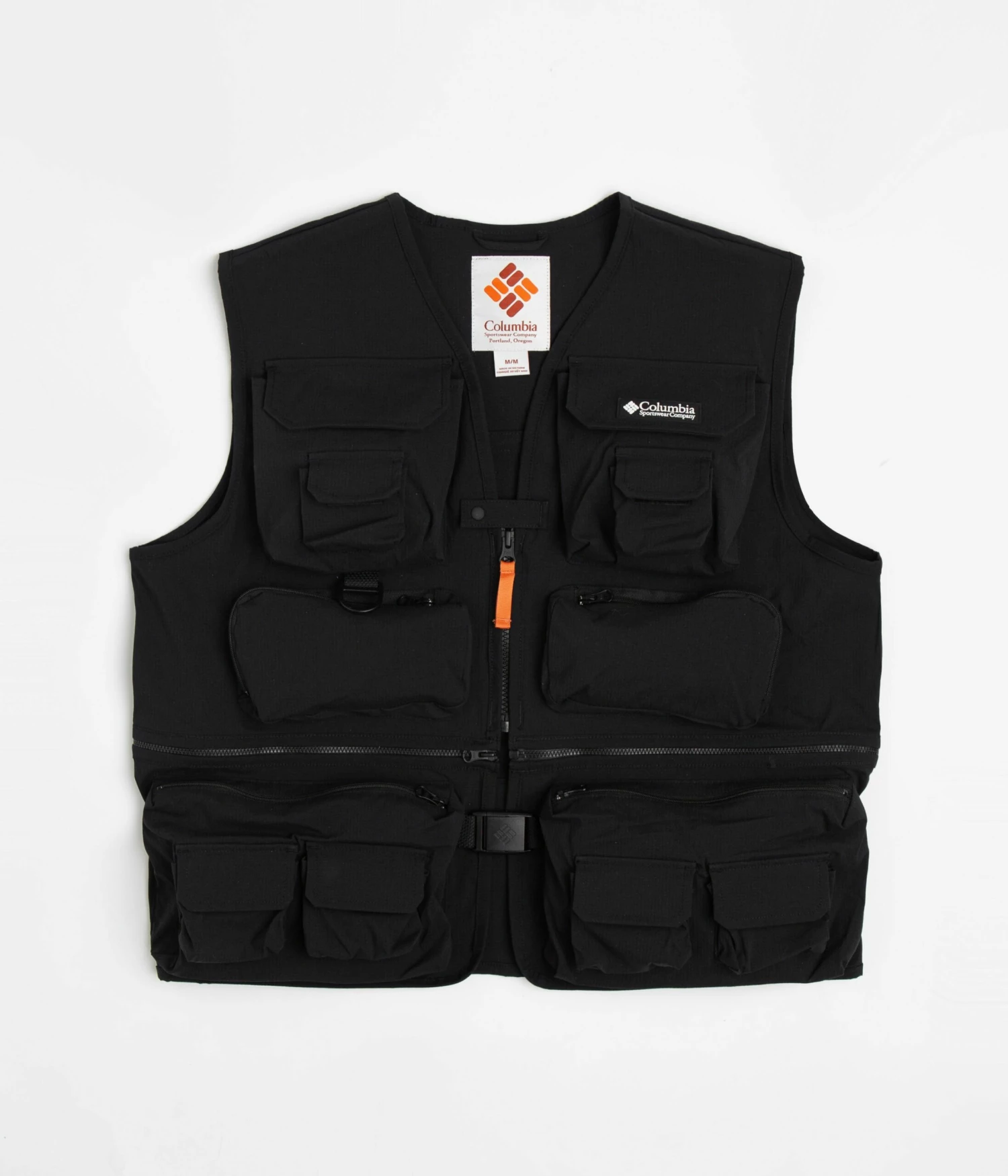 Columbia Field Creek Big Horn Vest in Black. Utility inspired and made from a nylon-elastane blend, this water and stain-repellent Columbia vest is tailored to a regular fitting with a V-neck collar and a full length zipper fastening. Featuring taped seams, a mid-chest security snap fastening and built-in Omni-Shield™ technology, this black Columbia vest is finished with 3D chest pockets, 3D waist pockets, a D-ring attachment point and with a removable bottom band.