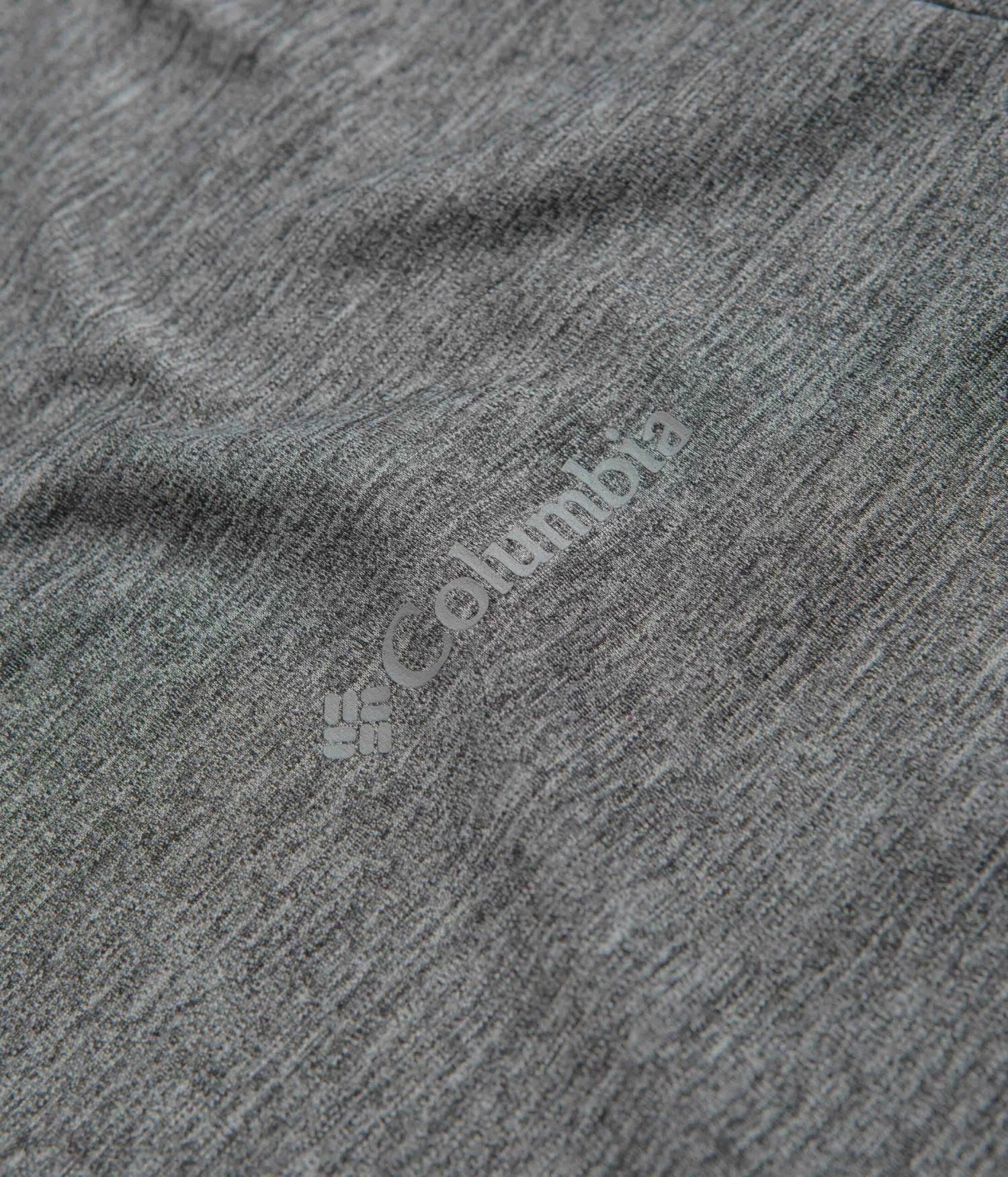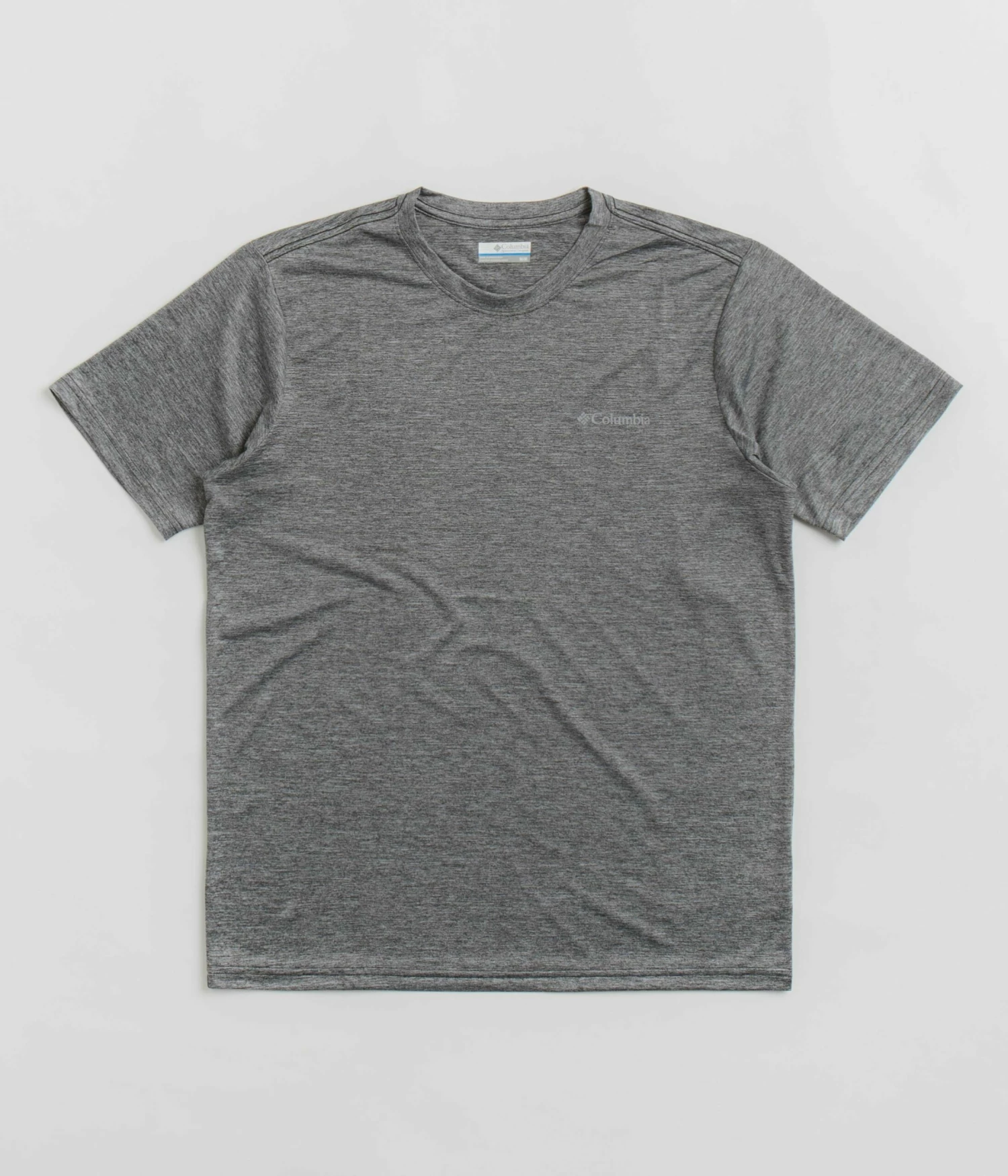 Columbia Hike T-Shirt in Black Heather. Regular fitting and made from 100% polyester knit, this quick drying Columbia t-shirt is designed with a rib knit collar and a straight cut hem. Finished in a shade of heather grey with a printed left chest graphic and with Omni-Wick™ technology.