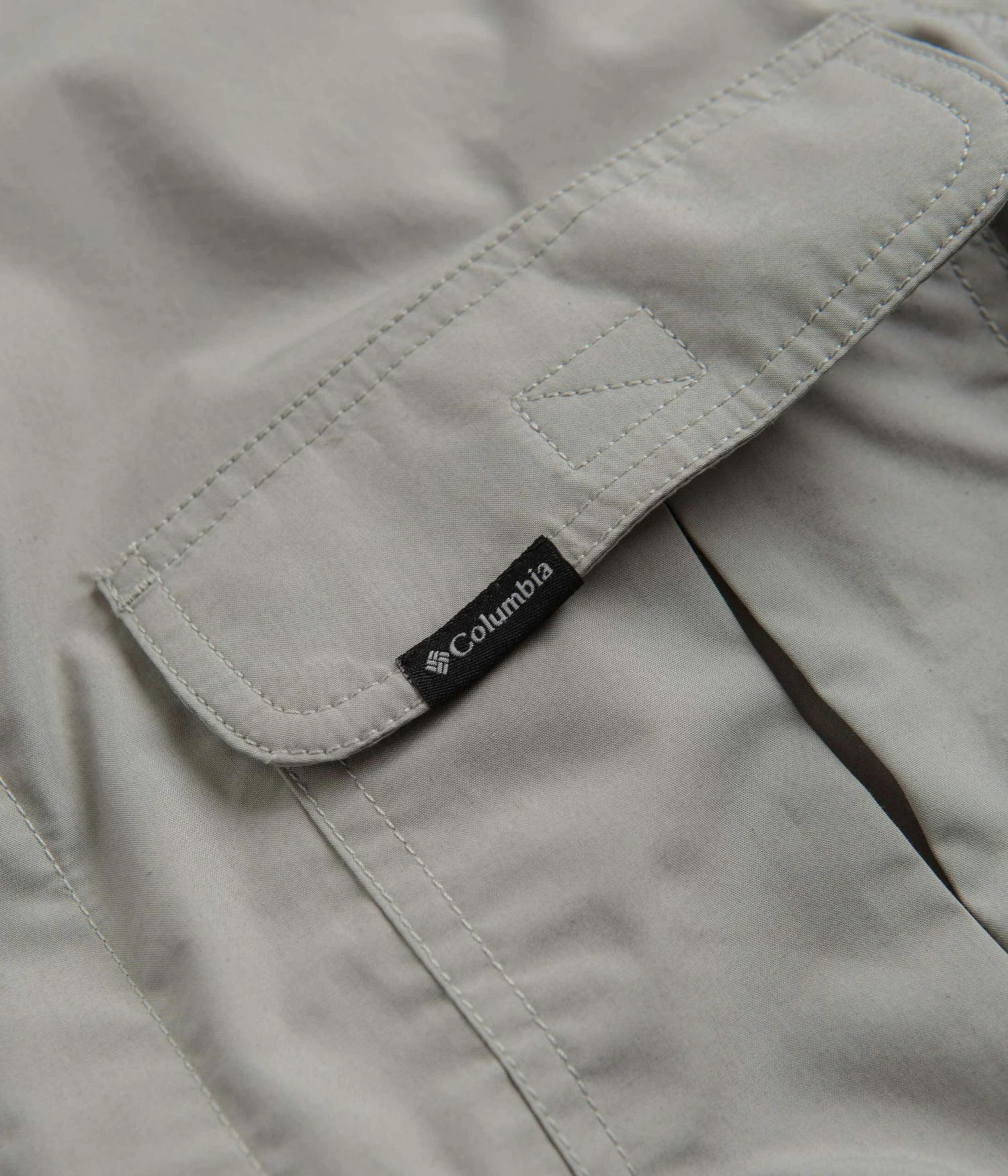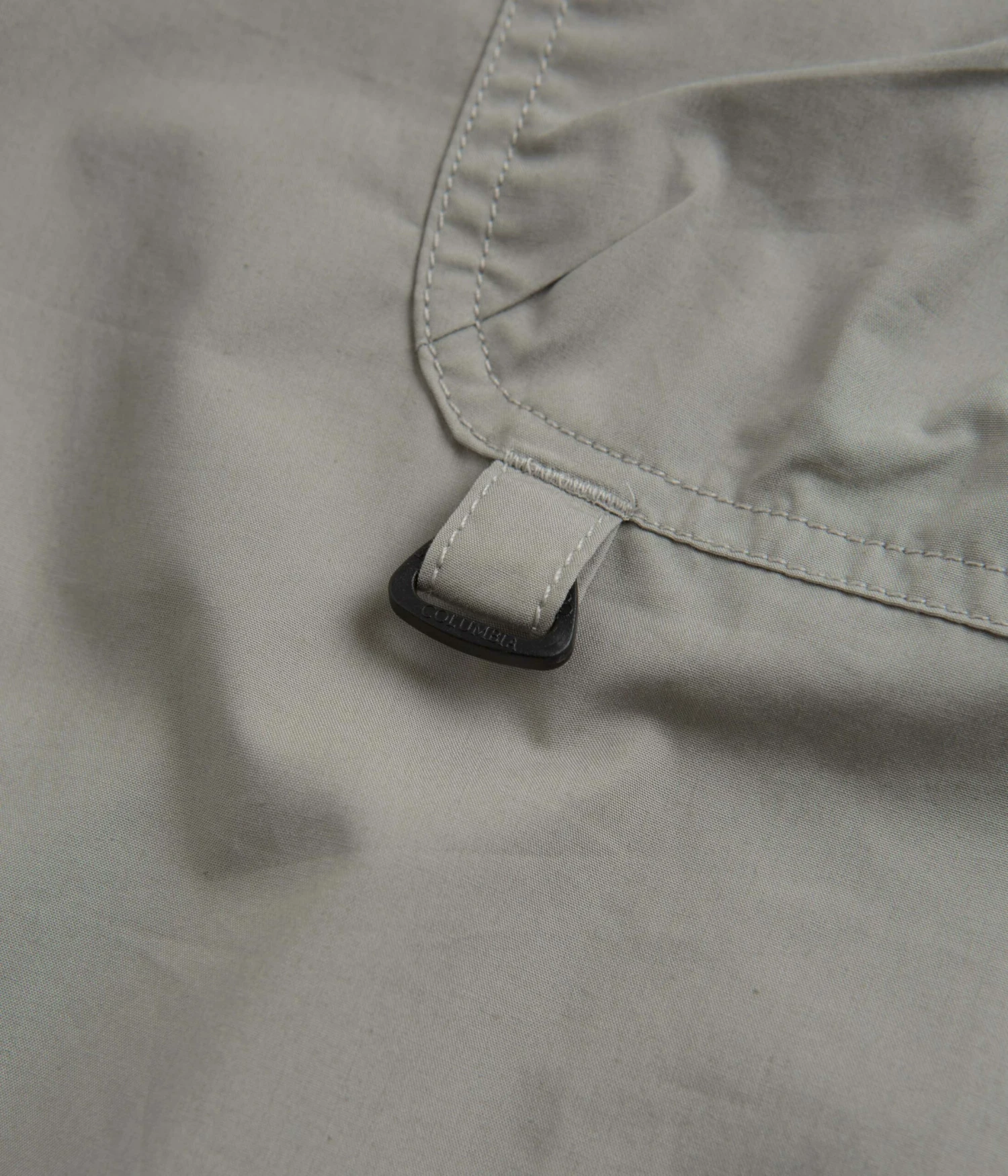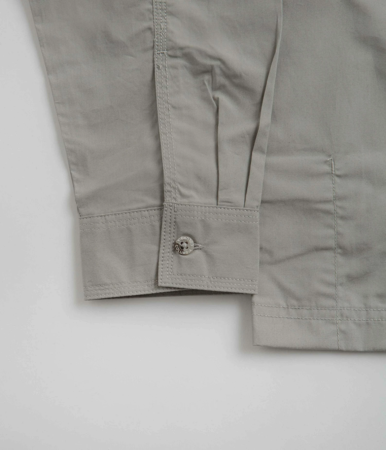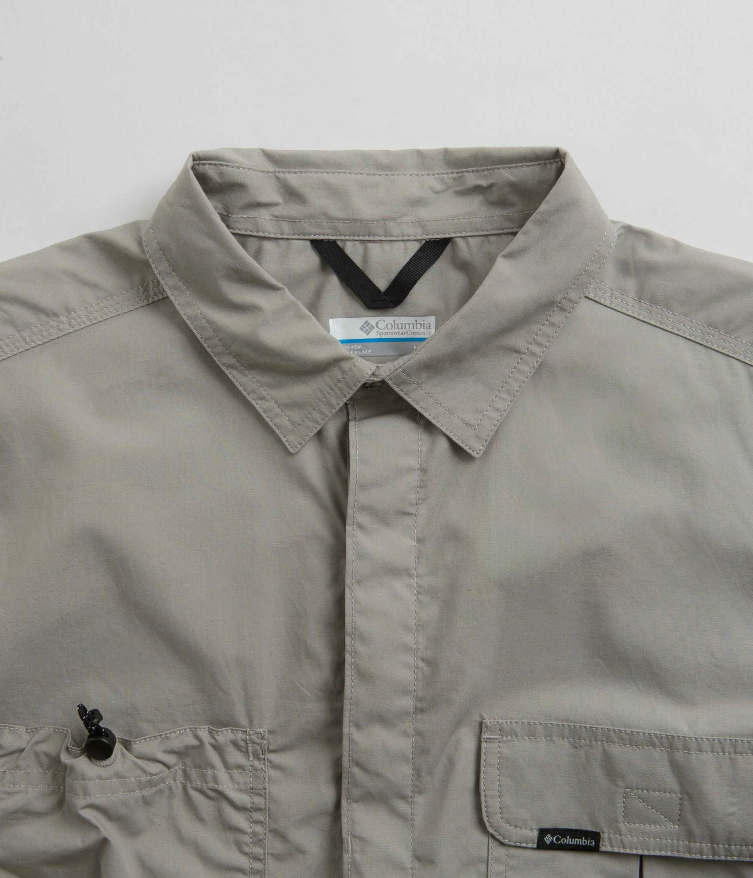 Columbia Landroamer Cargo Shirt in Flint Grey. Utility inspired and made from 100% cotton-poplin, this regular fitting Columbia shirt is lightweight and styled with a full length button fastening. Featuring adjustable cuffs and a reinforced hem, this khaki grey Columbia shirt is finished with two chest pockets, woven flag label detailing and with a D-Ring attachment point.