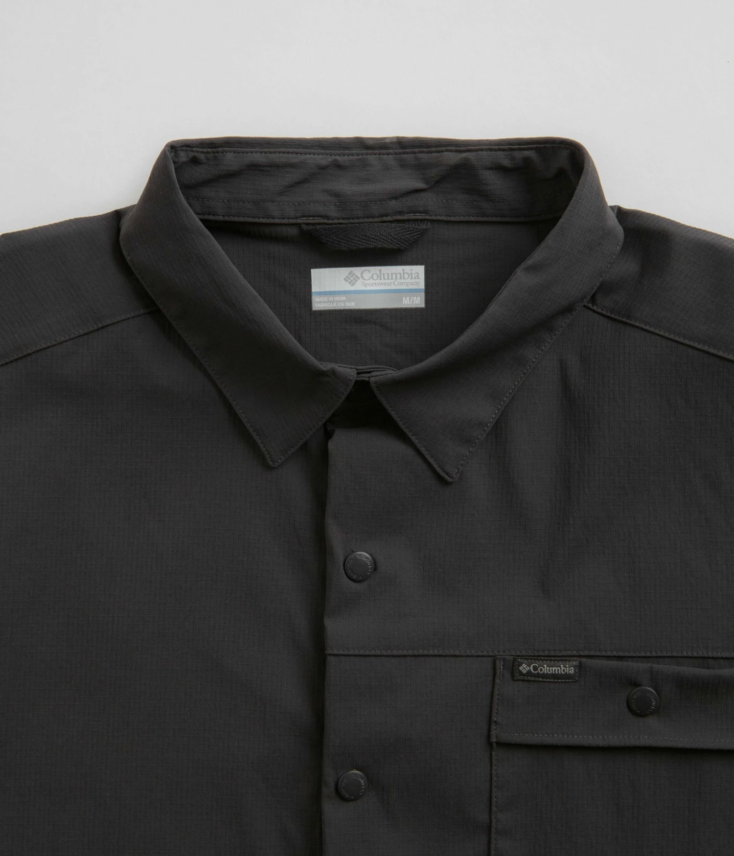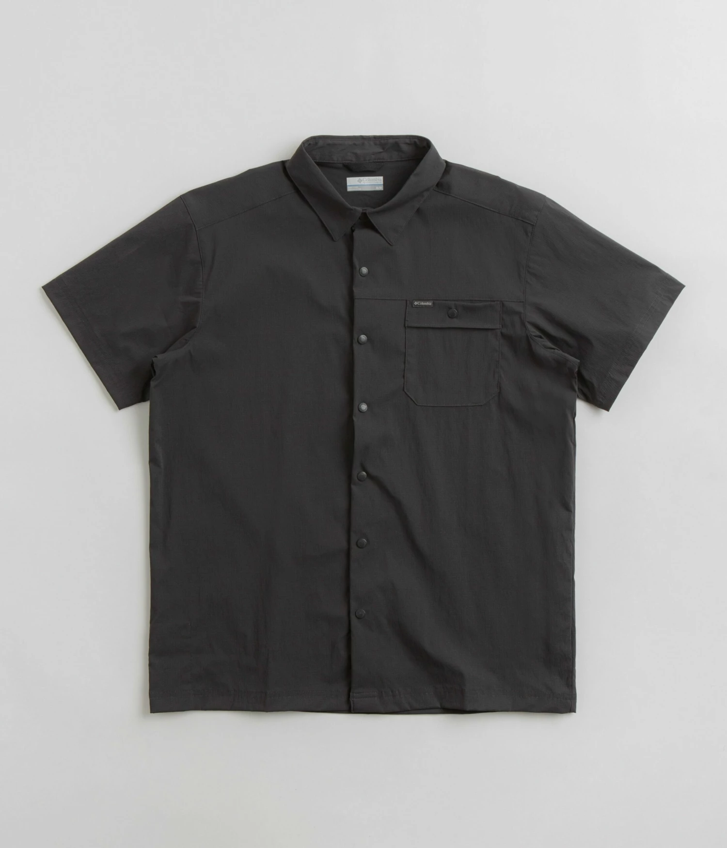 Columbia Landroamer Ripstop Short Sleeve Shirt in Shark. Designed with Omni-Shield™ technology, this regular fitting Columbia shirt is made from a stain and water-resistant fabric blend. Featuring a full length snap placket fastening and a reinforced hem, this grey Columbia shirt is finished with a single chest pocket and with woven flag label branding.