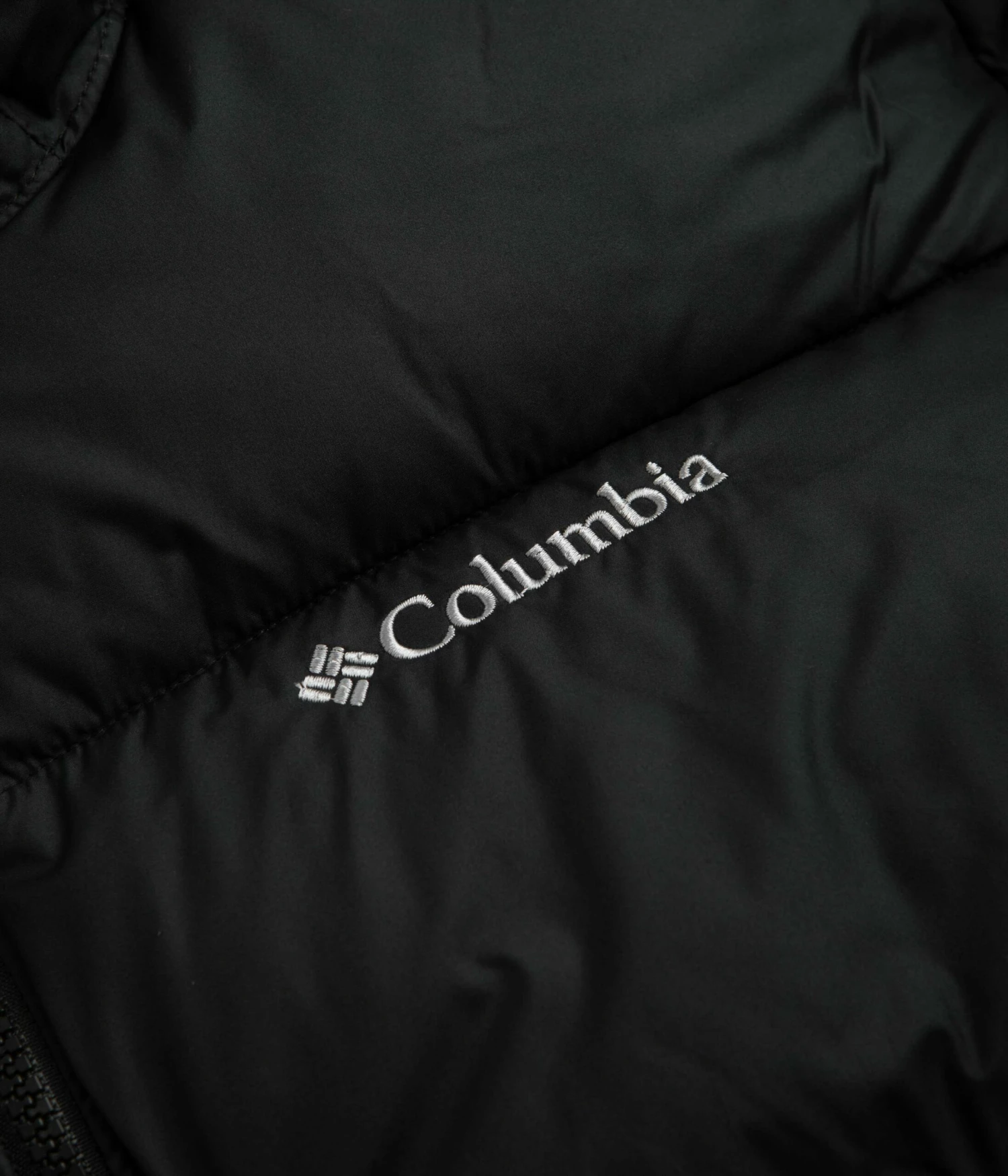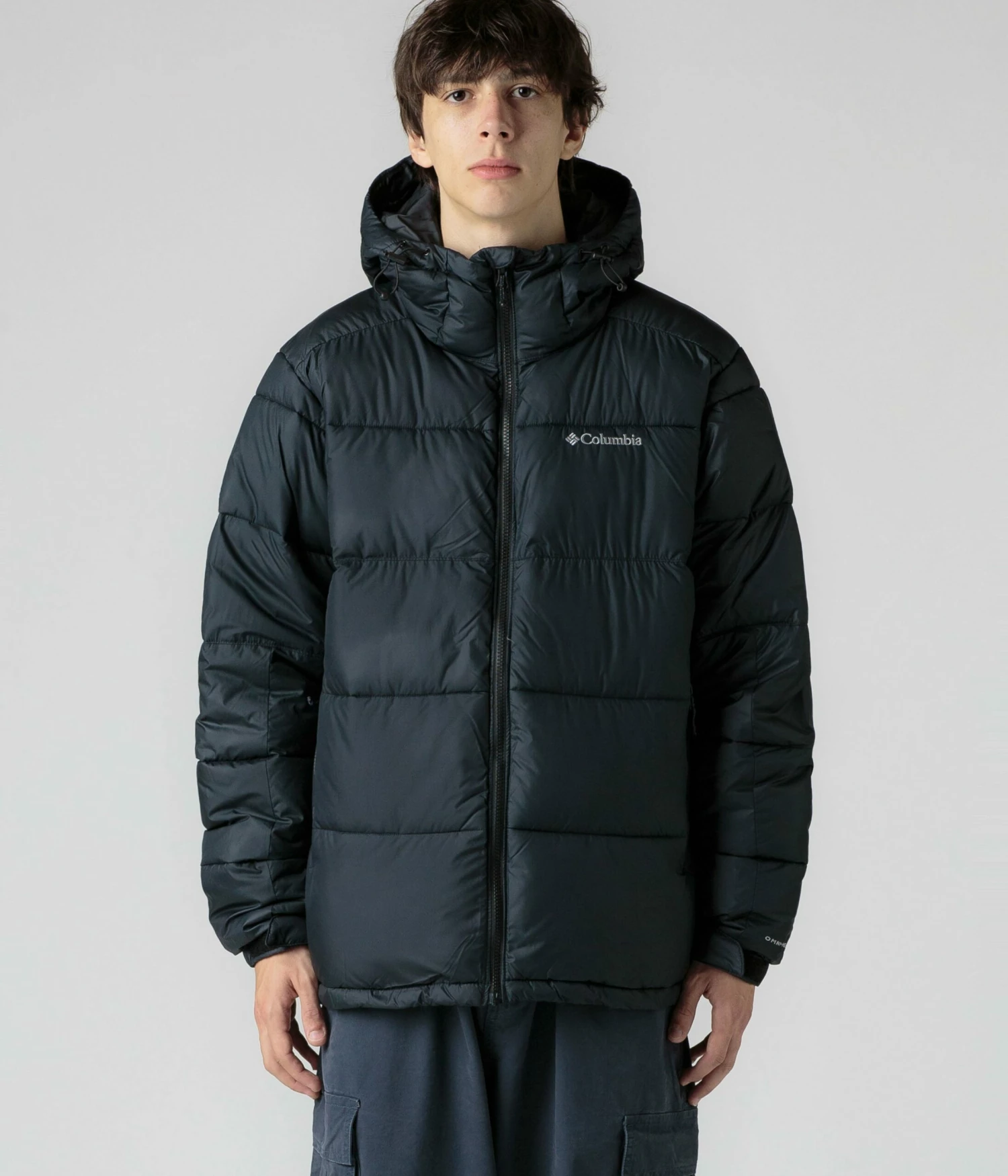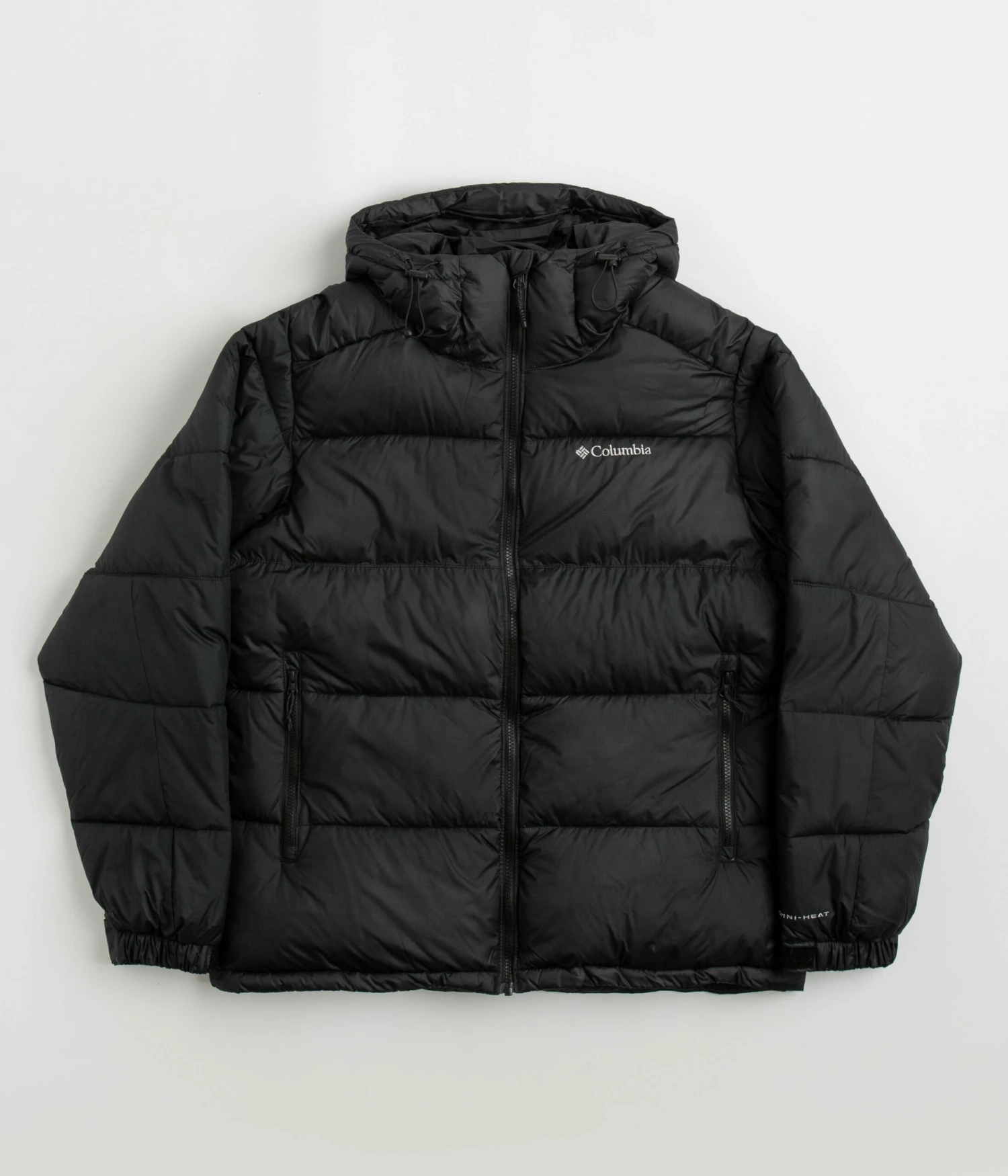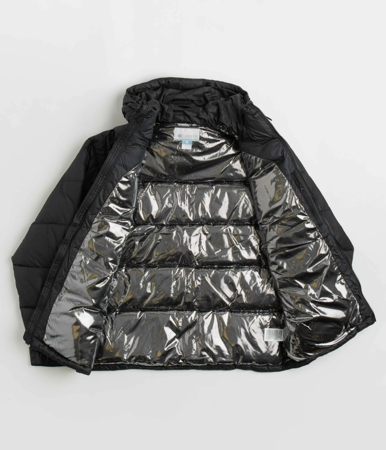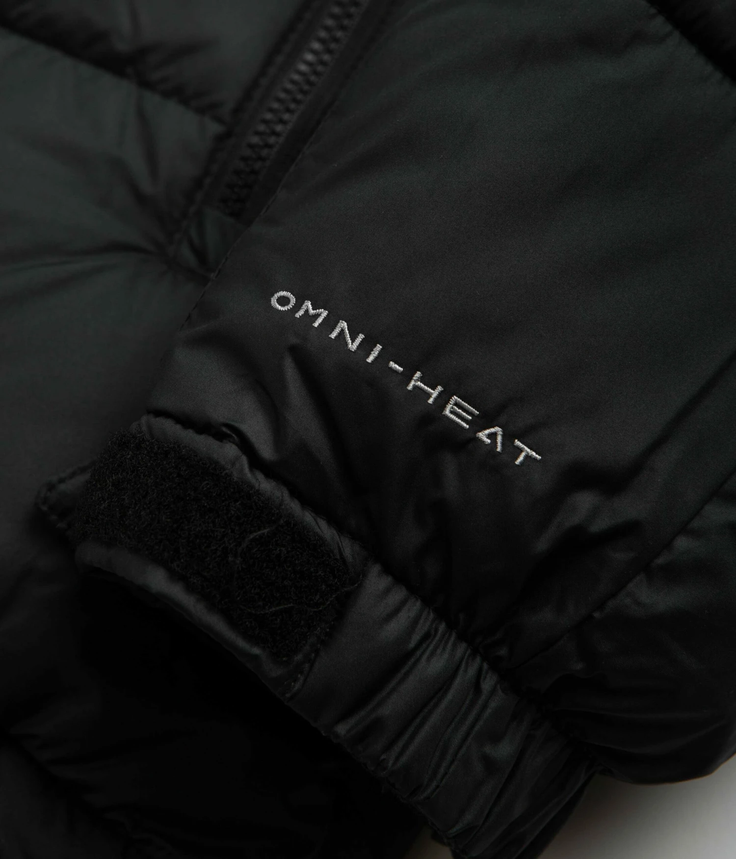 Columbia Pike Lake II Hooded Jacket in Black. Tailored to a regular fitting from 100% recycled polyester, this Columbia jacket is designed with an Omni-Heat™ Reflective lining with recycled polyester insulation. Featuring a full length zipper fastening, a drawstring adjustable hood and an integrated chin guard, this black Columbia jacket is finished with adjustable cuffs, two zippered waist pockets and printed left chest branding.