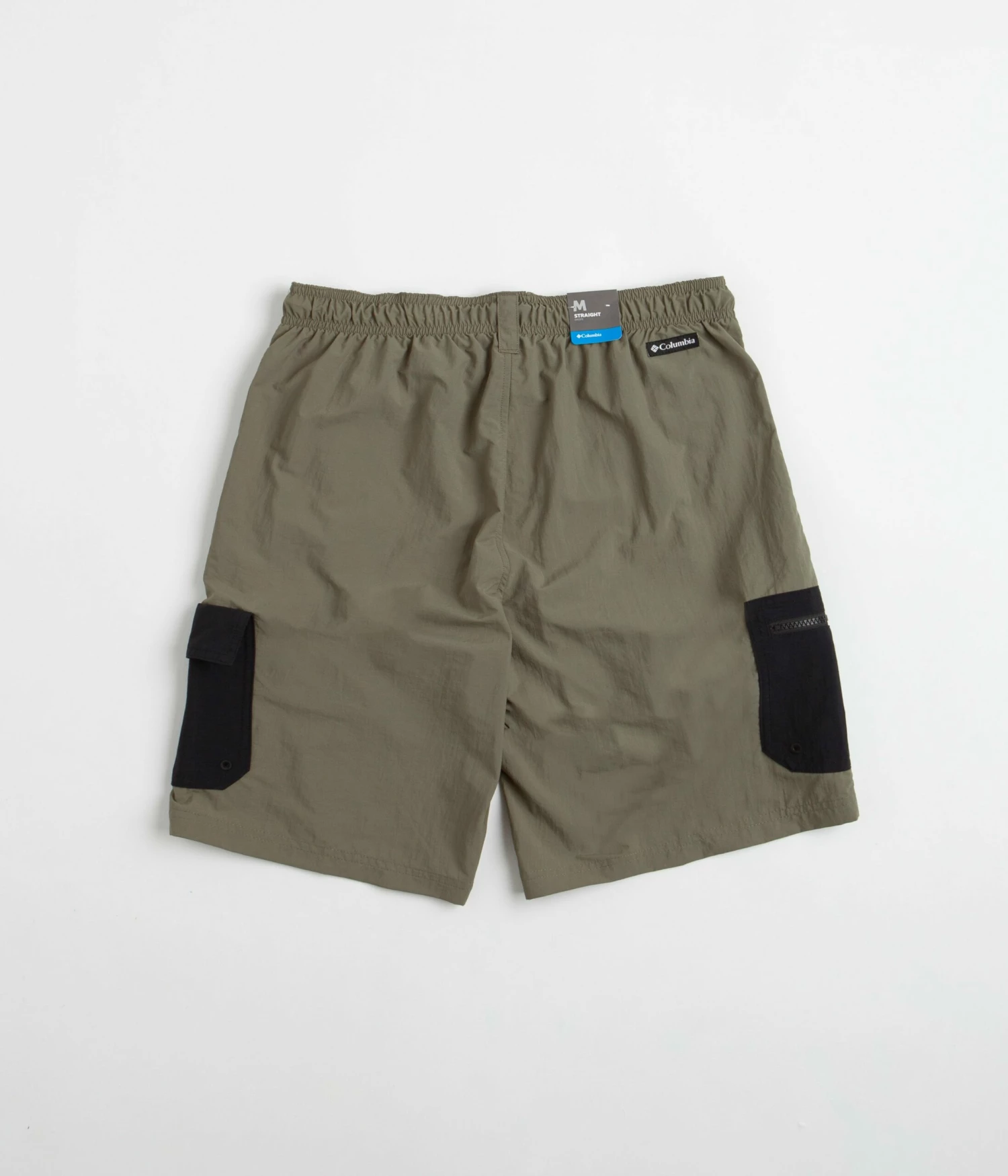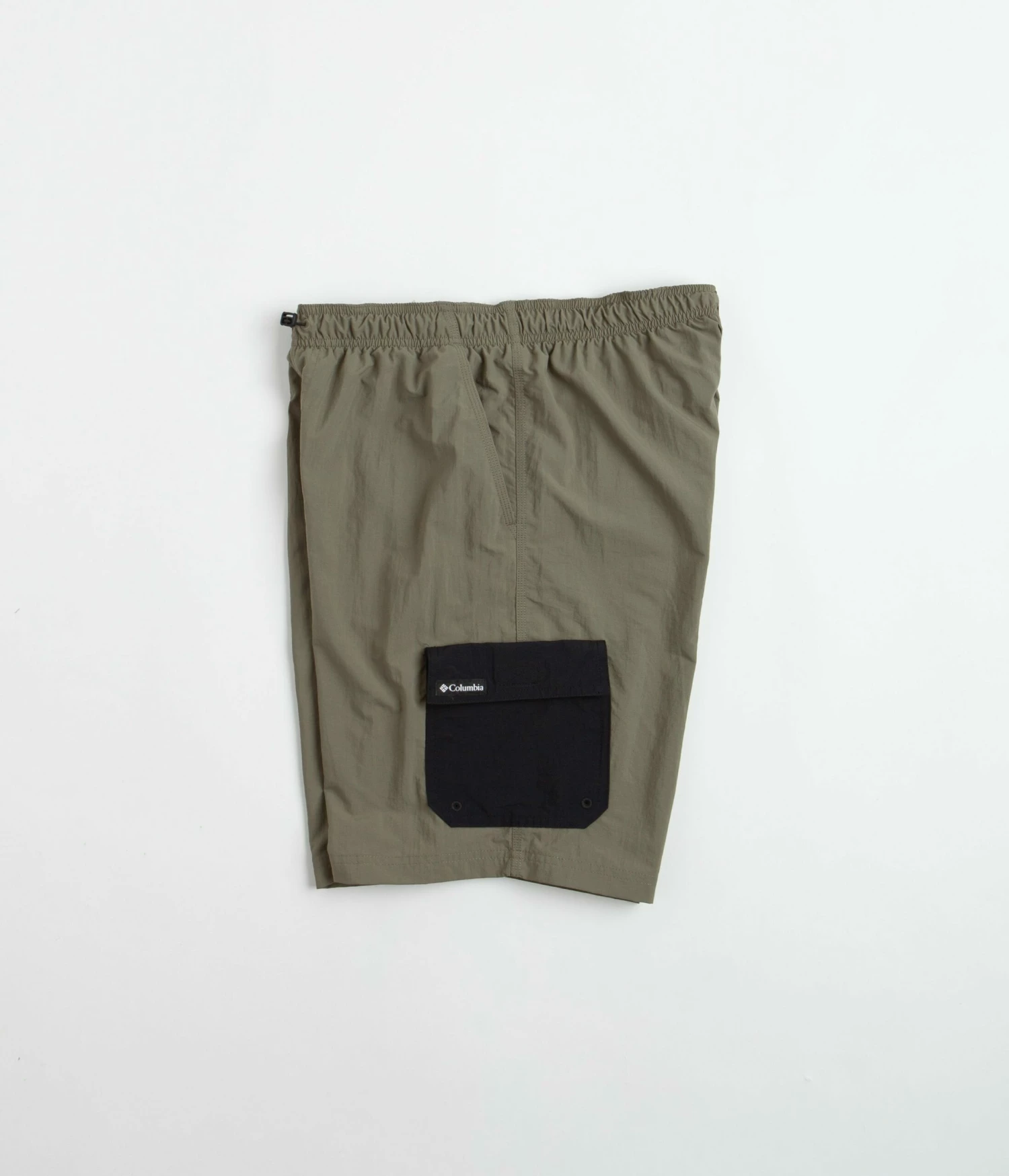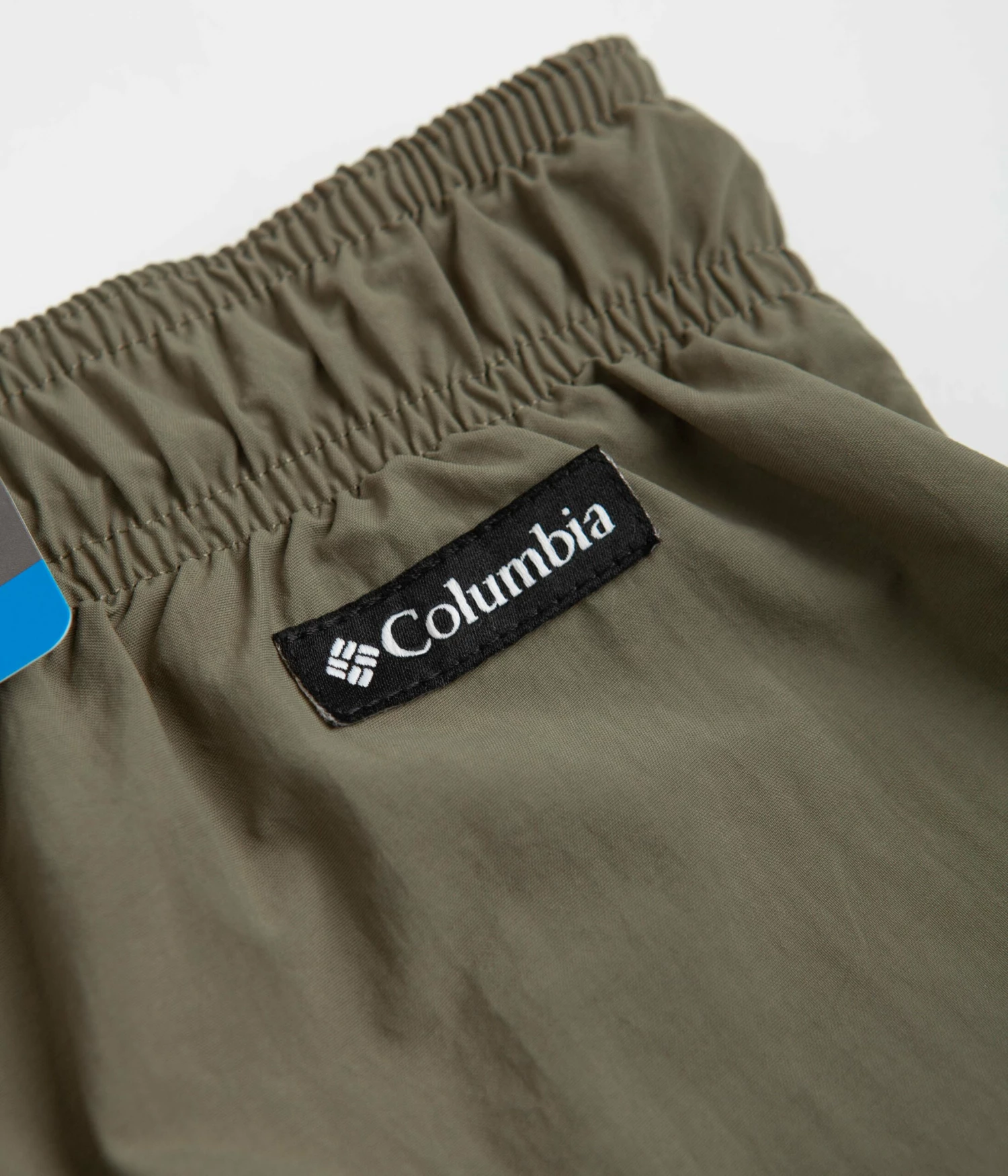 Columbia Summerdry Brief 9″ Shorts in Stone Green. Quick drying and made from 100% nylon, these above-knee Columbia shorts are designed with a 9” inseam and with built-in Omni-Wick™ technology. Featuring internal compression shorts, a toggle cord elasticated waist and tonal stitched seams, these water-repellent green Columbia shorts are finished with two side pockets, zippered security pockets and with woven flag label branding.