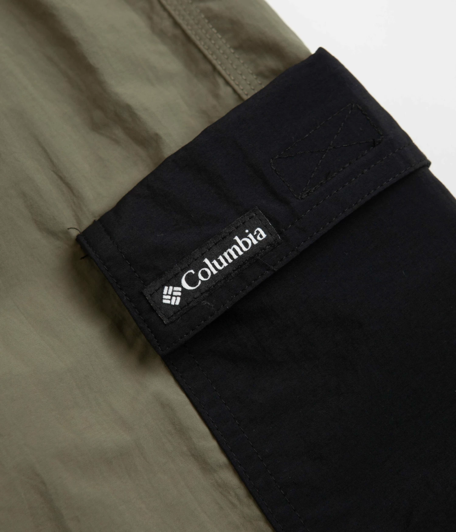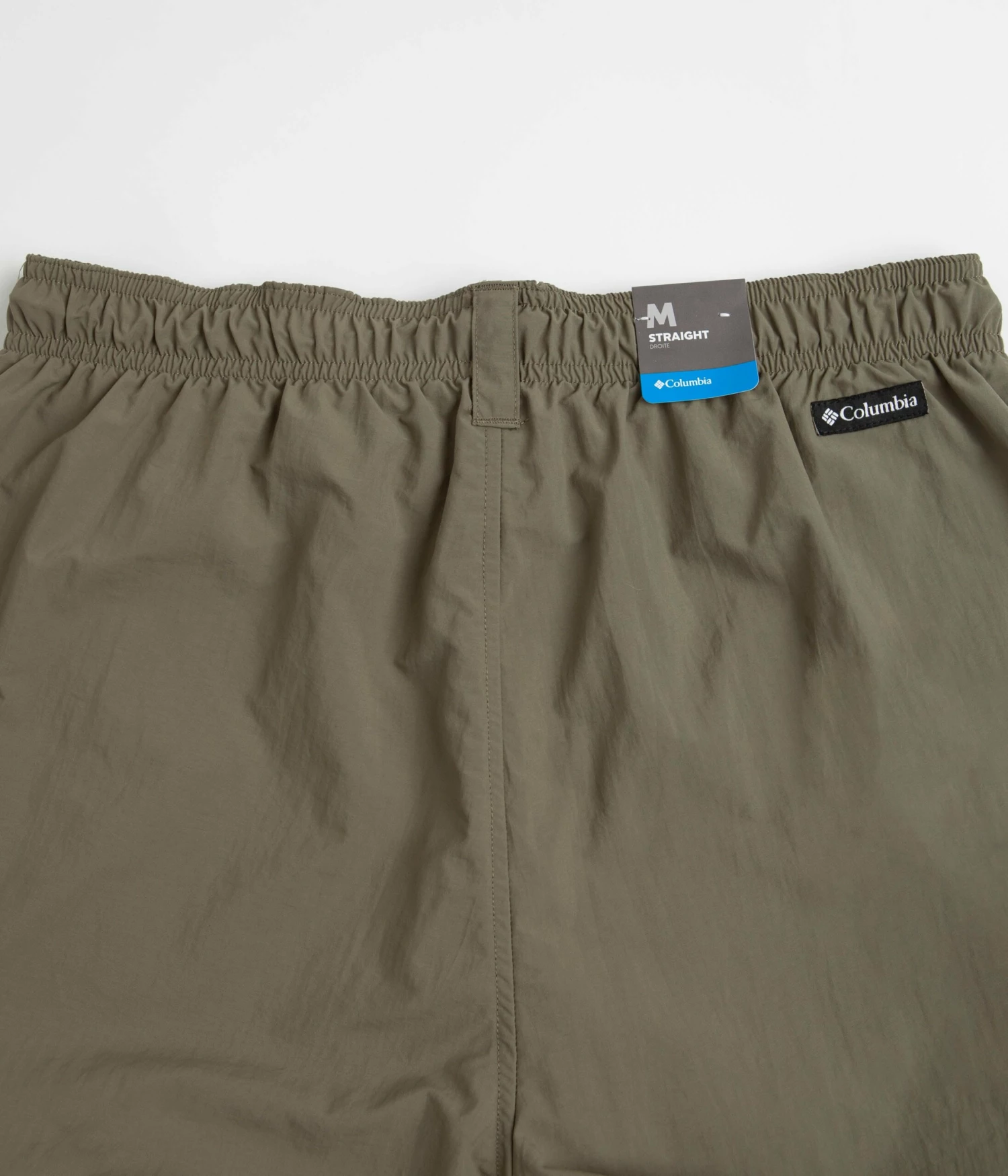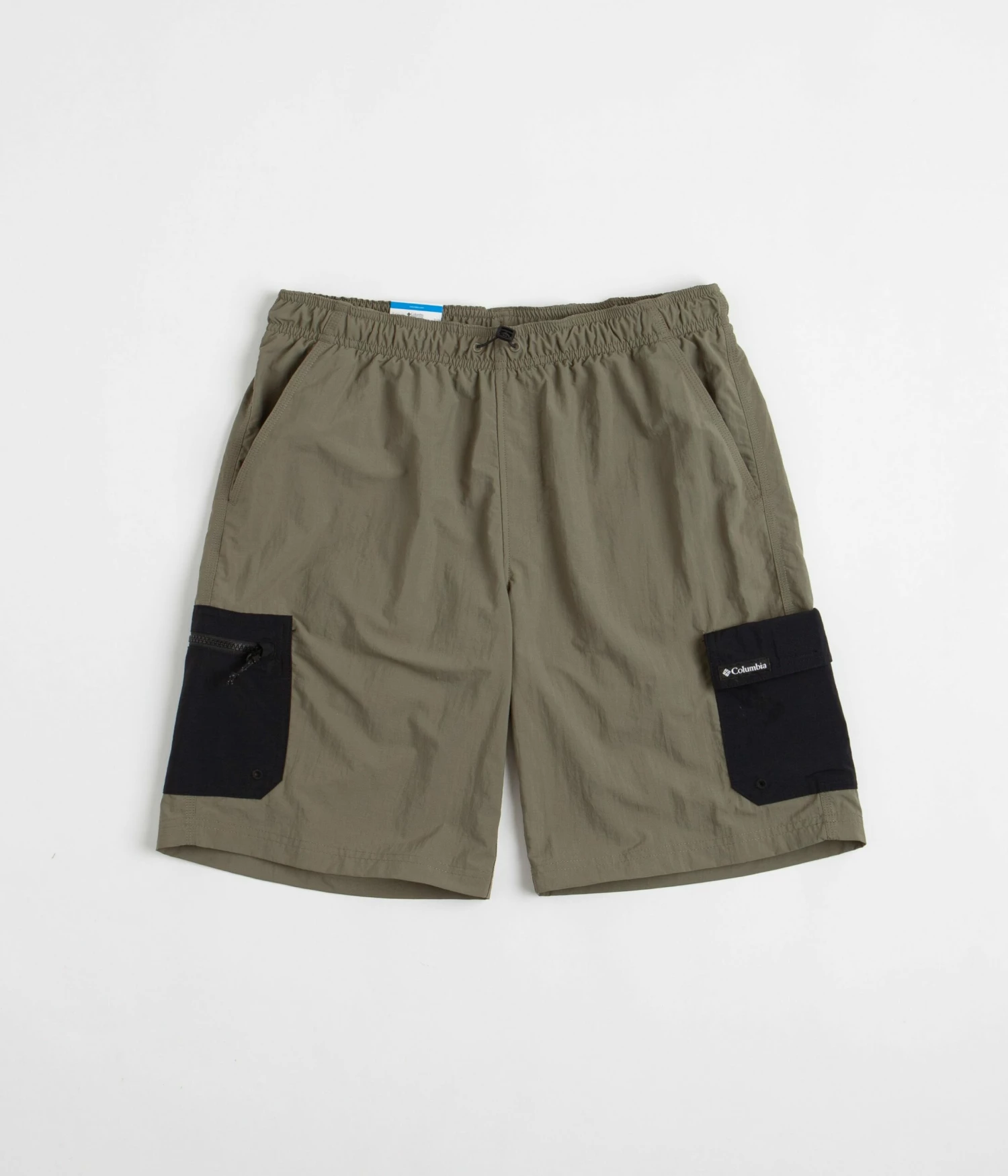 Columbia Summerdry Brief 9″ Shorts in Stone Green. Quick drying and made from 100% nylon, these above-knee Columbia shorts are designed with a 9” inseam and with built-in Omni-Wick™ technology. Featuring internal compression shorts, a toggle cord elasticated waist and tonal stitched seams, these water-repellent green Columbia shorts are finished with two side pockets, zippered security pockets and with woven flag label branding.