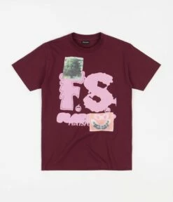 Flatspot Slay T-Shirt in Burgundy. Arriving as part of our exclusive 09.21 collection, this 100% premium cotton Flatspot t-shirt is designed to complement any pre-existing skate or street orientated wardrobe with ease. Tailored to a regular fit for a comfortable day-on-day wear, this brushed burgundy tee features a reinforced hemline, casual crew collar neckline and tonal stitched seams for additional structural support. Signed off with pastel pink ‘FS Flatspot’ bubble font scripture printed across the chest, whilst two blurred photo illustrative prints are laid overtop.