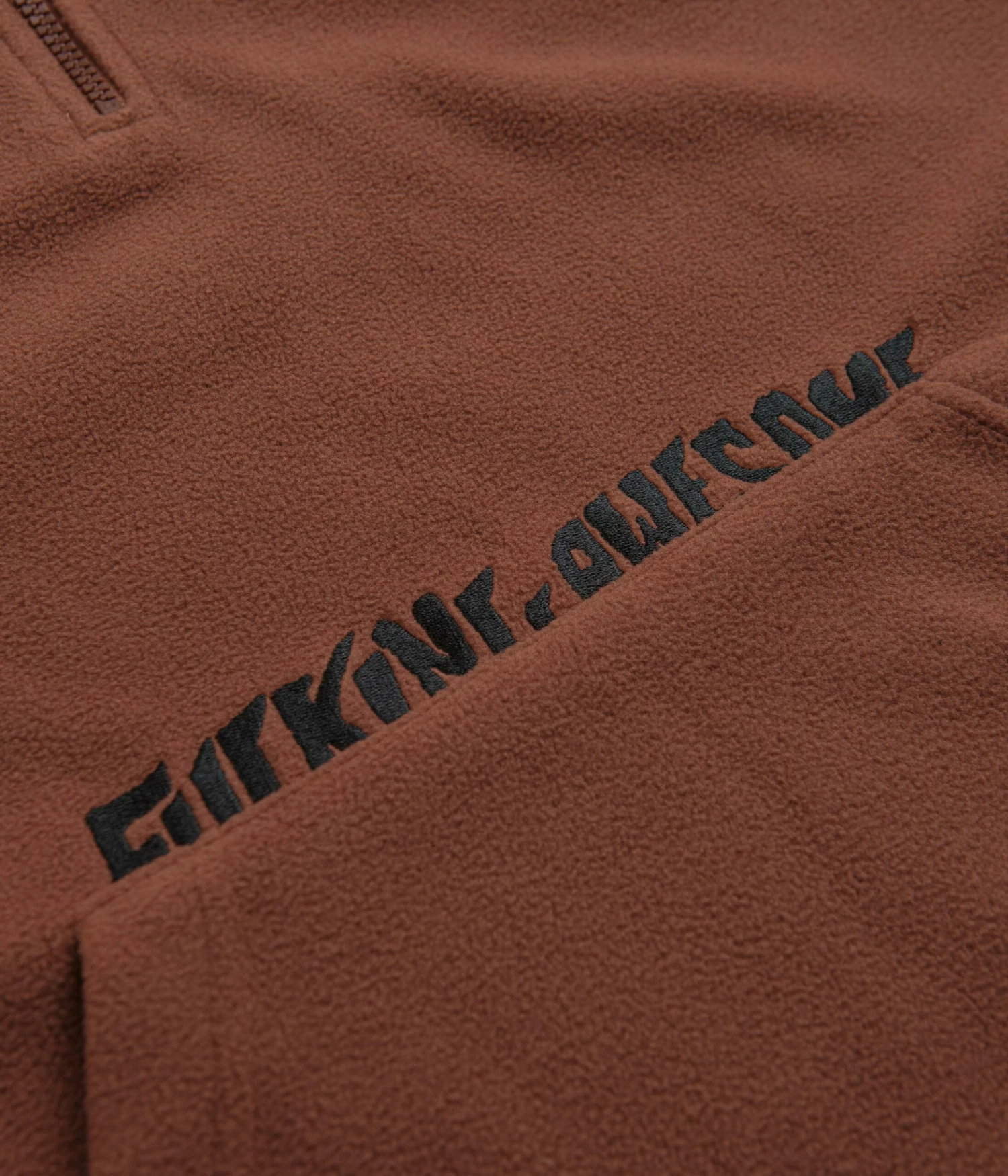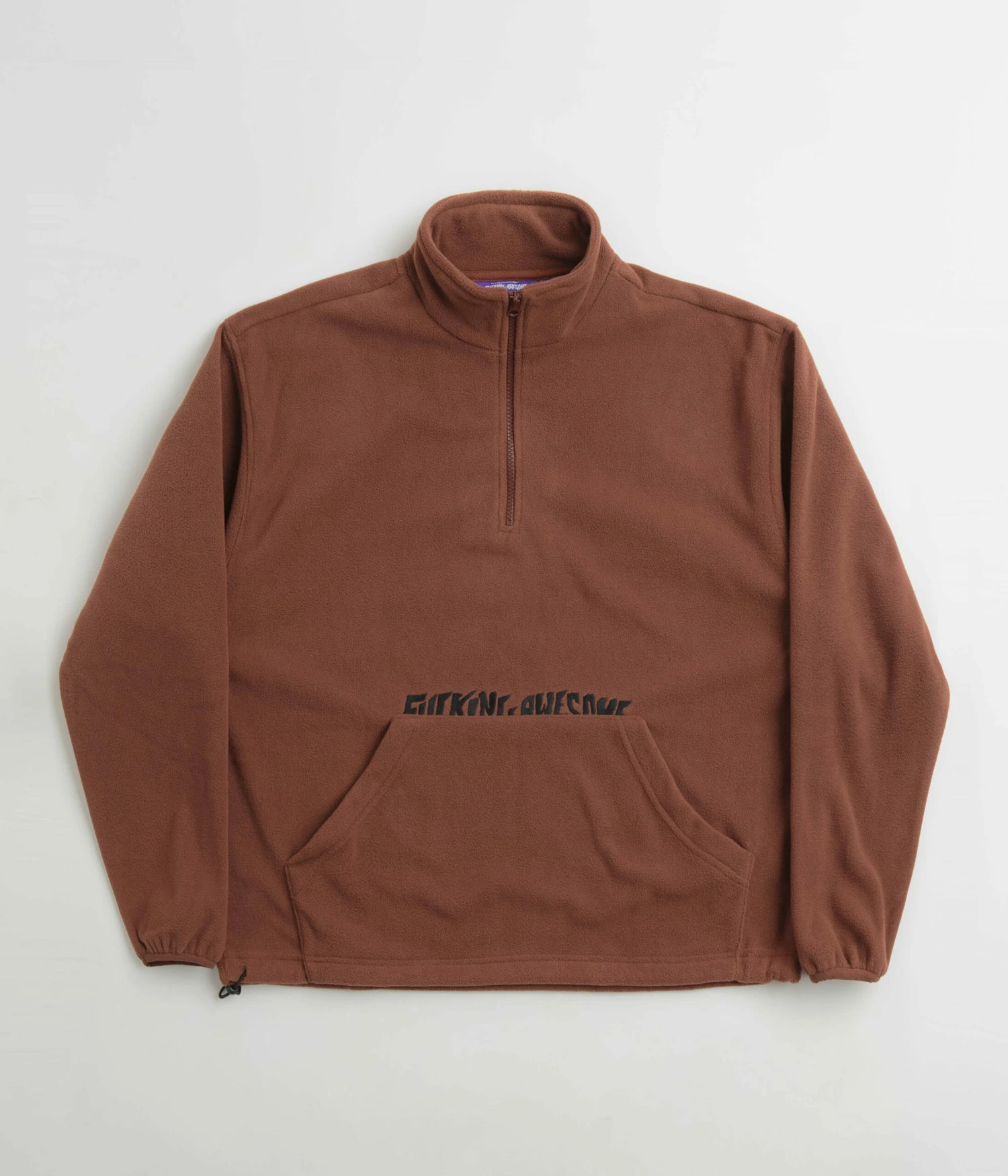 Fucking Awesome Cut Off 1/4 Zip Polar Fleece in Brown. Designed with a lock-cord hem and elasticated cuffs, this Fucking Awesome fleece is made from 100% cotton Polar fleece with a classic quarter-length YKK zipper fastening. Featuring lycra binding and elasticated cuffs, this brown Fucking Awesome fleece is finished with an oversized kangaroo pocket and with embroidered logo branding.