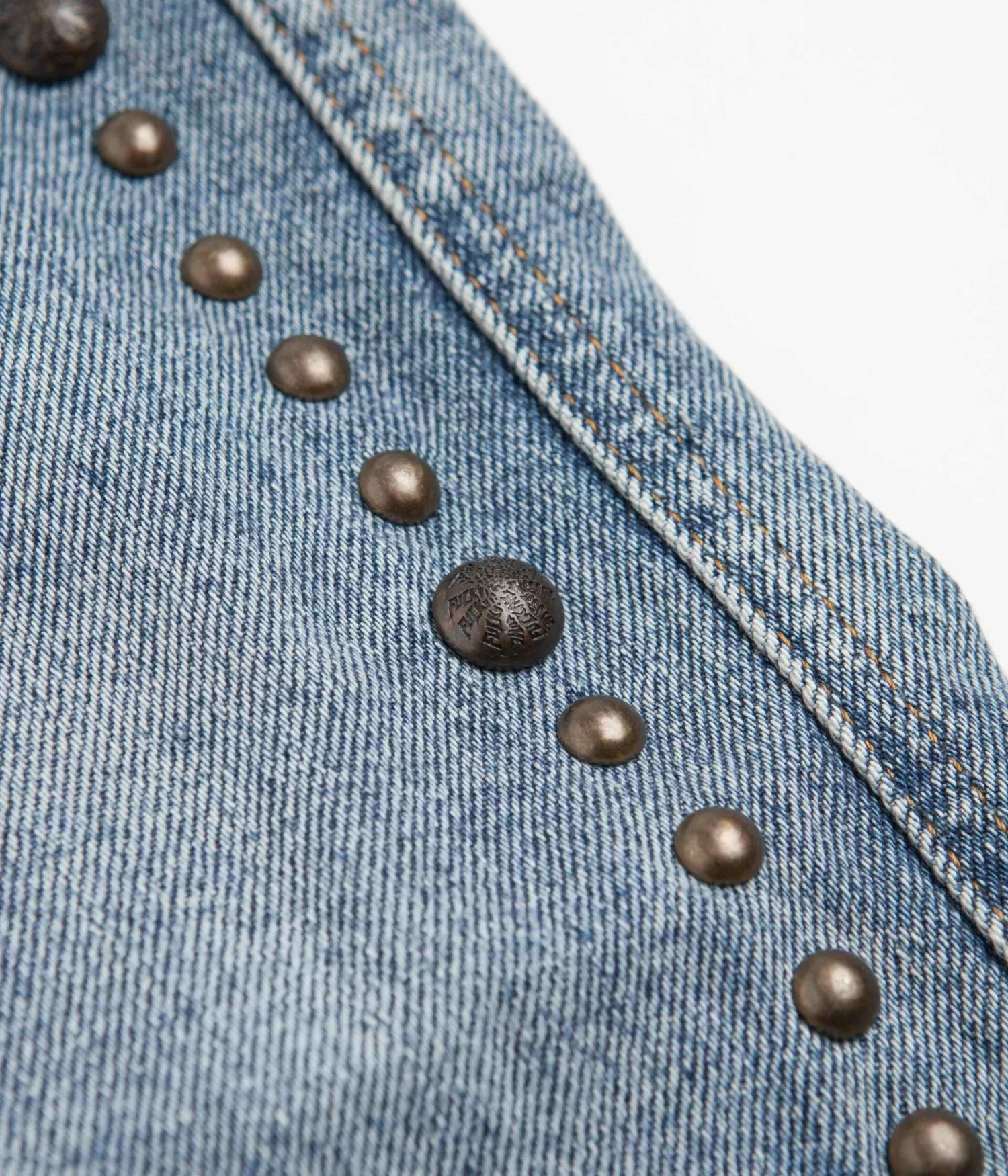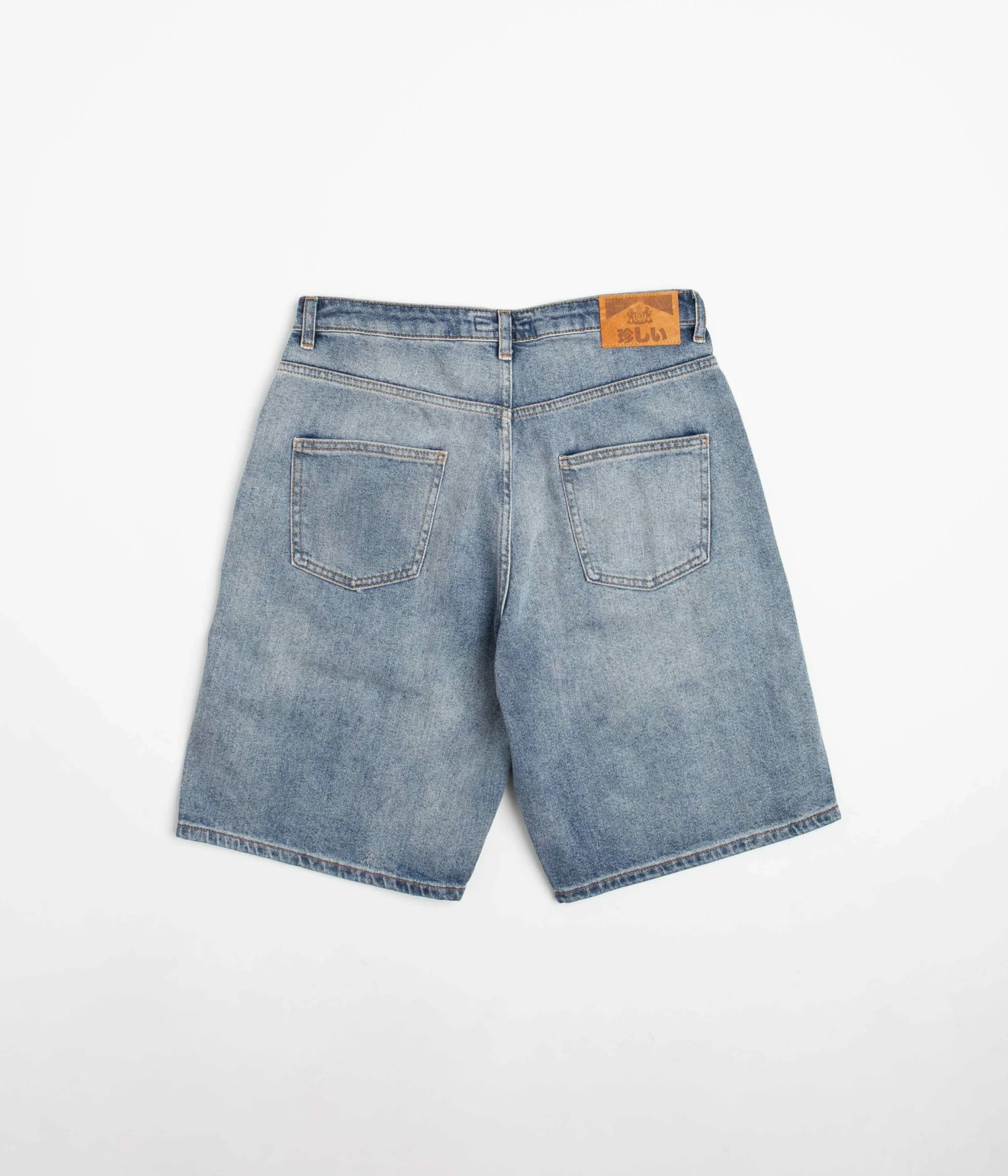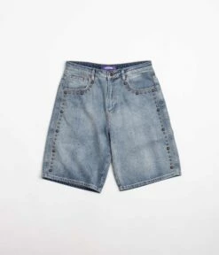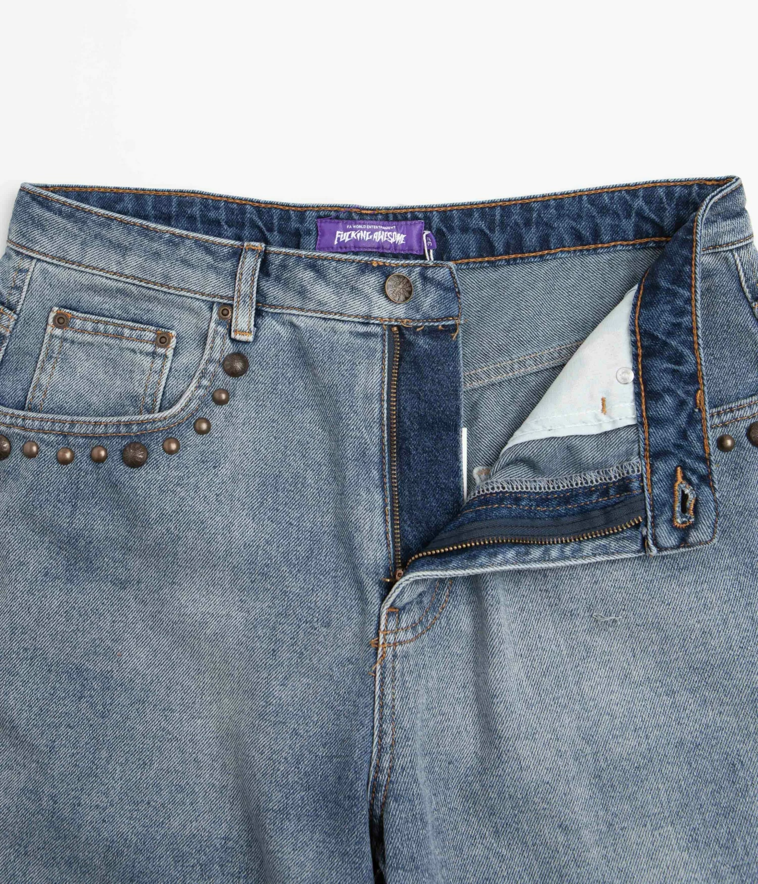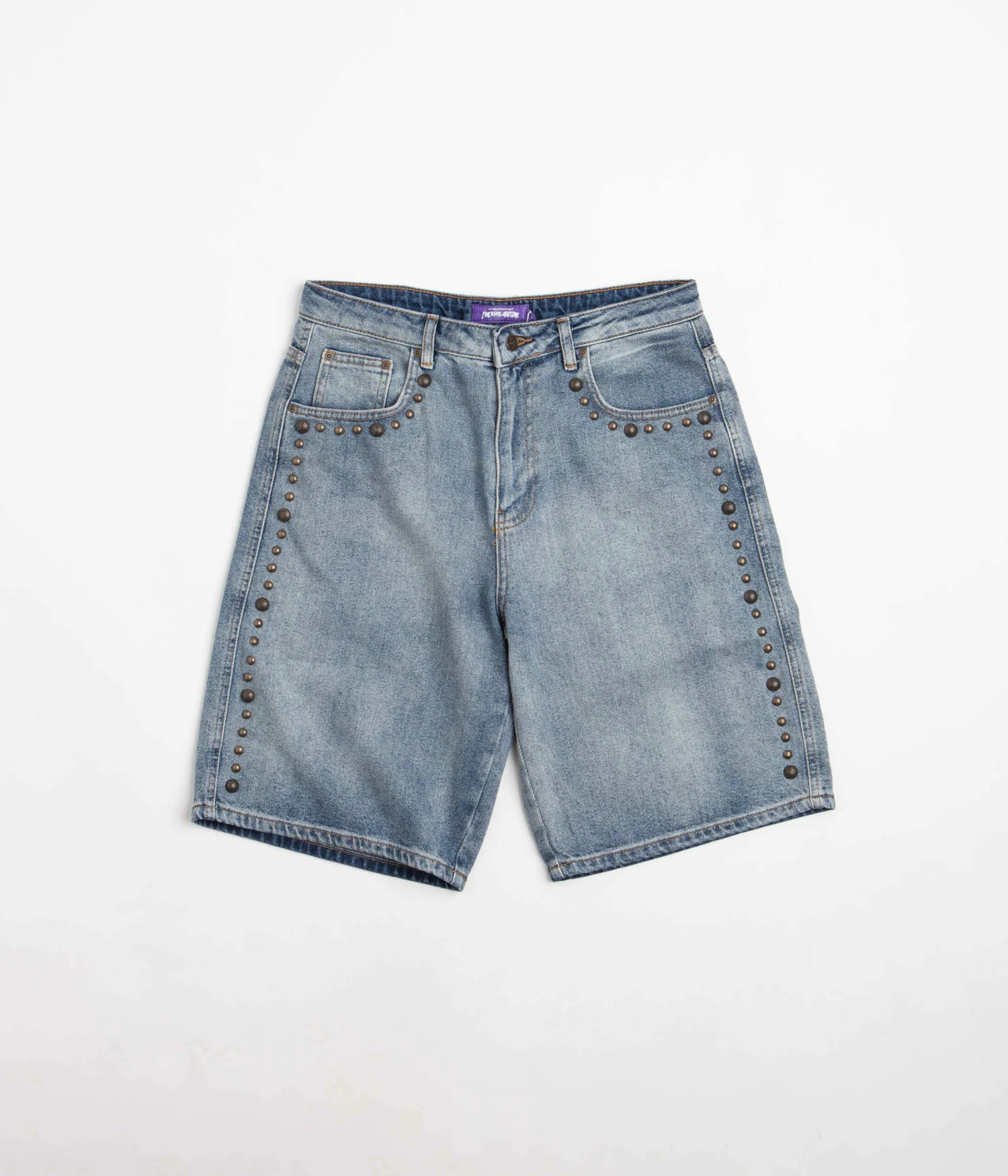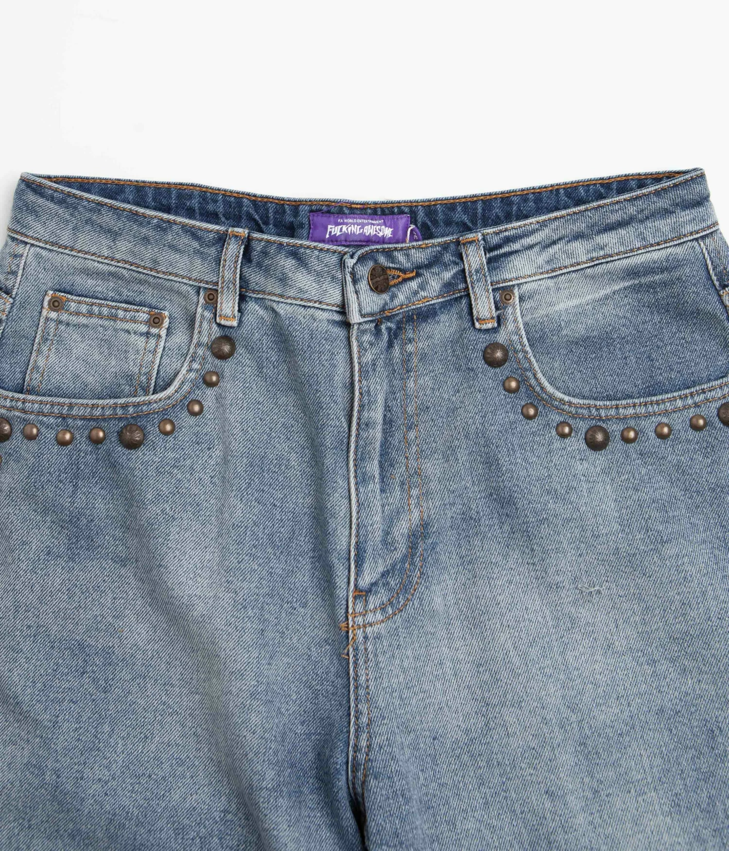 Fucking Awesome Riveting Shorts in Blue. Tailored to a baggy fitting from 100% cotton denim, these knee-length Fucking Awesome shorts are designed with branded stud detailing. Featuring a classic belt loop waistband, a single button secured zipper fly and contrast stitching, these blue Fucking Awesome shorts are finished with four classic pockets, a single coin pocket and with a woven belt patch sewn across the rear.