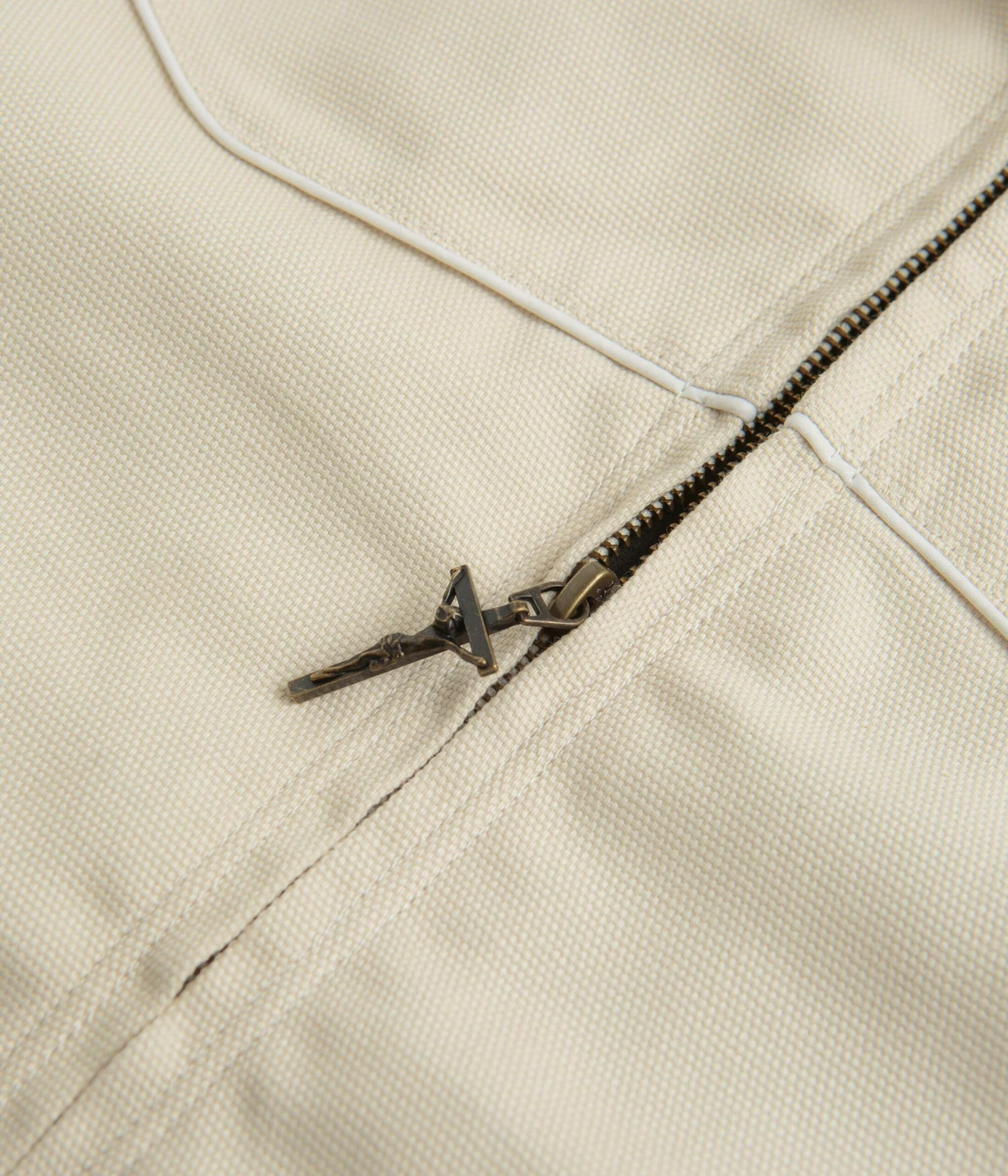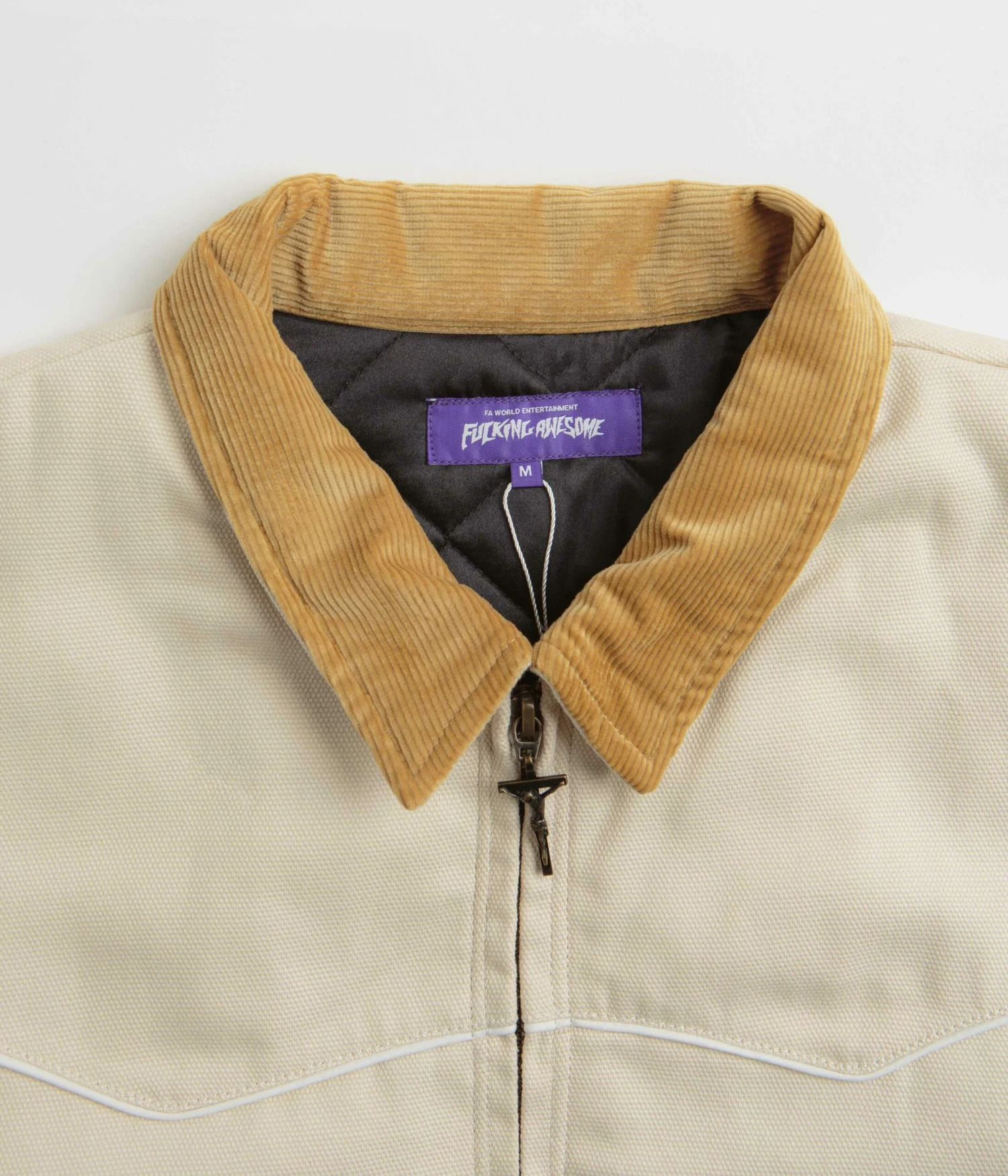 Fucking Awesome Western Work Jacket in Creme. Workwear inspired and tailored to a regular fitting from 100% cotton canvas, this Fucking Awesome jacket is designed with an all-over print lining and a contrast corduroy collar. Featuring a full length zipper fastening, adjustable cuffs and an adjustable hem, this beige Fucking Awesome jacket is finished with two waist pockets, a hidden inner pocket, exposed yoke detailing, embroidered rear branding and with a woven rear hem label.