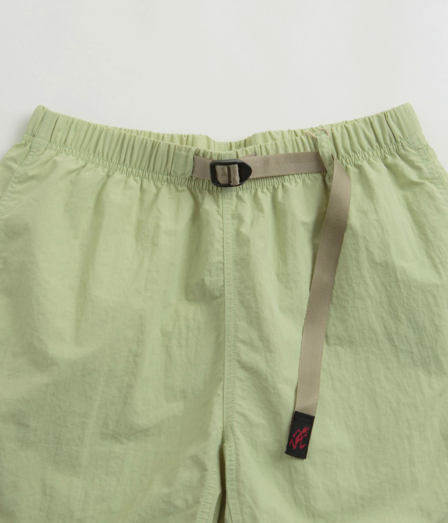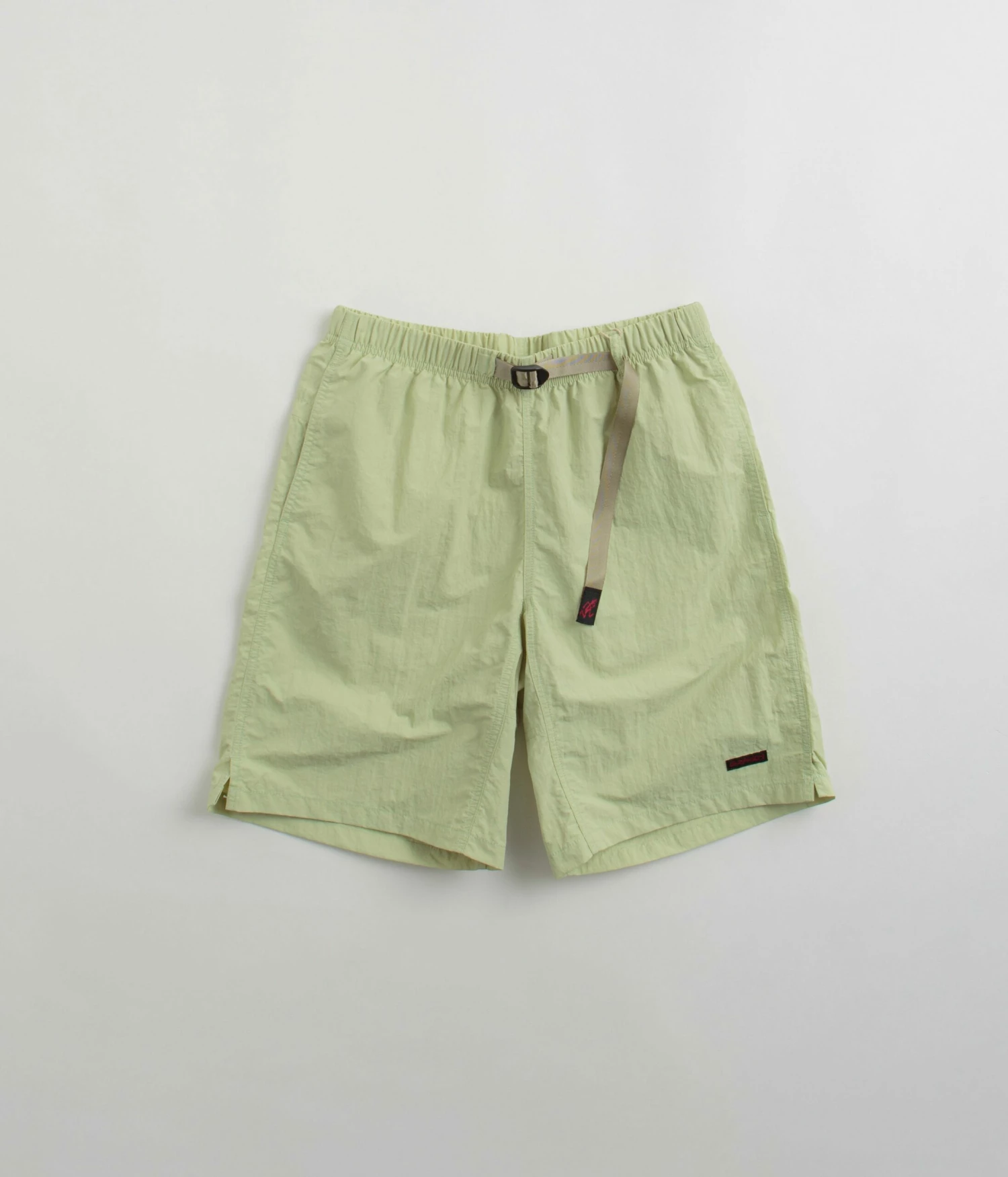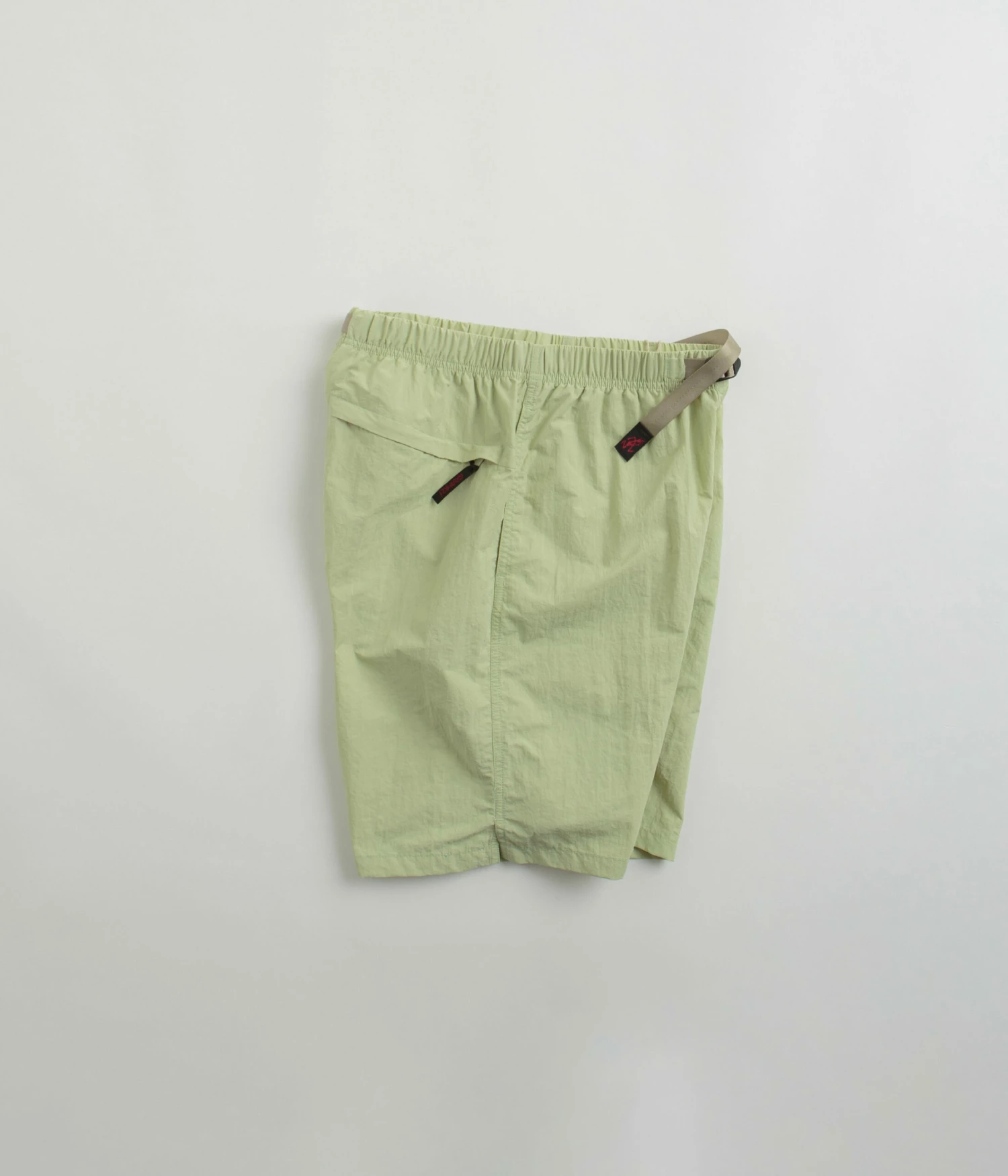 Gramicci Nylon Packable G-Shorts in Lime. Tailored to a unisex fitting from 100% nylon, these packable Gramicci shorts are designed with a woven elastic waist and an integrated webbing belt. Water-repellent and wind-resistant, these lime green Gramicci shorts are finished with two side pockets, two rear pockets and with woven flag label branding.