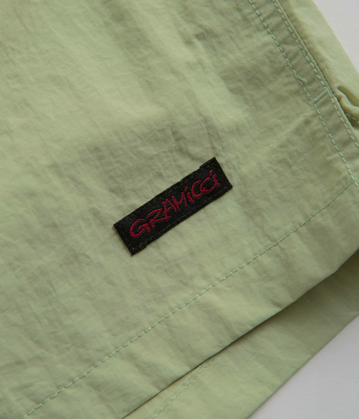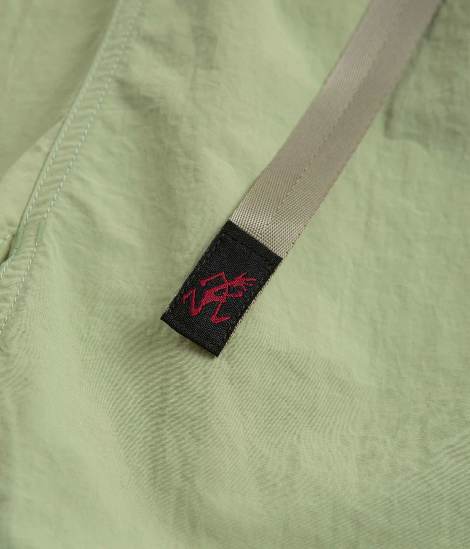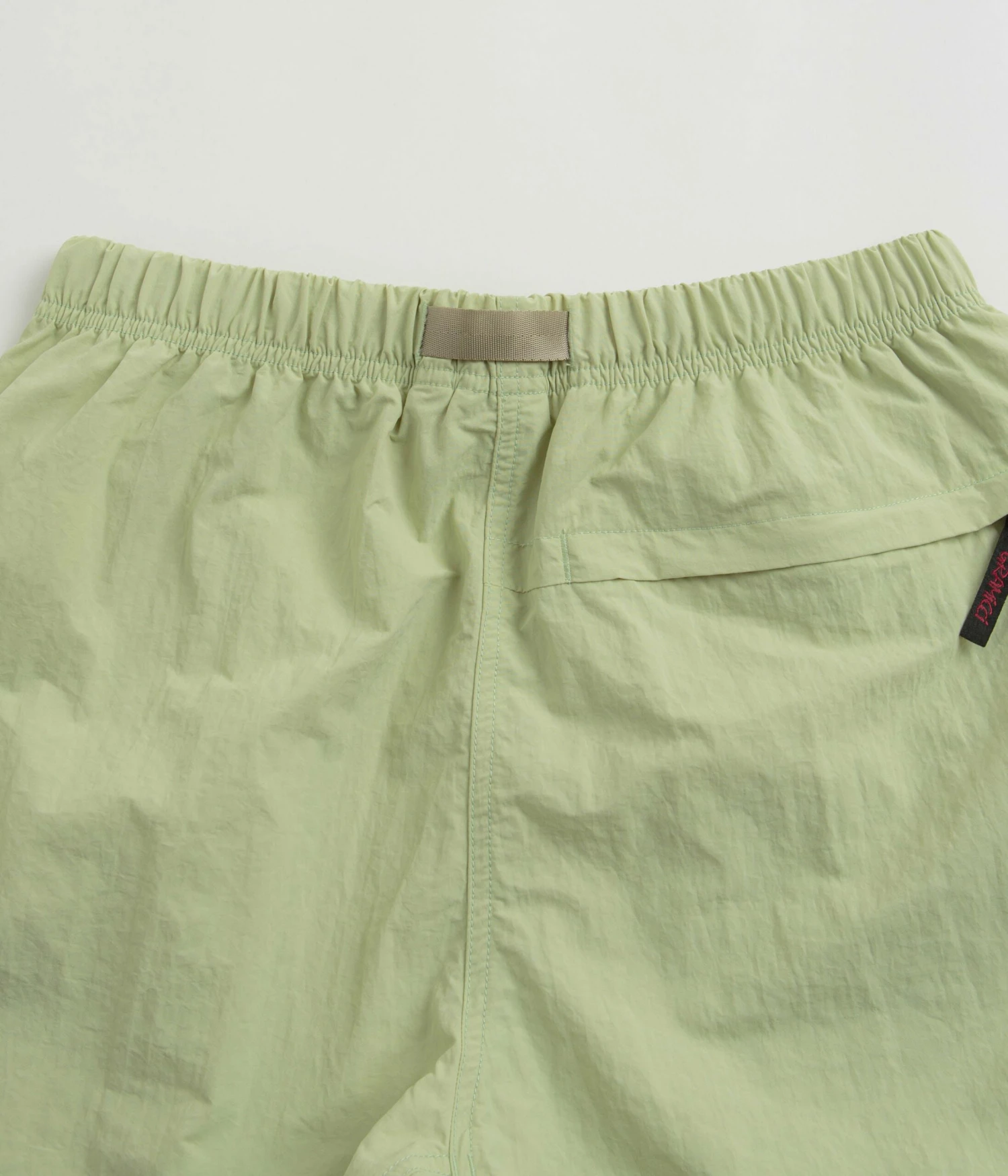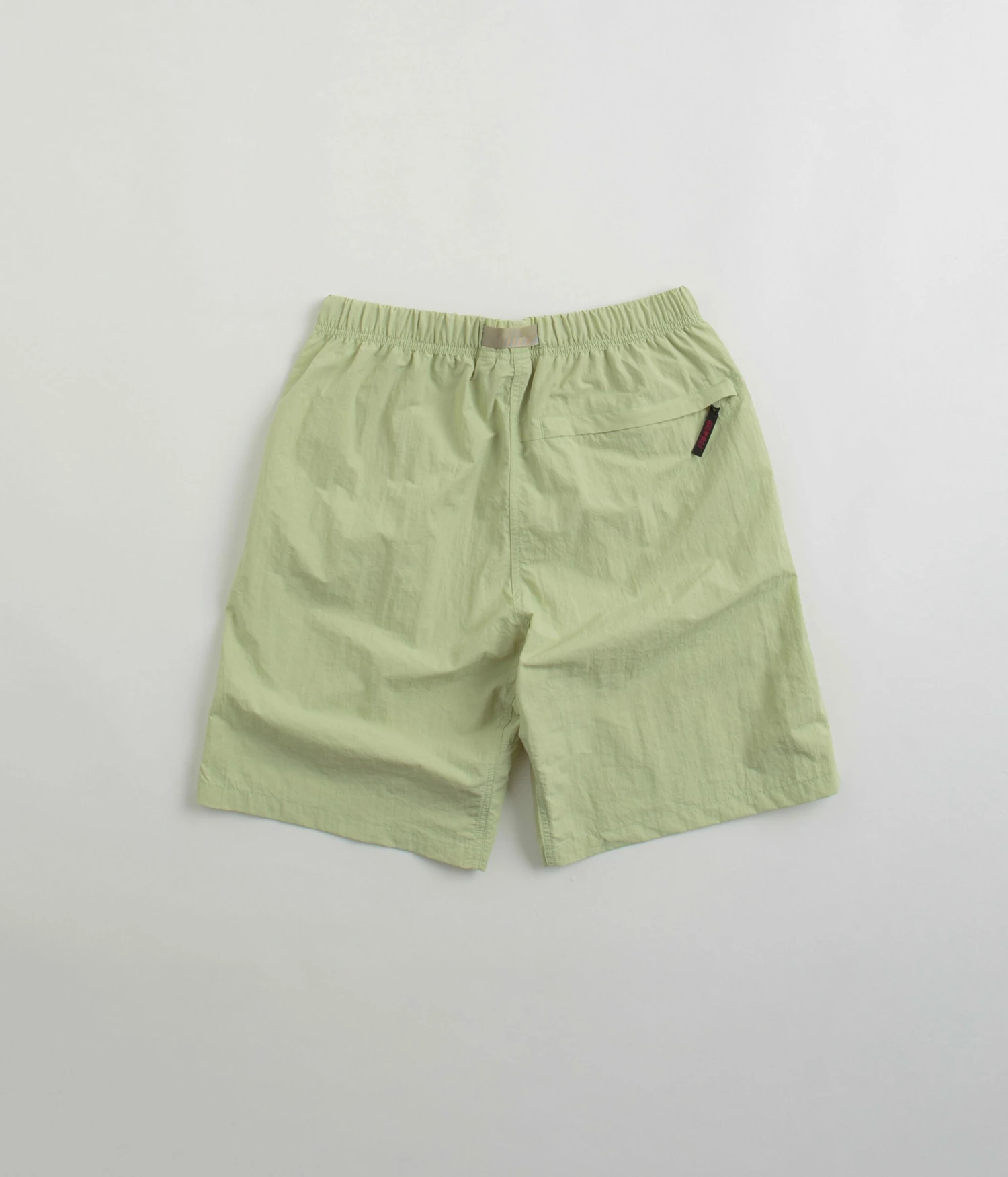 Gramicci Nylon Packable G-Shorts in Lime. Tailored to a unisex fitting from 100% nylon, these packable Gramicci shorts are designed with a woven elastic waist and an integrated webbing belt. Water-repellent and wind-resistant, these lime green Gramicci shorts are finished with two side pockets, two rear pockets and with woven flag label branding.