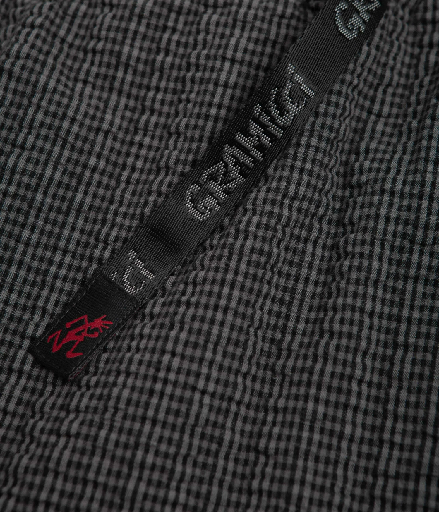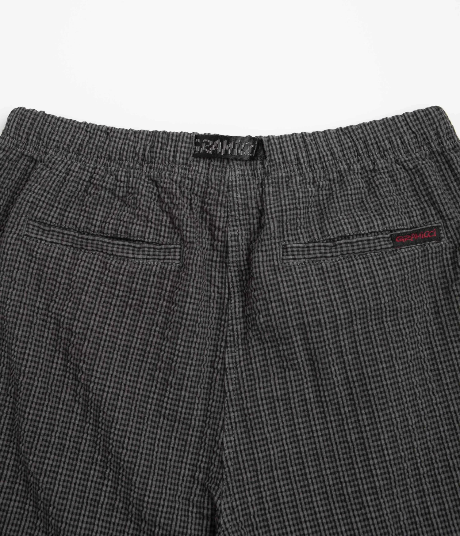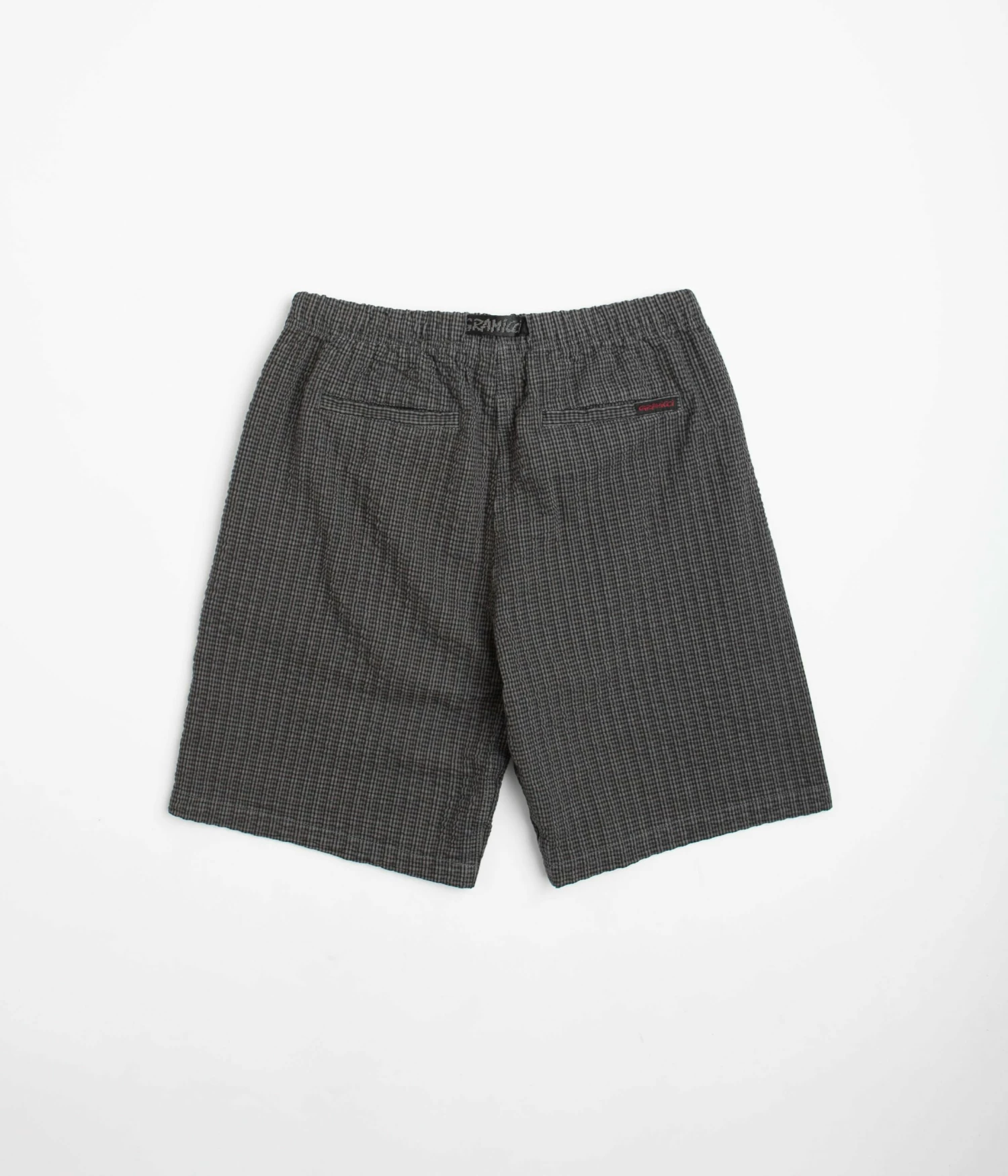Gramicci OG Seersucker G-Shorts in Deep Grey Garment Dyed. Utility inspired and made from 100% cotton, these seersucker Gramicci shorts are styled with an elasticated waist and an integrated webbing belt. Cut to an above-knee length, these garment dyed grey Gramicci G-Shorts are finished with two side pockets, two rear pockets, a gusseted crotch and with woven flag label branding.