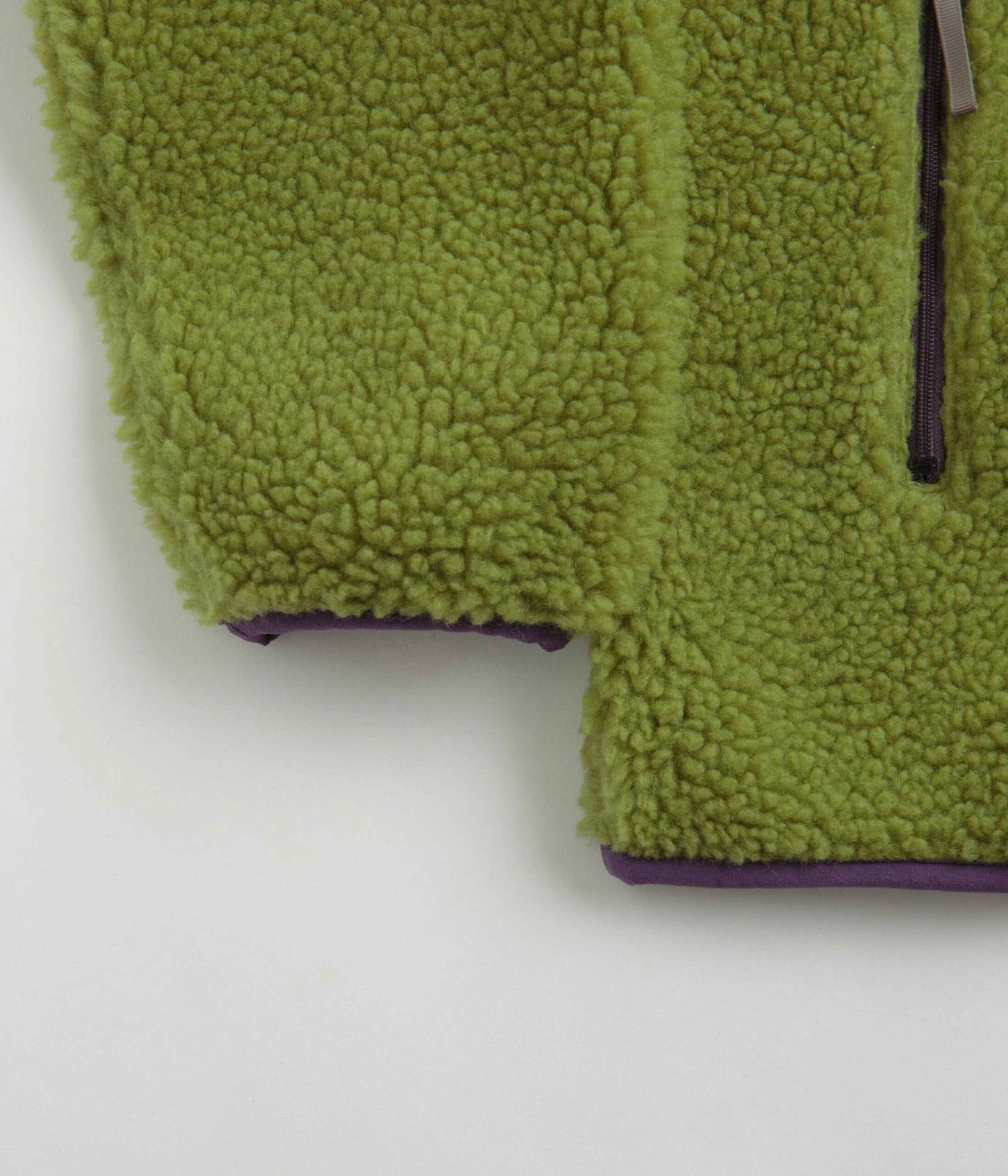 Gramicci Sherpa Jacket in Dusted Lime. Regular fitting with an all-over pattern, this Gramicci jacket is made from 100% polyester Sherpa fleece. Featuring a full length zipper fastening, stretchy taped seams, elasticated cuffs and a woven elastic hem, this lime green Gramicci jacket is finished with two zippered waist pockets, a single chest pocket and woven flag label branding.