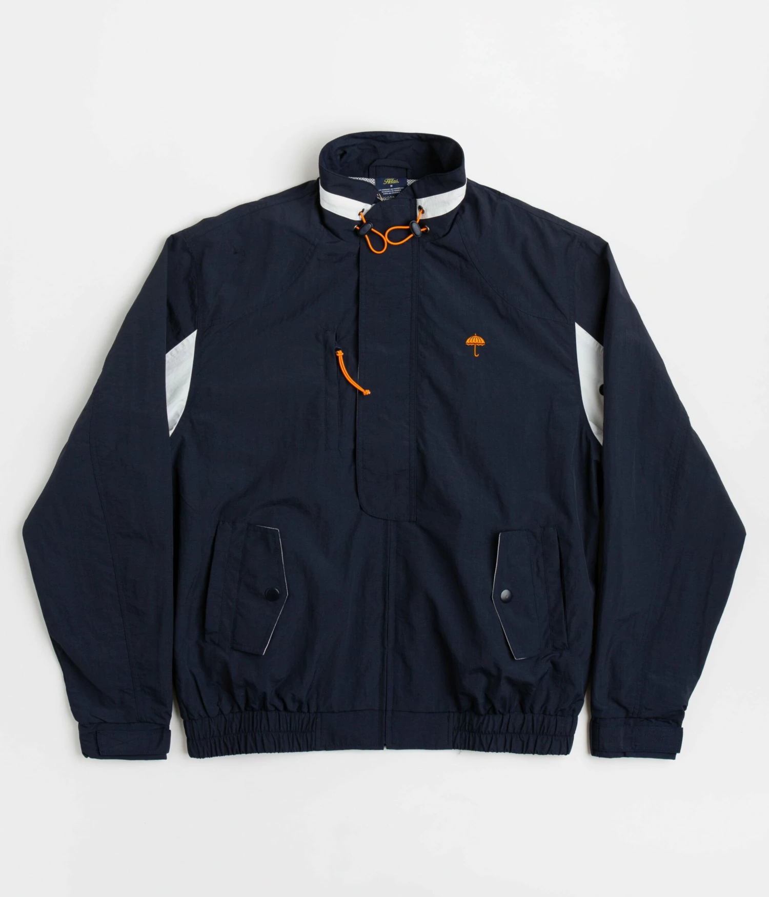 Hélas Boat Tracksuit Jacket in Navy. Inspired by classic maritime styles, this regular fitting Hélas jacket is made from 100% nylon with a 100% polyester mesh lining. Featuring a full length zipper fastening, a half length storm placket, a dual-toggle collar and elasticated cuffs, this navy Hélas track jacket is finished with a woven elastic hem, dual-entry front pockets, a single zippered chest pocket and with an embroidered left chest logo.