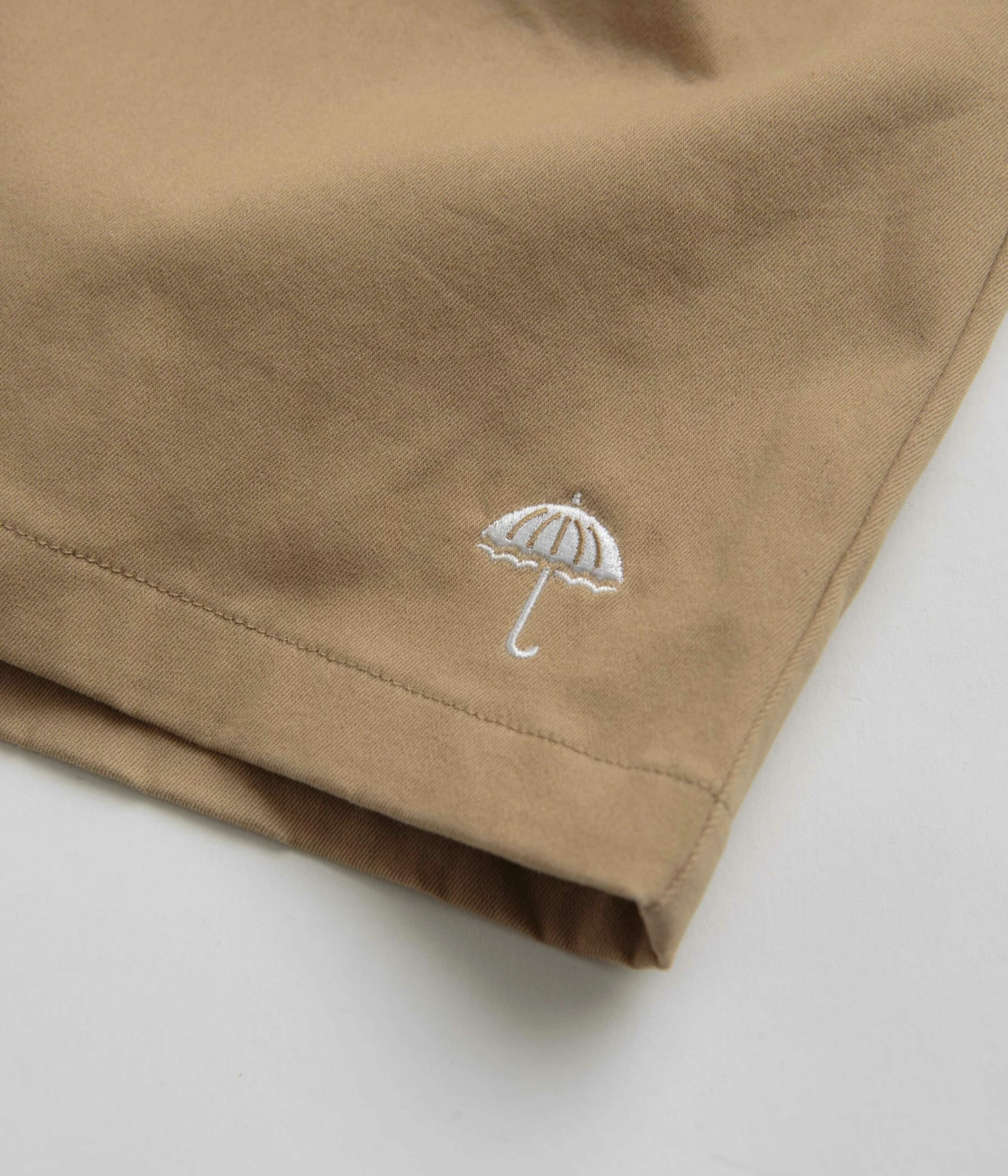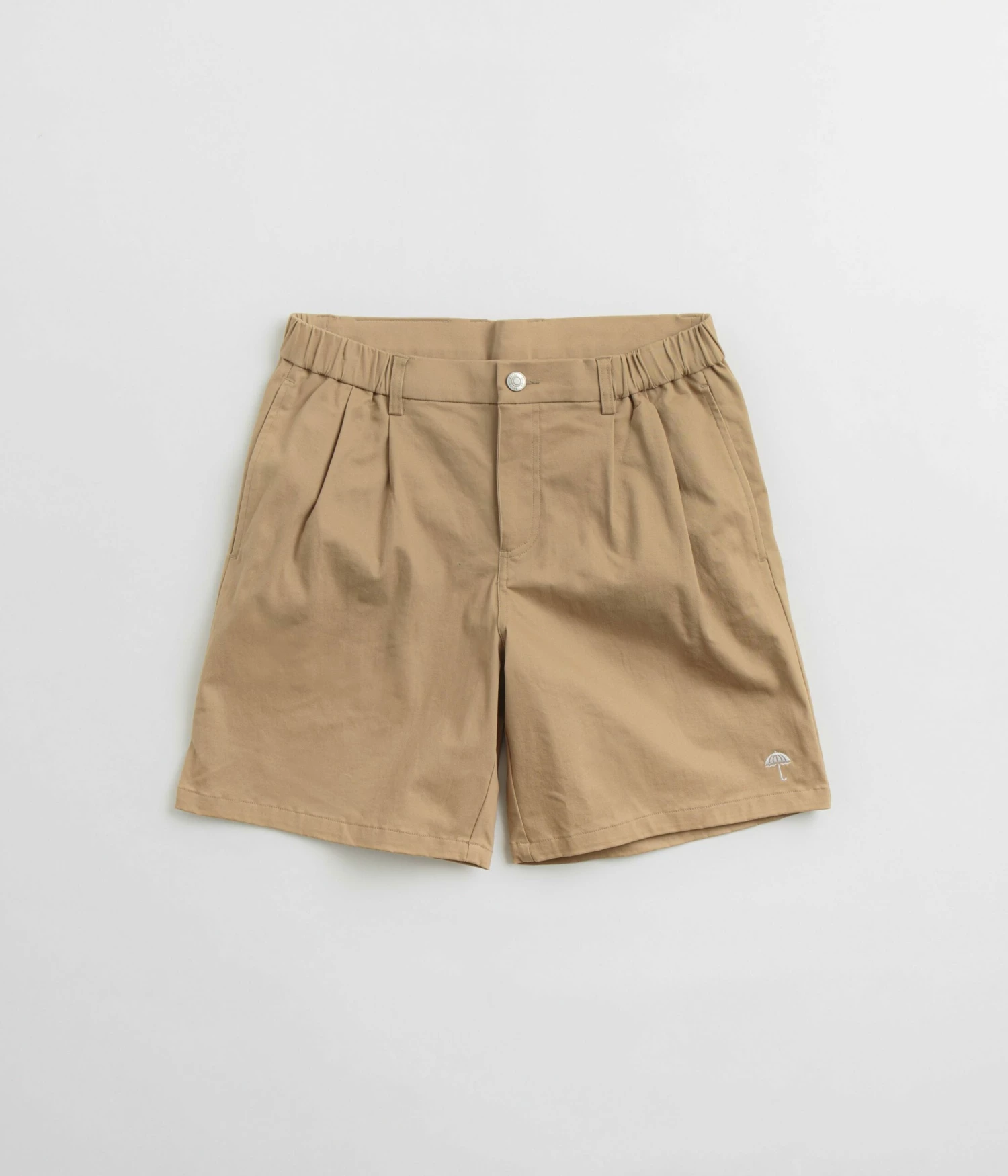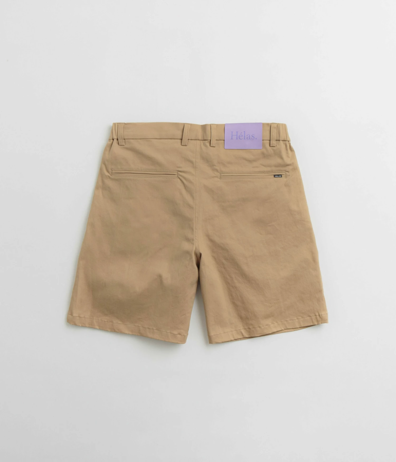 Hélas Classic Pince Shorts in Beige. Cut to an above-knee length, these regular fitting Hélas shorts are made from cotton twill. Featuring a partly elasticated waistband, a single button secured zipper fly and pleated details, these khaki beige Hélas shorts are finished with two side pockets, two rear pockets, embroidered logos and with a woven rear belt patch.