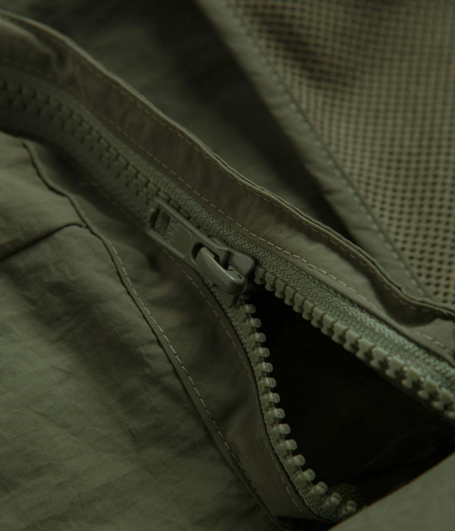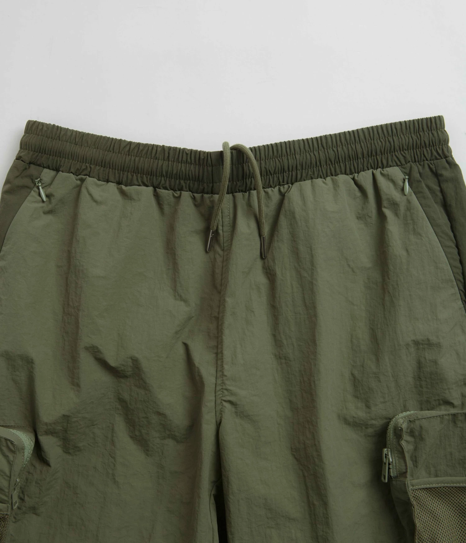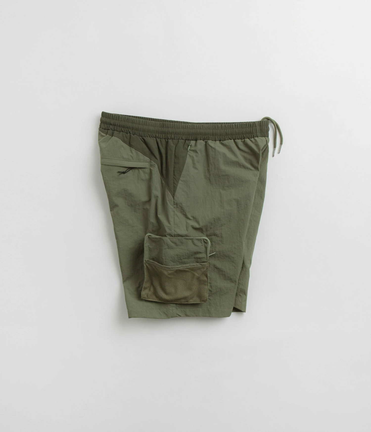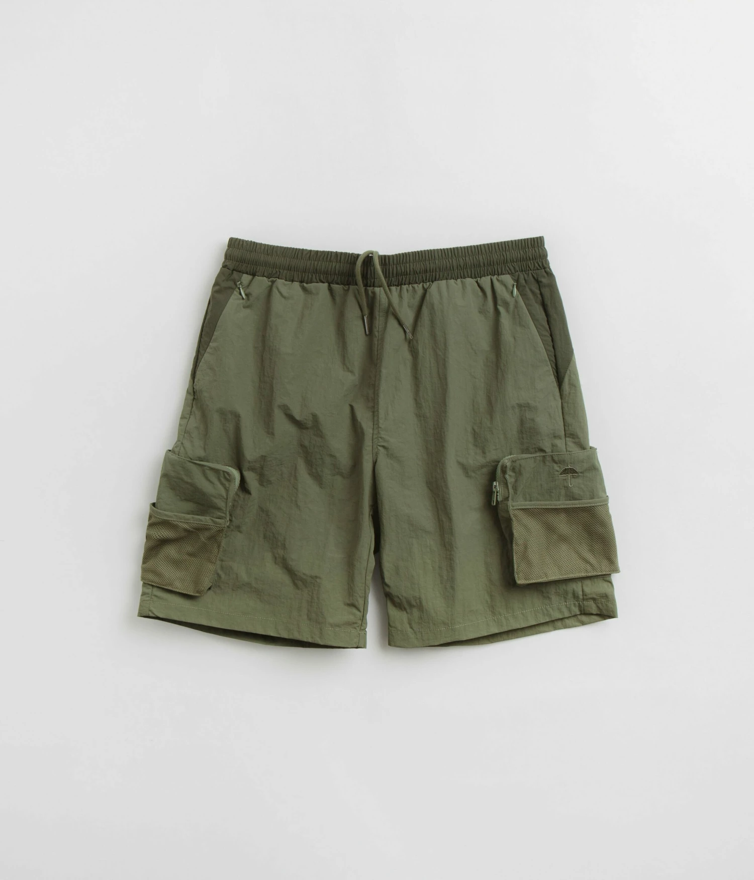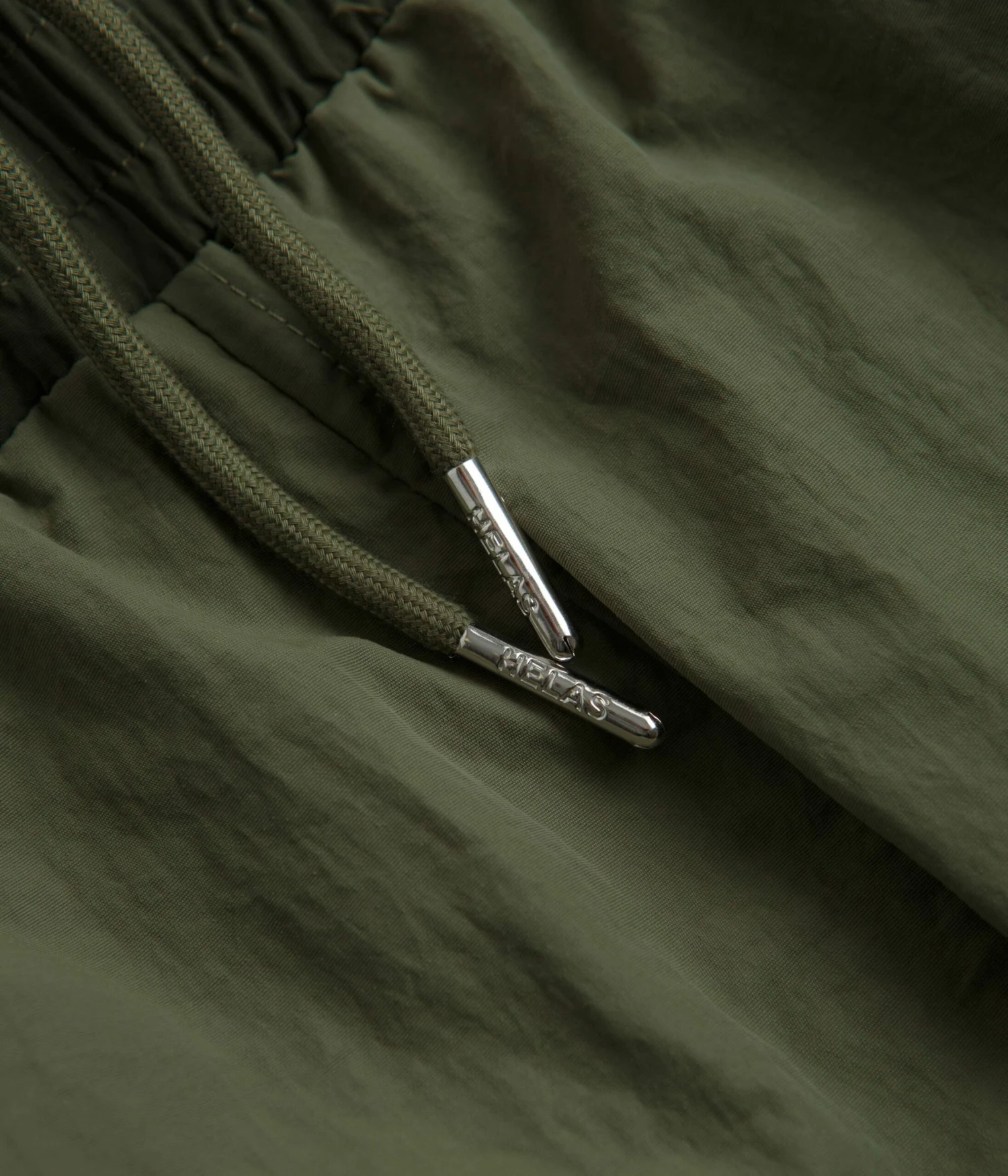 Hélas Discovery Shorts in Khaki Green. Utility inspired and tailored to a regular fitting, these above-knee Hélas shorts are made from polyester. Featuring a woven elastic waistband, contrast details and two zippered side pockets, these khaki green Hélas shorts are finished with a single rear pocket, a 3D utility pocket and with embroidered logo branding.