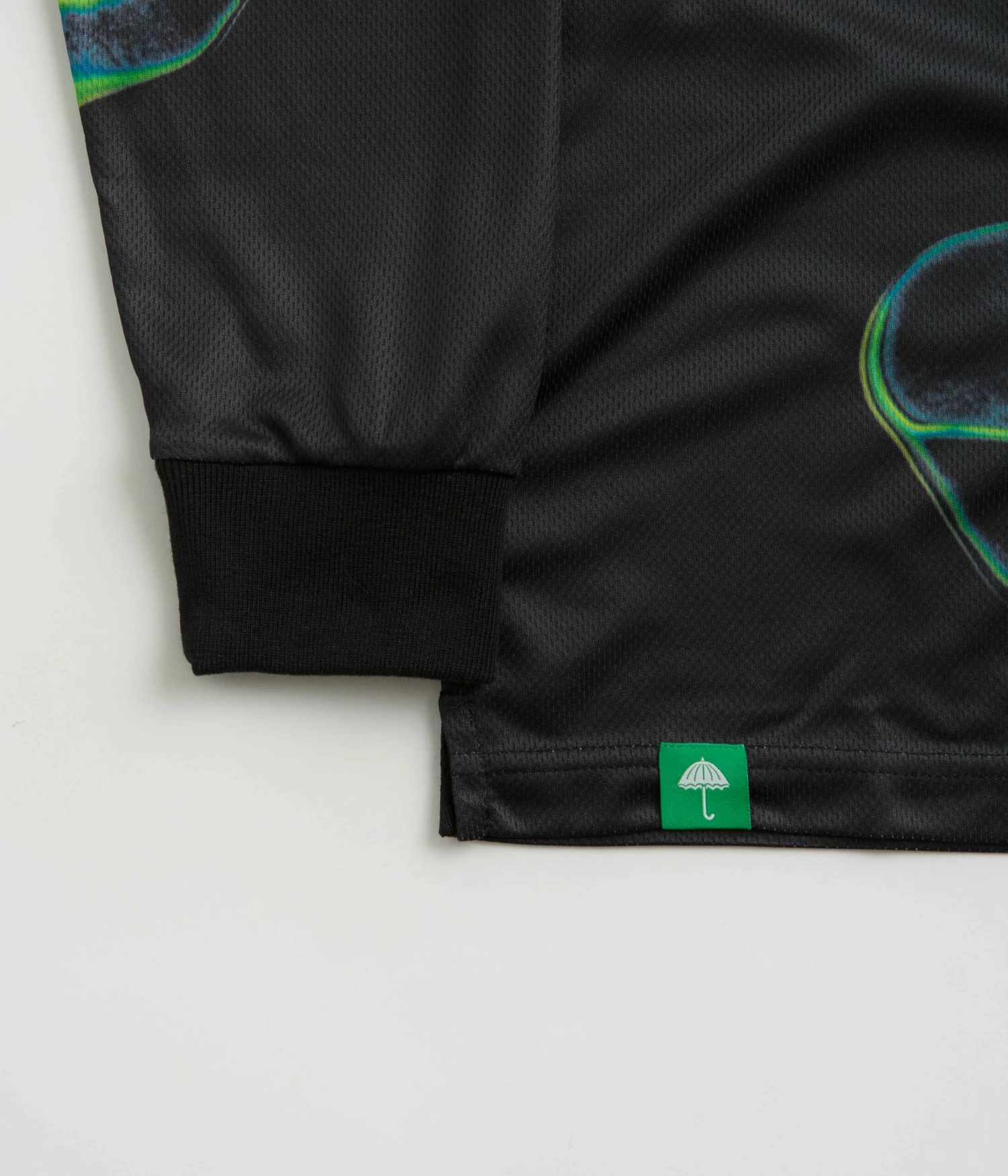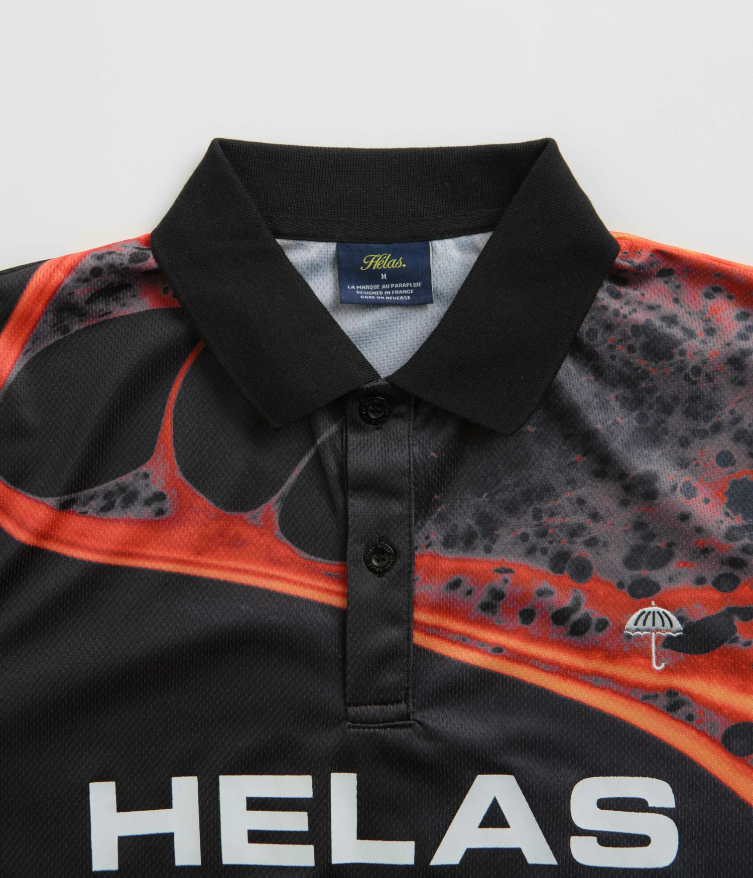 Hélas Liquid Long Sleeve Polo Shirt in Black. Designed with an all-over liquid print, this regular fitting Hélas shirt is made from 100% polyester with a colour block stand collar and a double button placket. Featuring ribbed cuffs and a flag label hem, this black Hélas polo shirt is finished with an embroidered chest logo and printed Hélas branding.