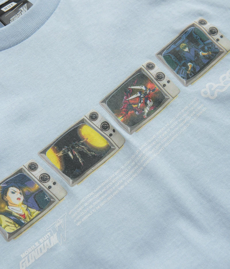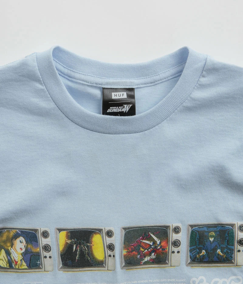 HUF Broadcasting Live T-Shirt in Light Blue. Part of the brand’s latest collaboration with Mobile Suit Gundam Wing, this HUF t-shirt is made from 100% cotton jersey with a flexible rib knit collar and a straight cut hem. Finished in a shade of light blue with co-designed Gundam Wing and HUF centre chest artwork.