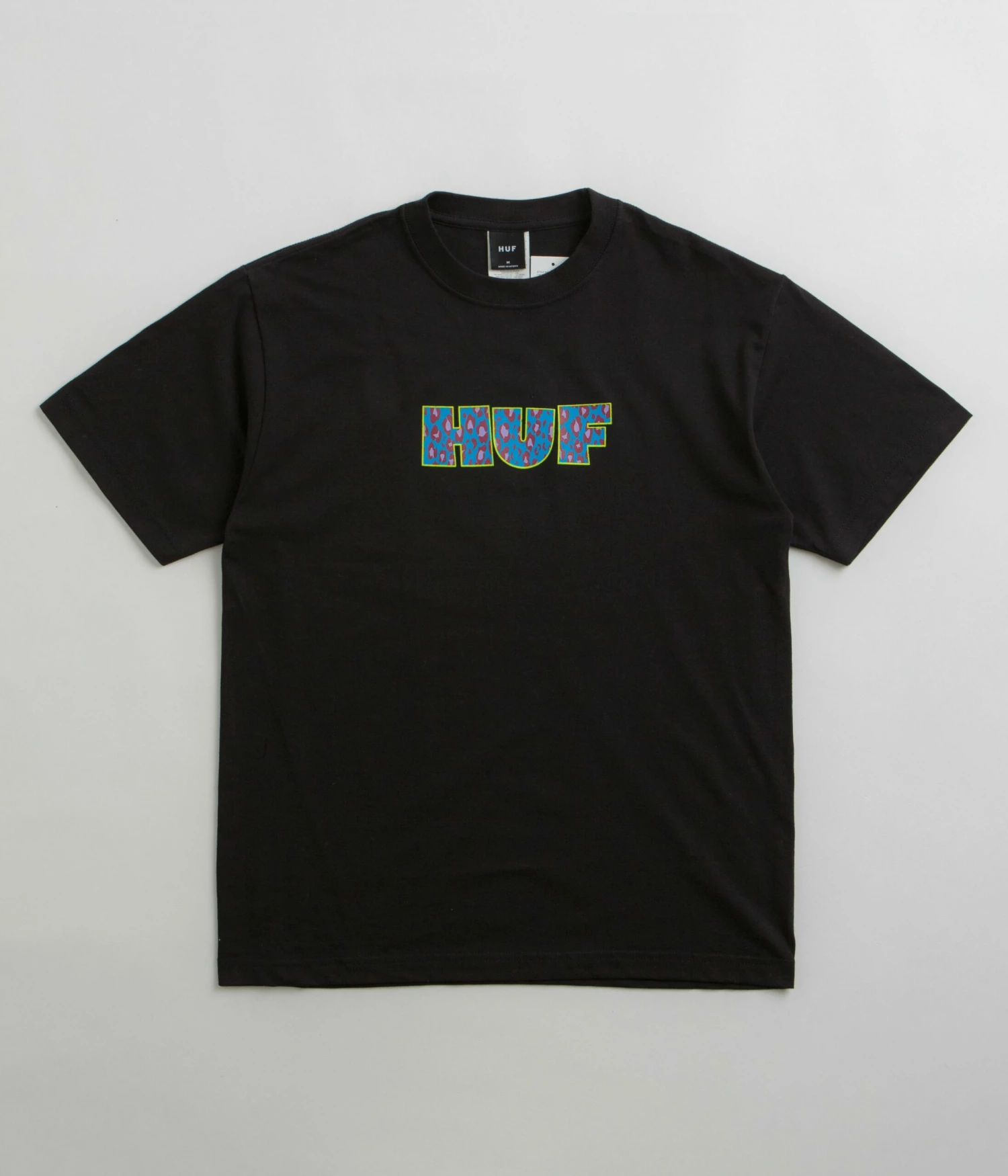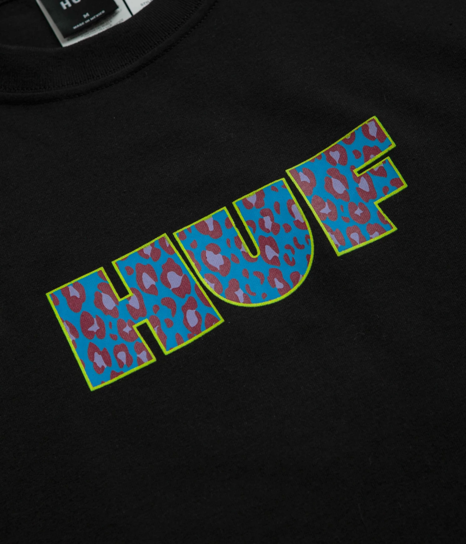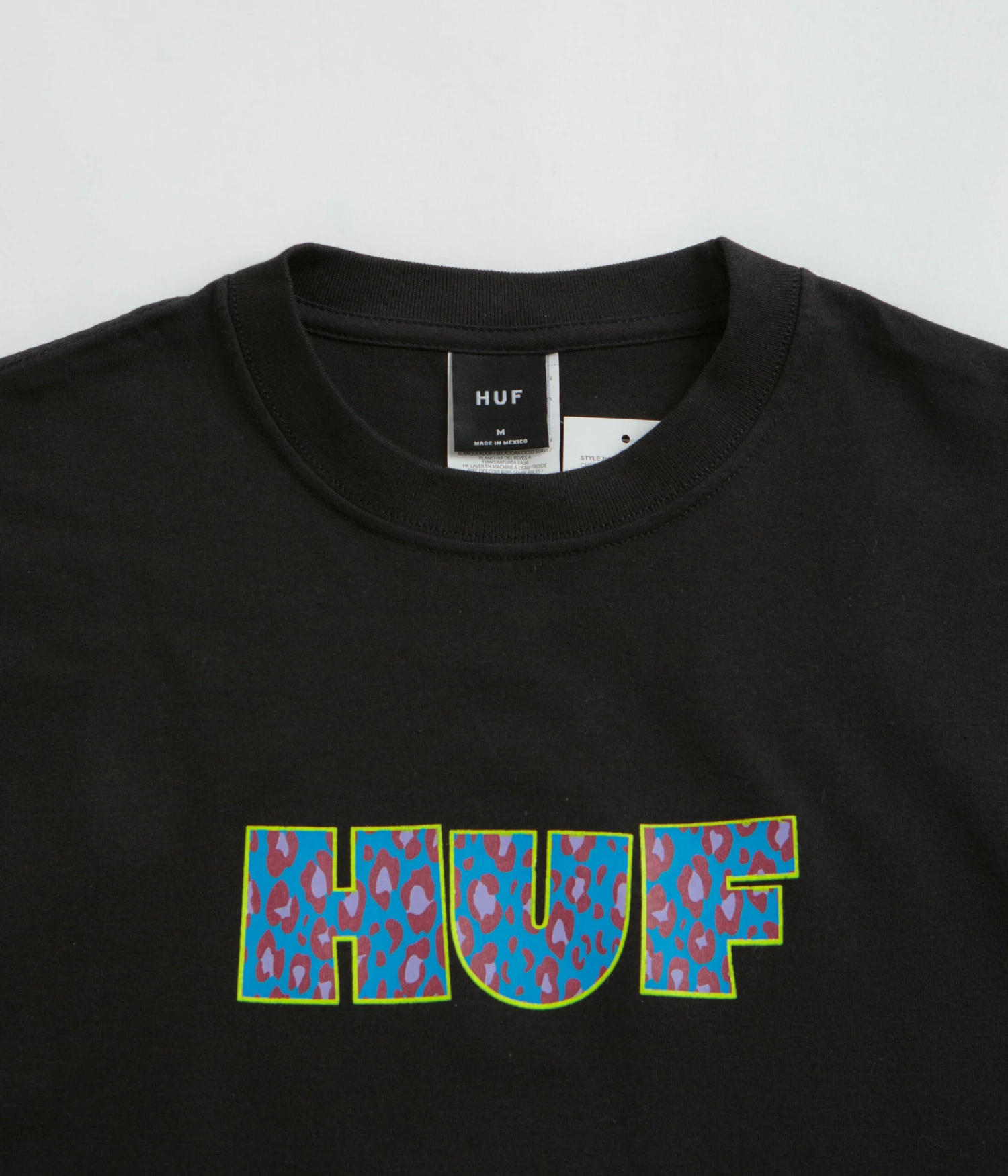 HUF Cheata T-Shirt in Black. Tailored to a regular fitting from 100% cotton, this HUF t-shirt is designed with a classic crew collar and a straight cut hem. Finished in a shade of black with a cheetah print HUF print chest graphic.