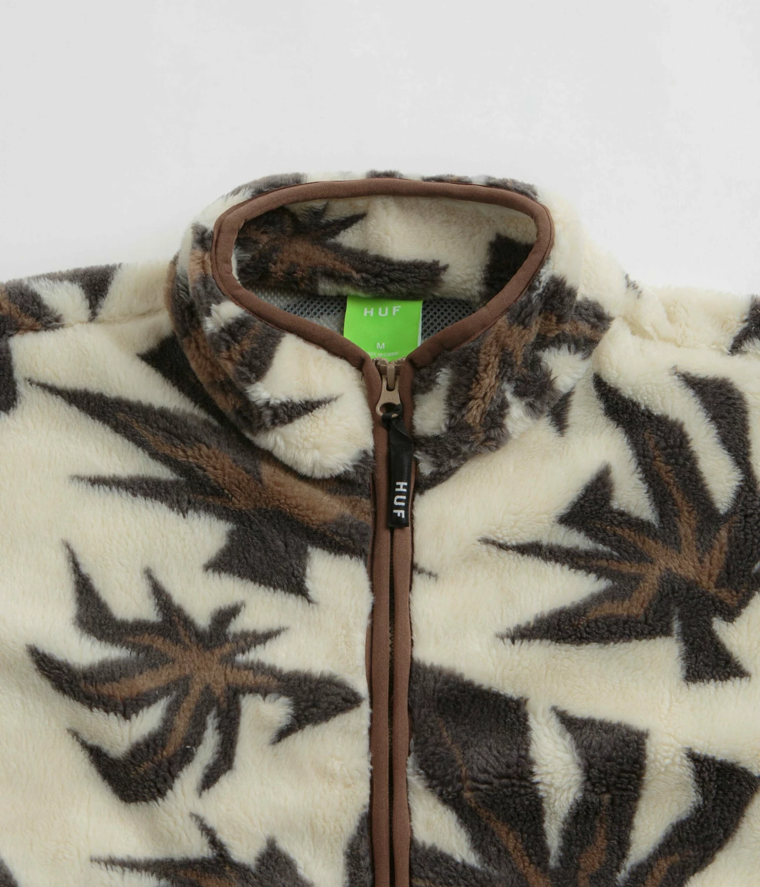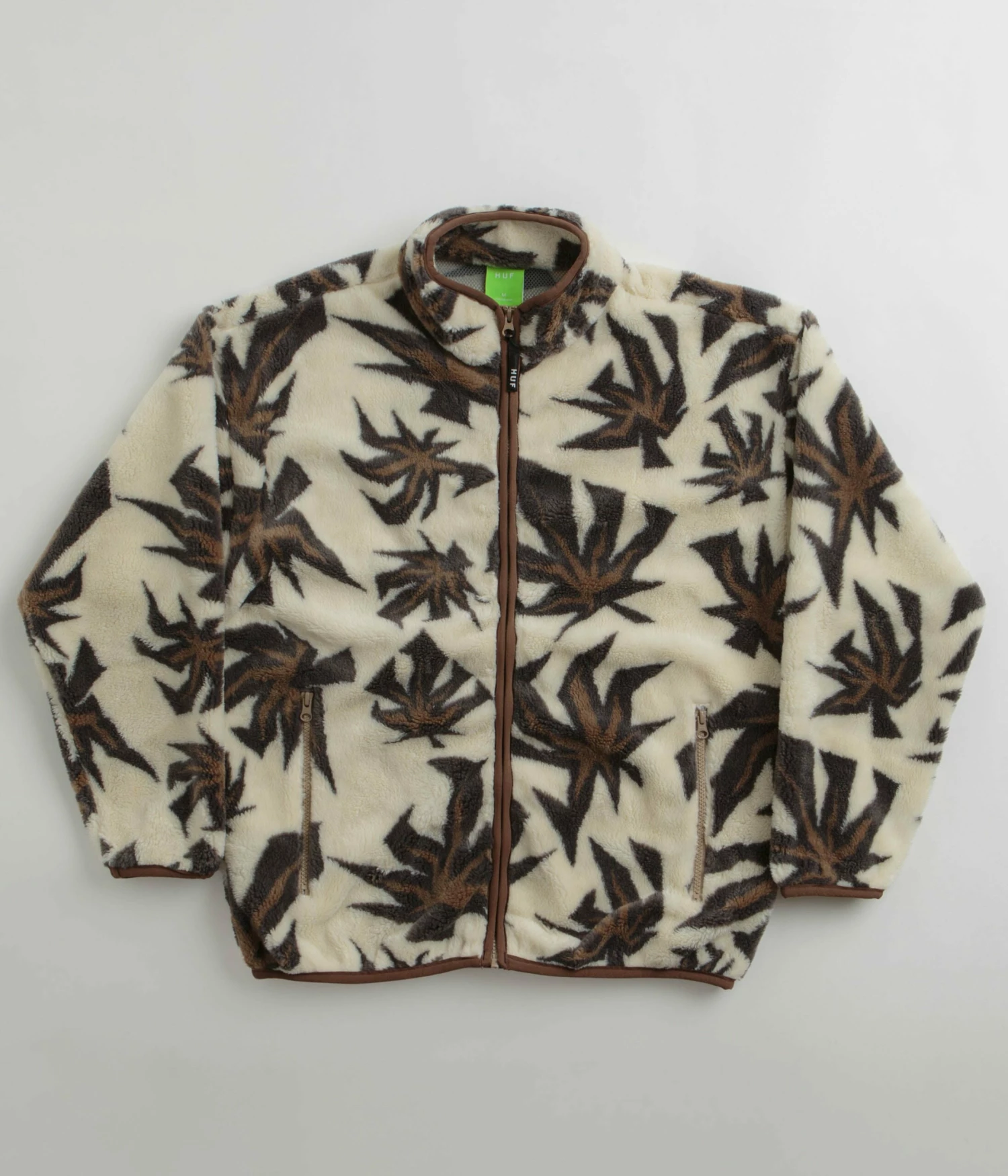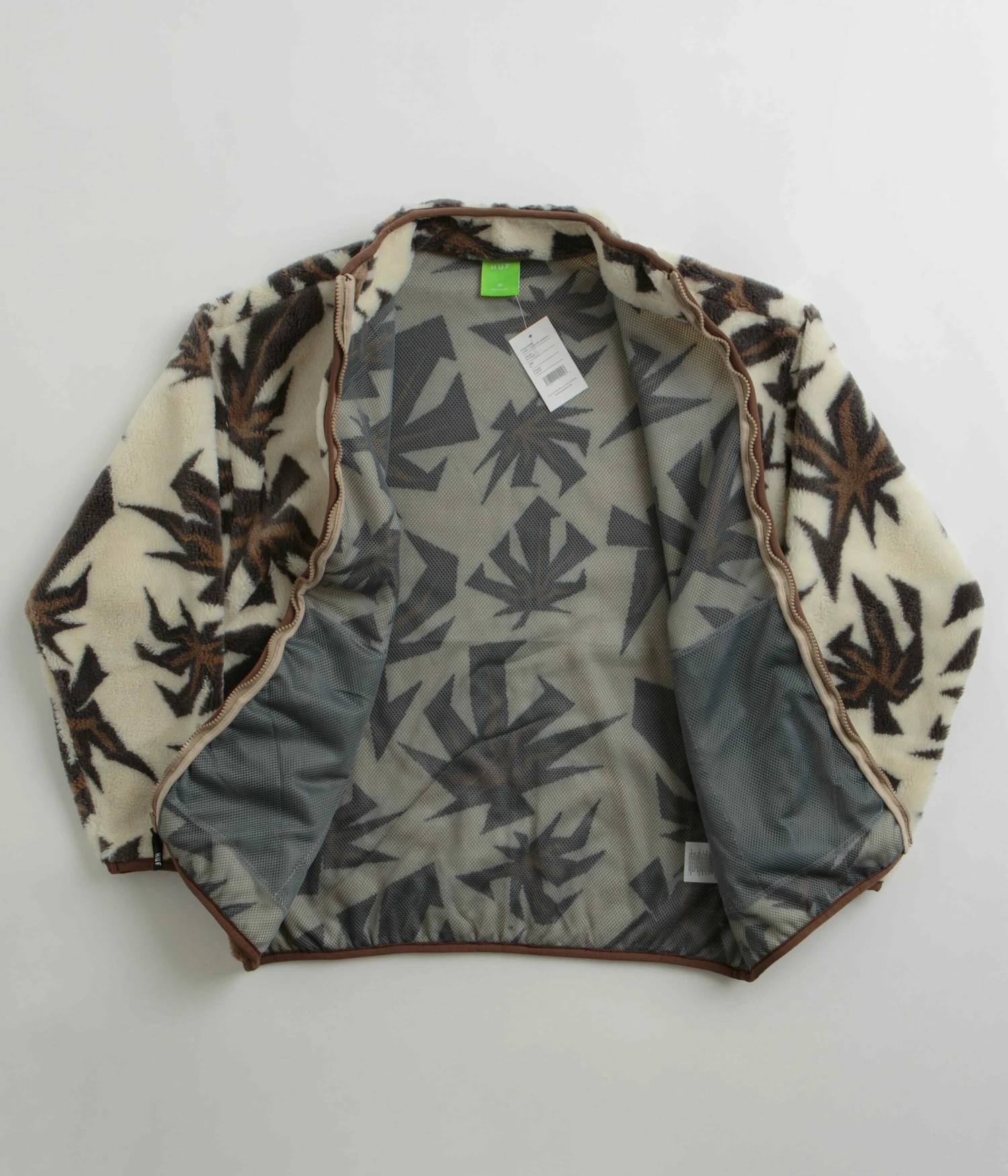 HUF Lowell Jacquard Sherpa Zip Fleece in Natural. Styled with an all-over jacquard pattern inspired by abstract plant life, this mesh lined HUF fleece is made from a poly-acrylic Sherpa blend. Featuring taped seams, a full length YKK zipper fastening, a high rise collar, elasticated cuffs and a woven elastic hemline, this patterned HUF fleece also features two zipped front pockets with branded zip pulls. Finished with tonal stitched seams and with an embroidered flag label sewn across the inner neckline.