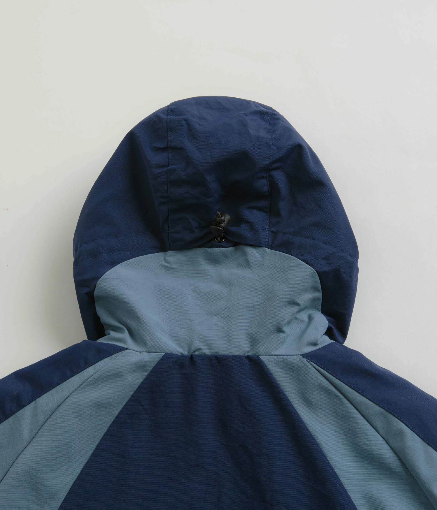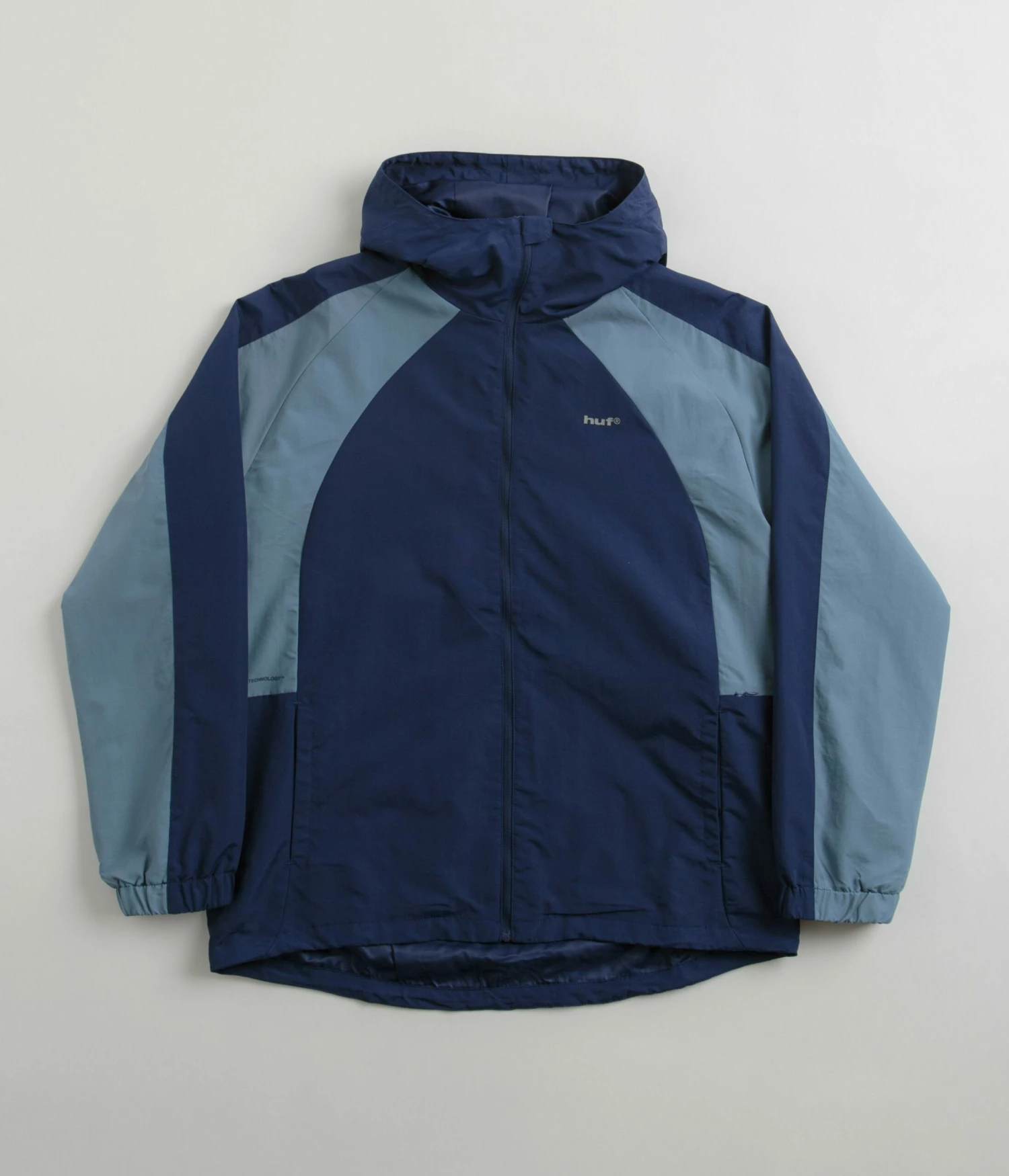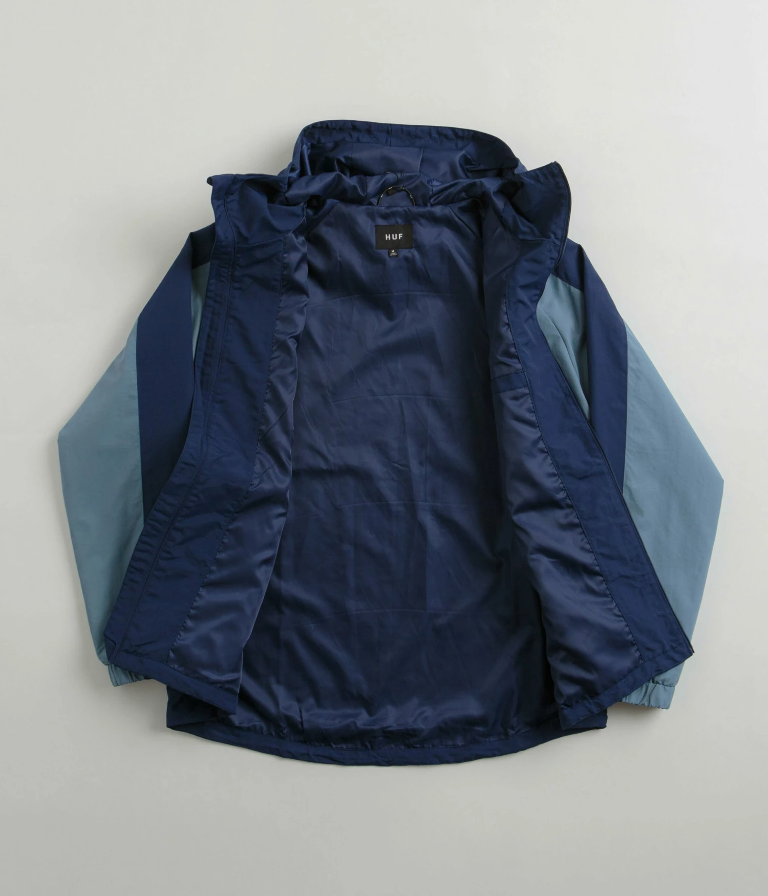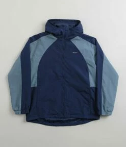 HUF Set Shell Jacket in Twilight. DWR coated and made from 100% nylon, this regular fitting HUF jacket is designed with colour block panelling and raglan sleeves. Featuring a full length zipper fastening, a cinch-cord hood, elasticated cuffs and a droptail hem, this blue HUF shell jacket is finished with two front pockets, a zippered stash pocket and with printed logo branding.