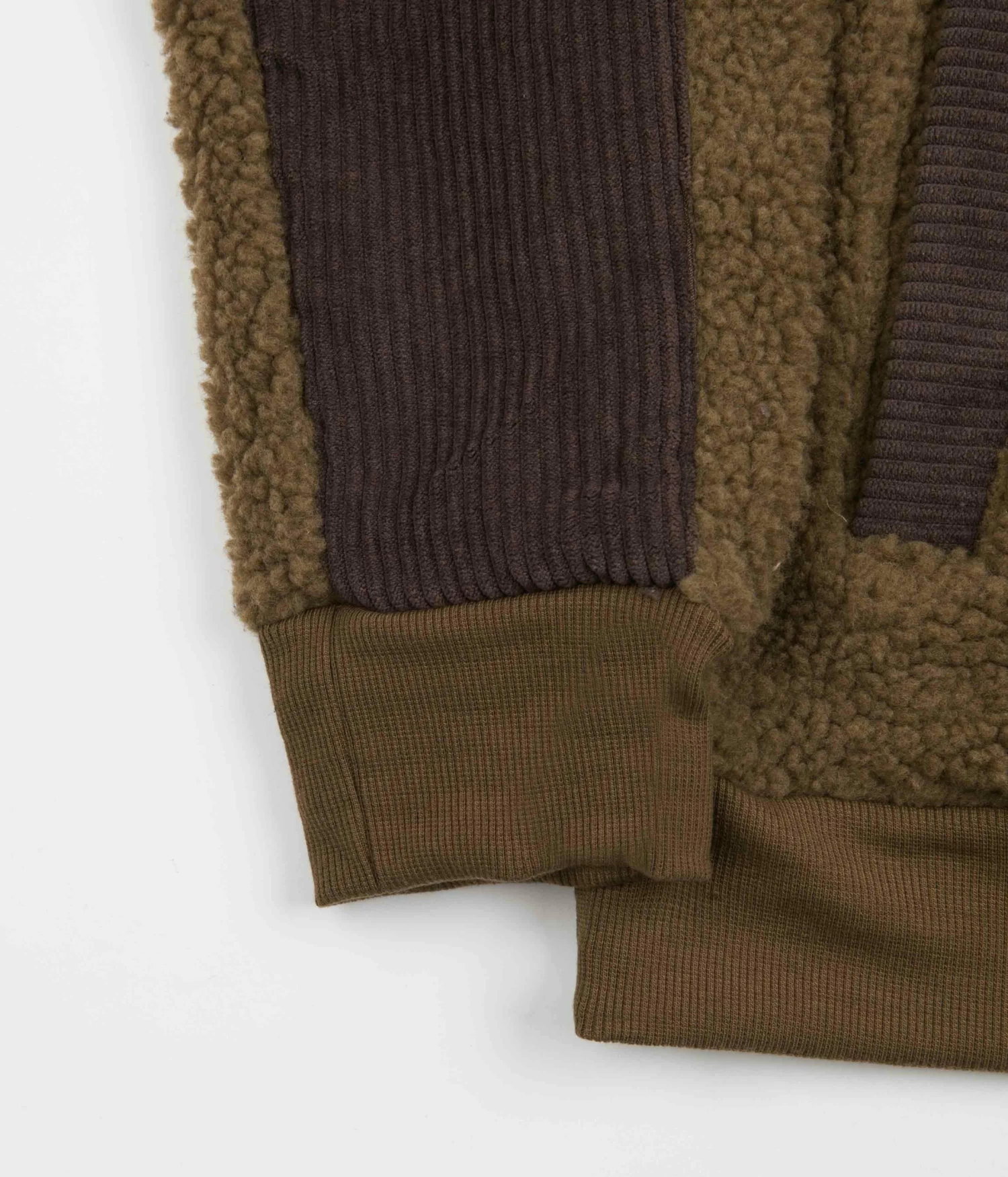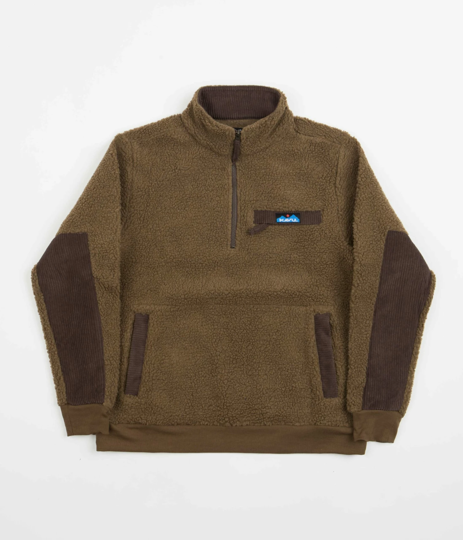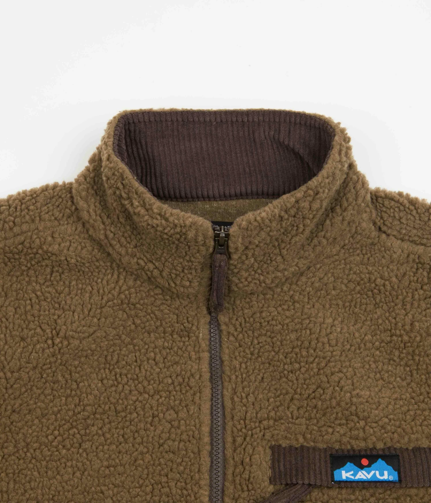Kavu Calawah Fleece in Coffee. A new addition to Kavu’s growing collection, this casual fitting Kavu fleece is made from 100% certified recycled polyester high-pile Sherpa fleece. Featuring a half length YKK zipper, a mock neck collar, reinforced elbow patches and contrast panel detailing across the cuffs and hem, this brown Kavu fleece is finished with two front pockets, a single chest pocket, cotton-corduroy accents and a woven Kavu flag label.