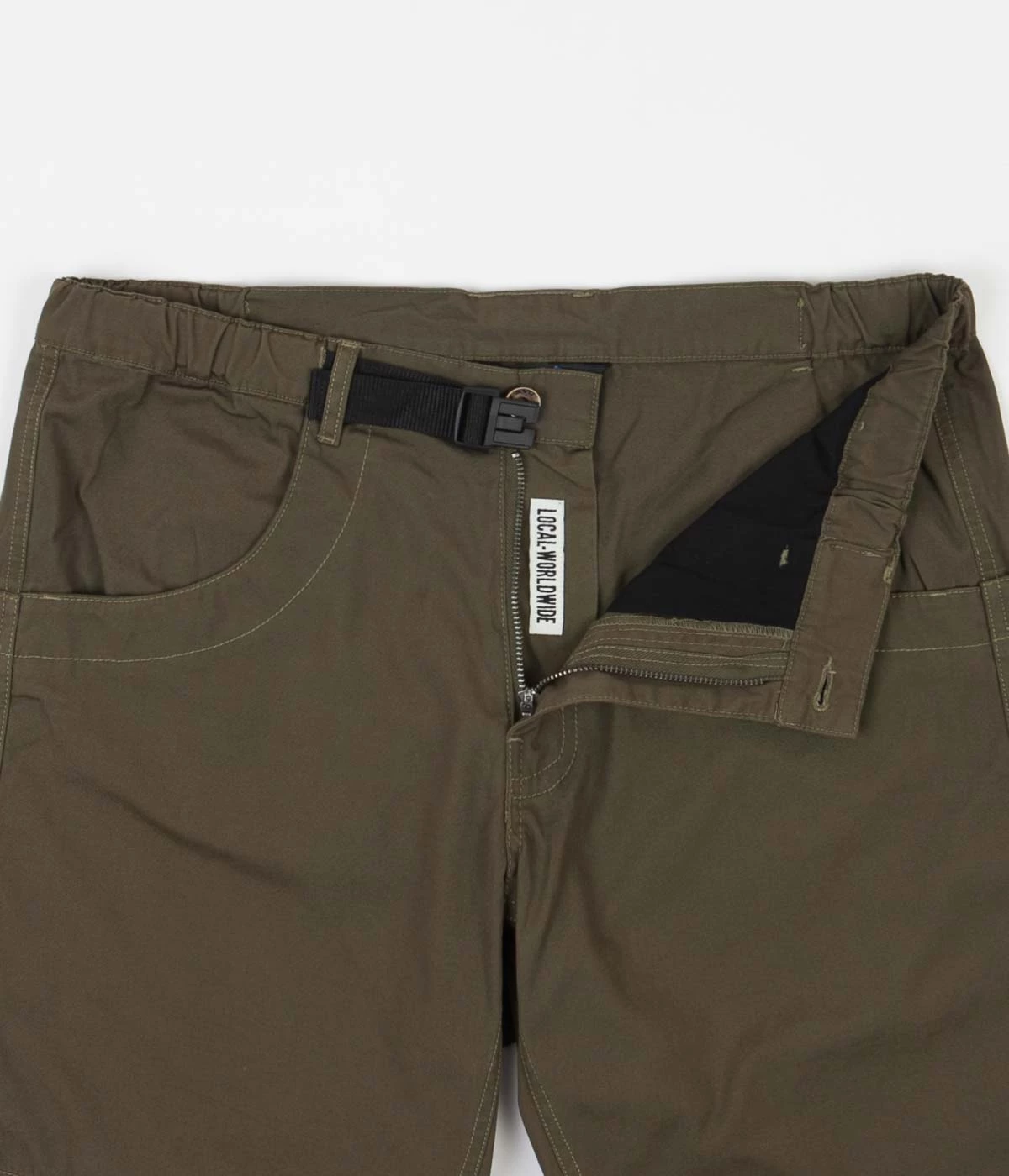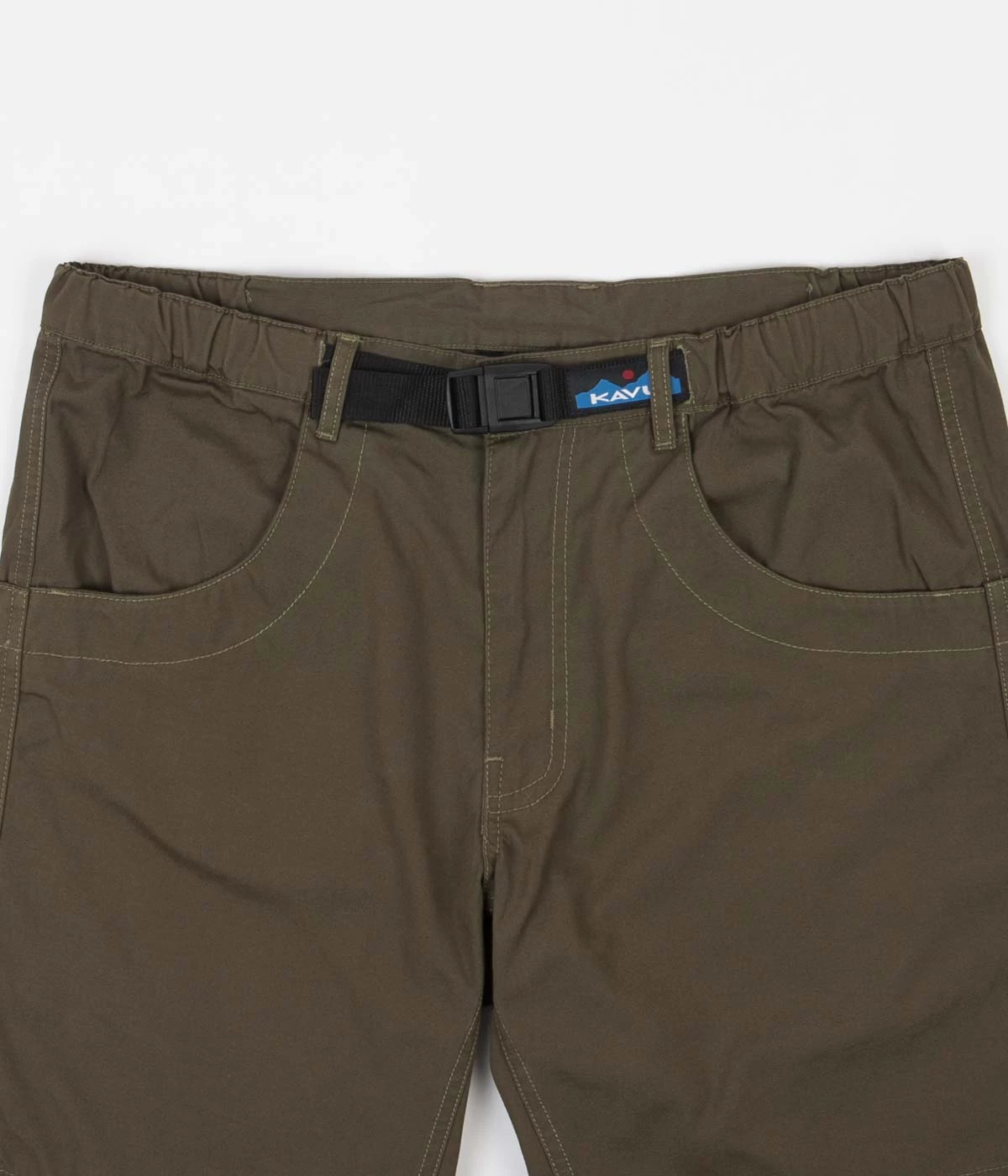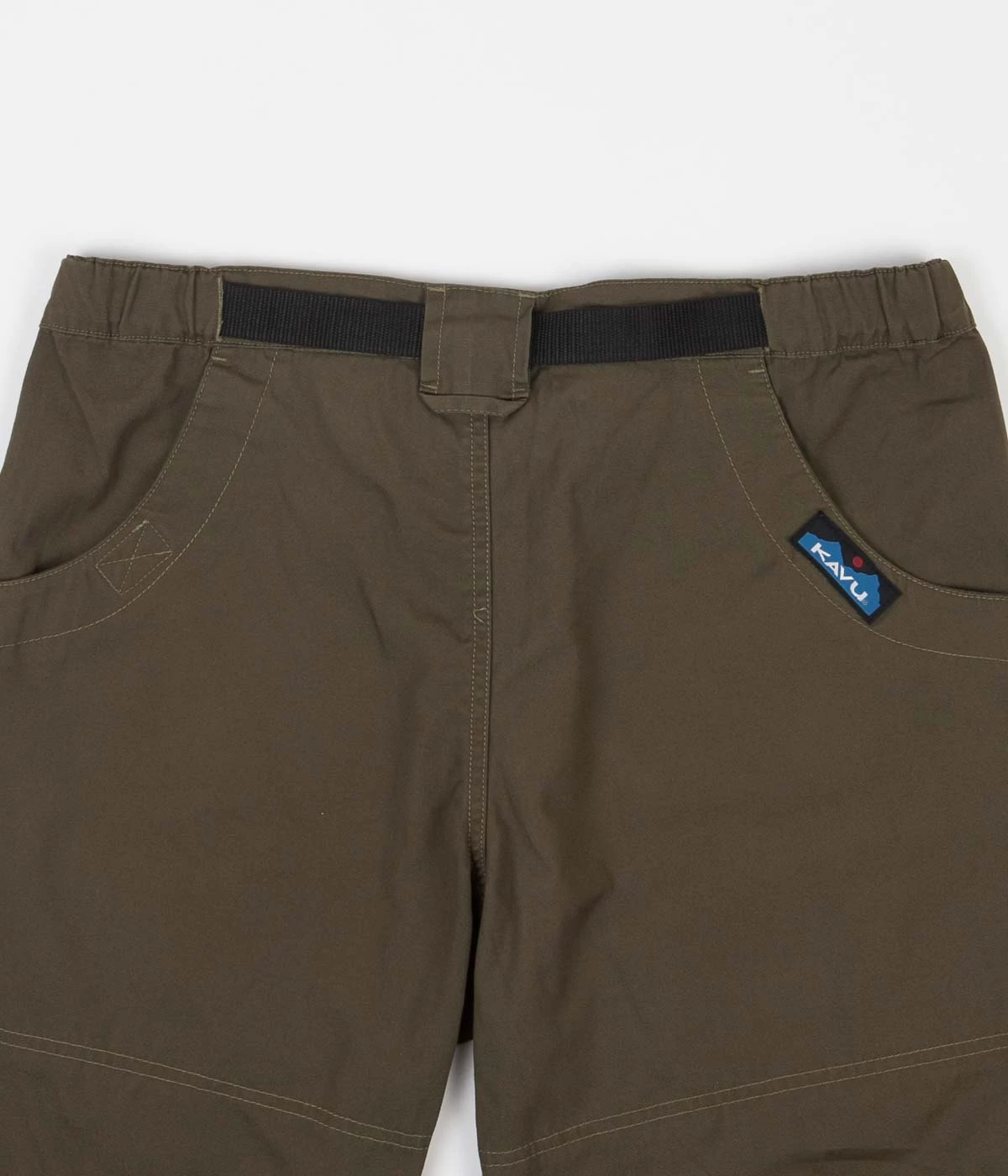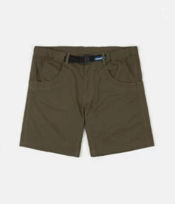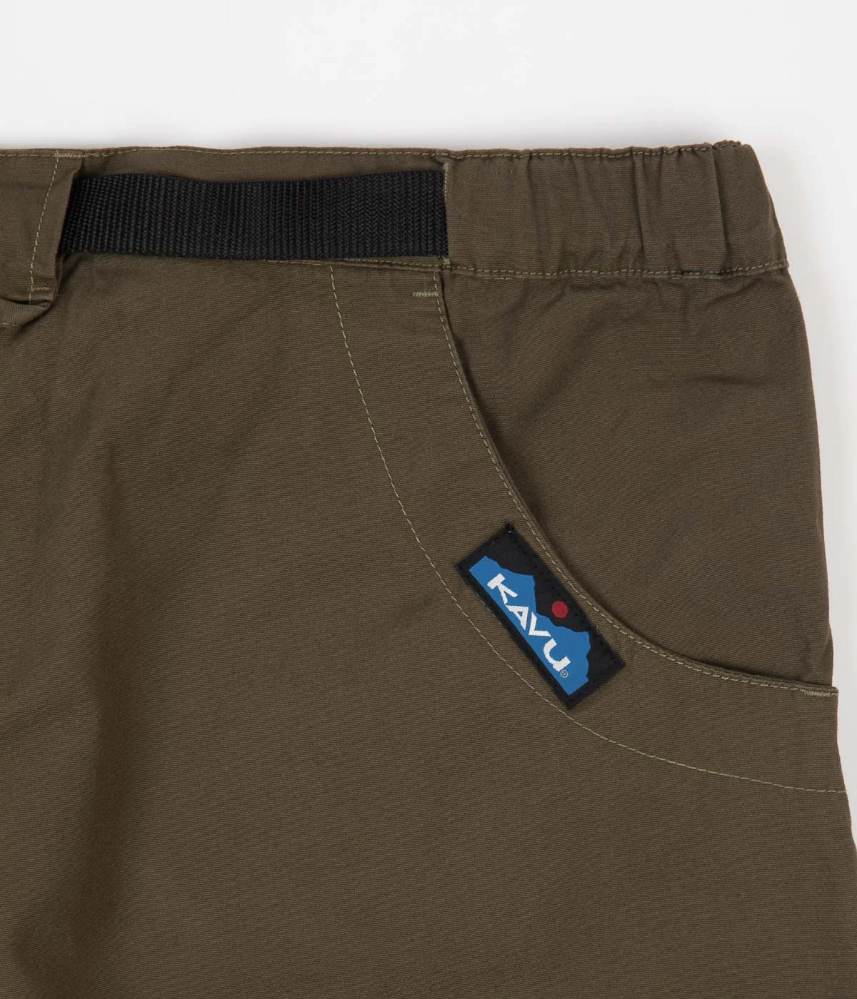 Kavu Chilli Lite Shorts in Pine. Cut to a loose fit from lightweight cotton canvas, these new season shorts from Kavu feature a built-in belt with a YKK side release buckle and half moon pockets on either side of the waist. Suitable for relaxing at home, strolling around the city or for more adventurous outdoor excursions, a gusset has been added at the crotch to allow for movement whilst double needle reinforcement at key seams strengthens the overall design. The waistband is half-elasticated for comfort and the built-in belt features a woven Kavu label that presents the brand’s signature logo. Providing space to carry essentials, on either side of the waist half-moon pockets have been added and to the rear right side an additional internal wallet compartment is also available with a branded woven label on the edge of the entrance point.