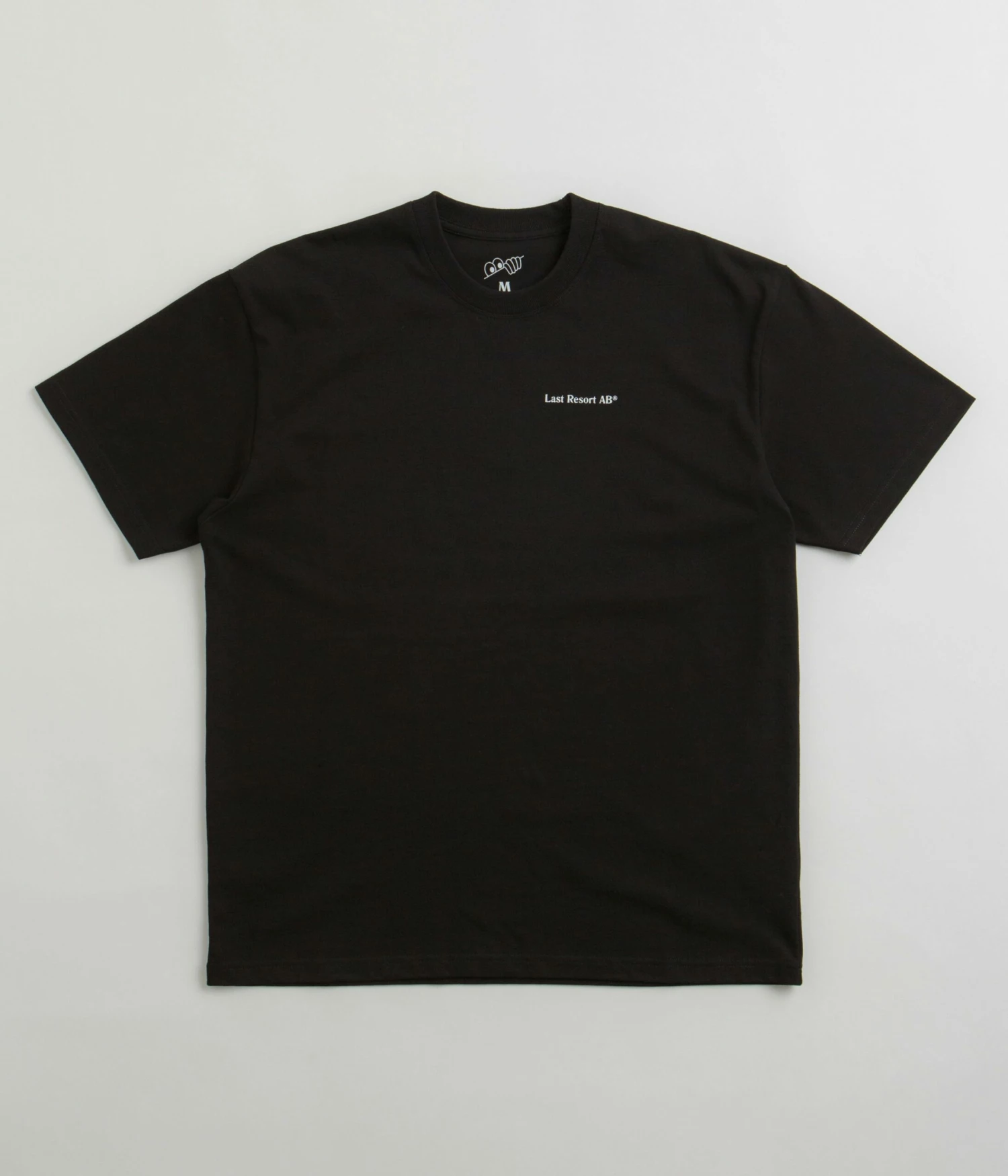 Last Resort AB Atlas Monogram T-Shirt in Black and White. Made from 100% cotton, this block tone Last Resort AB t-shirt is tailored to a regular fitting. Featuring a rib knit collar and a straight cut hem, this black Last Resort AB t-shirt is finished with contrasting front and rear graphics.