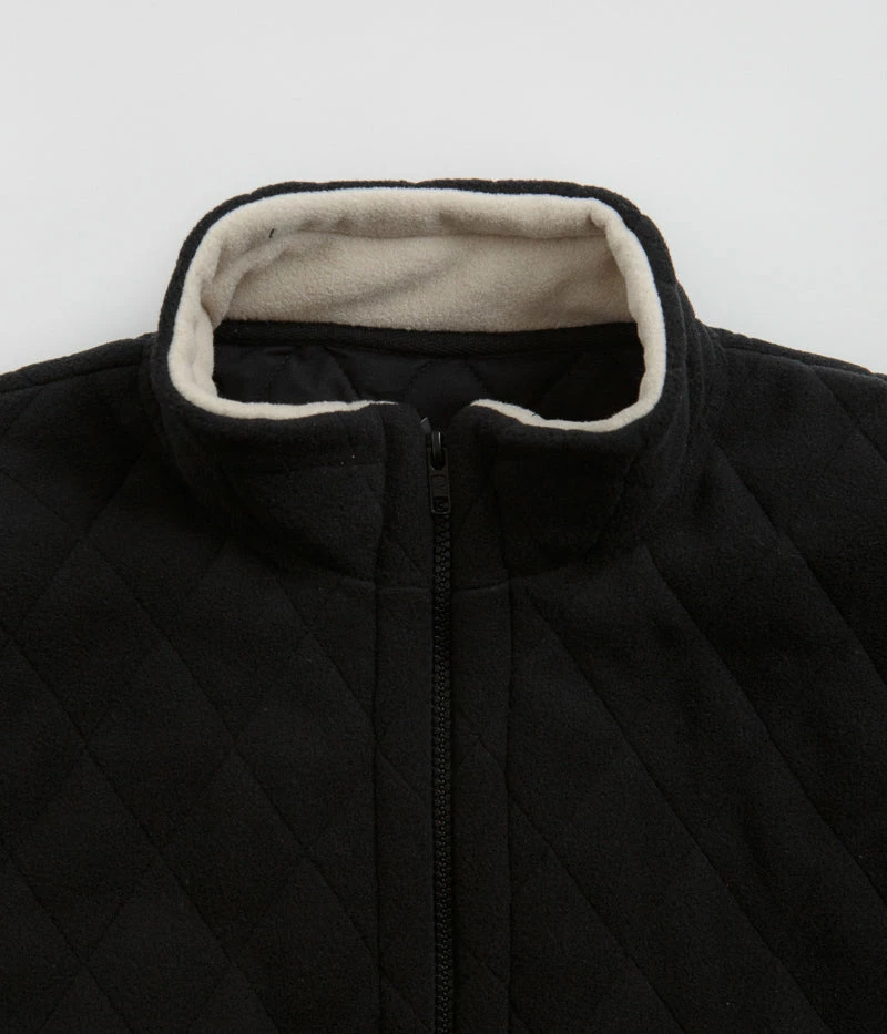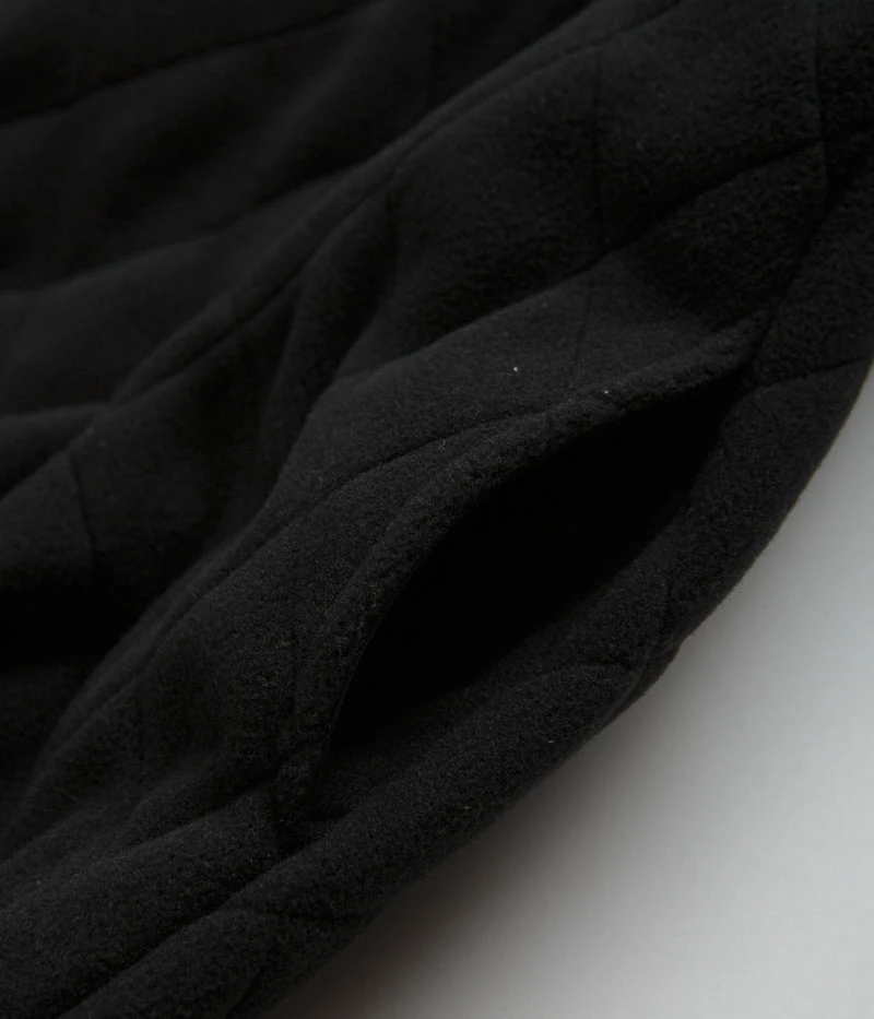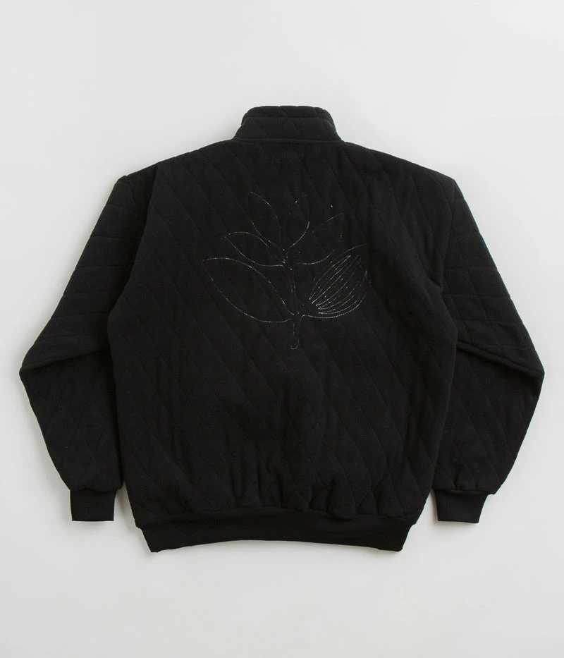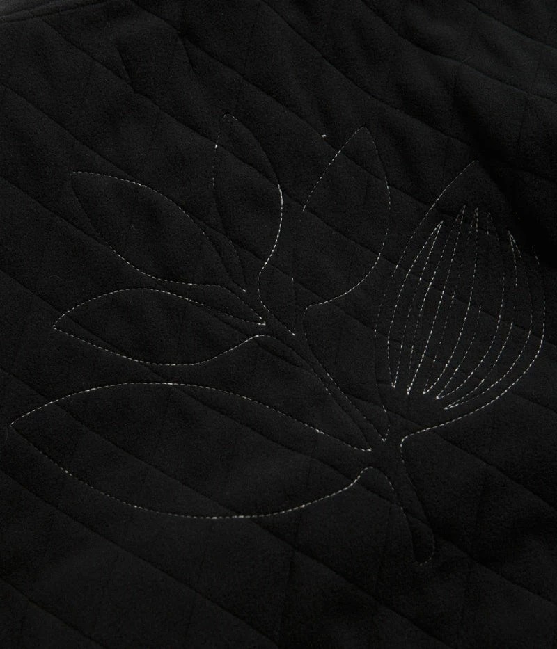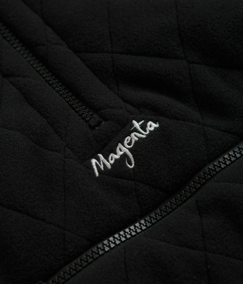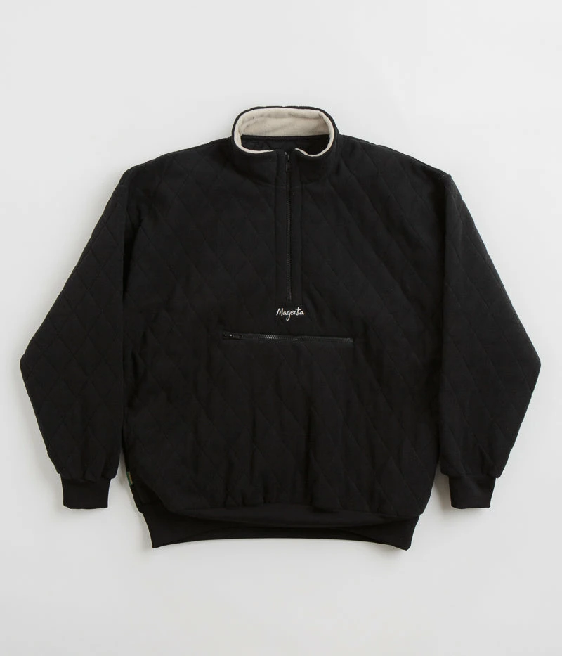 Magenta Lunar Quilted High Neck Sweatshirt in Black. A technical silhouette made from 100% Polar fleece, this regular fitting Magenta sweatshirt is designed with quilted stitching and a quarter length YKK Vislon zipper. Featuring a high-rise collar, ribbed cuffs and woven elastic hem, this black Magenta sweater is finished with two side pockets, a zippered kangaroo pocket, embroidered front branding and with a woven plant logo sewn across the rear.