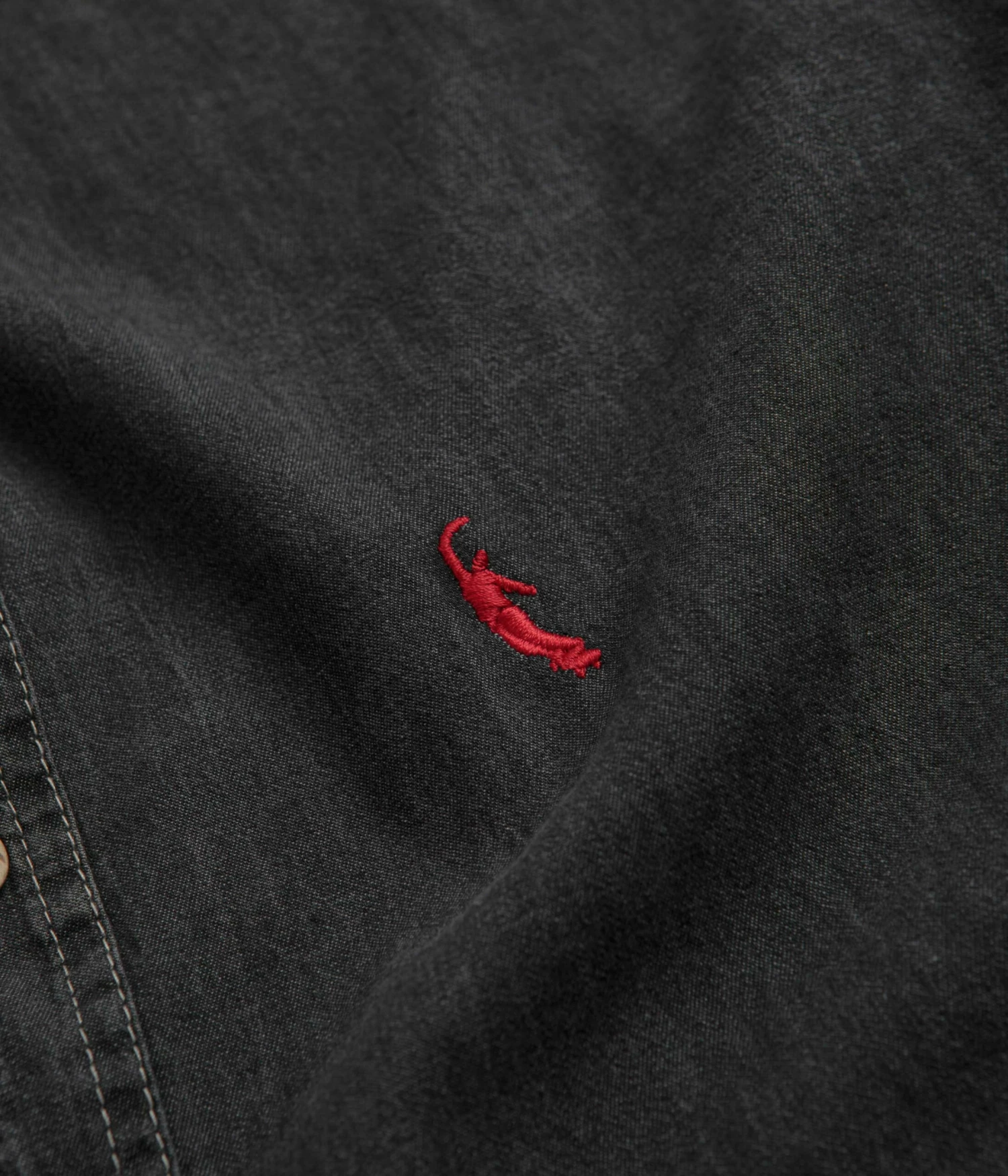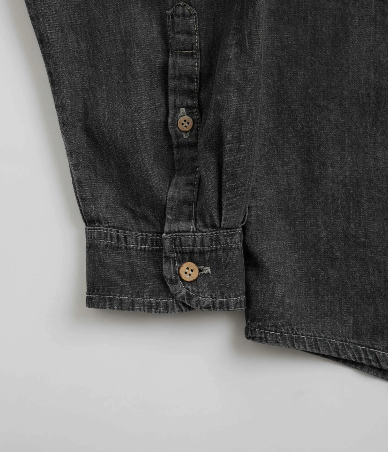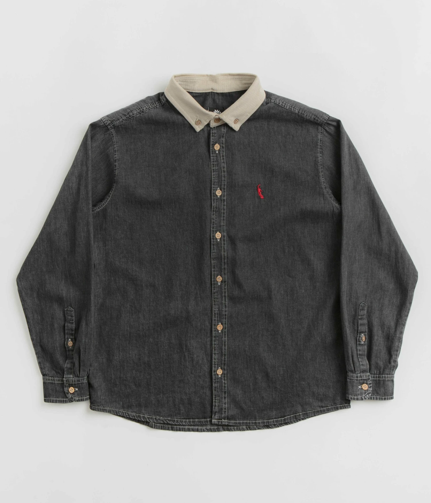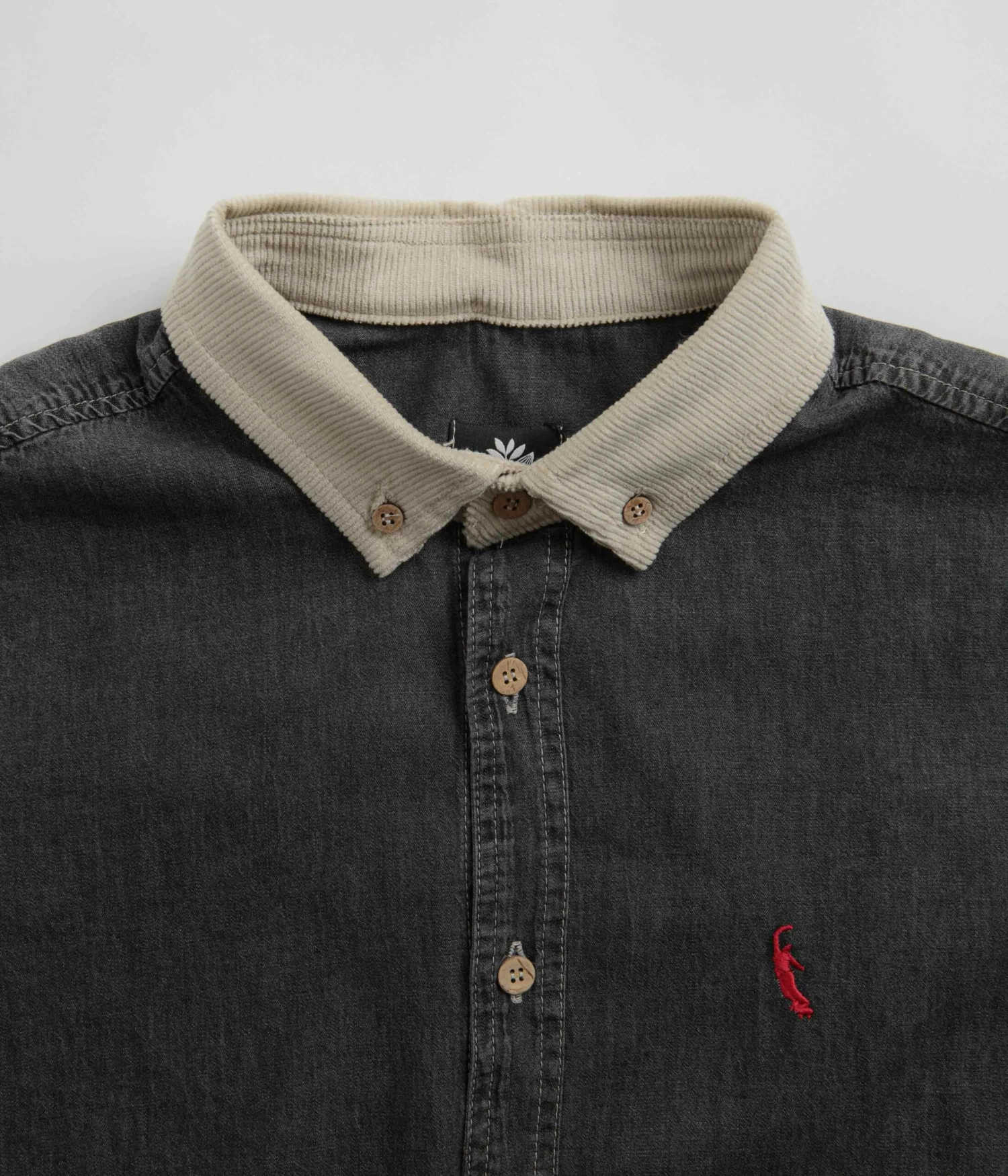 Magenta PWS Shirt in Black Denim. Tailored to a regular fitting from 100% cotton denim, this new season Magenta shirt is designed with a contrasting button-down corduroy collar. Featuring a full length button fastening, adjustable cuffs and a curved hem, this black Magenta shirt is finished with a woven side seam flag label, an embroidered logo and with custom coconut hardware.