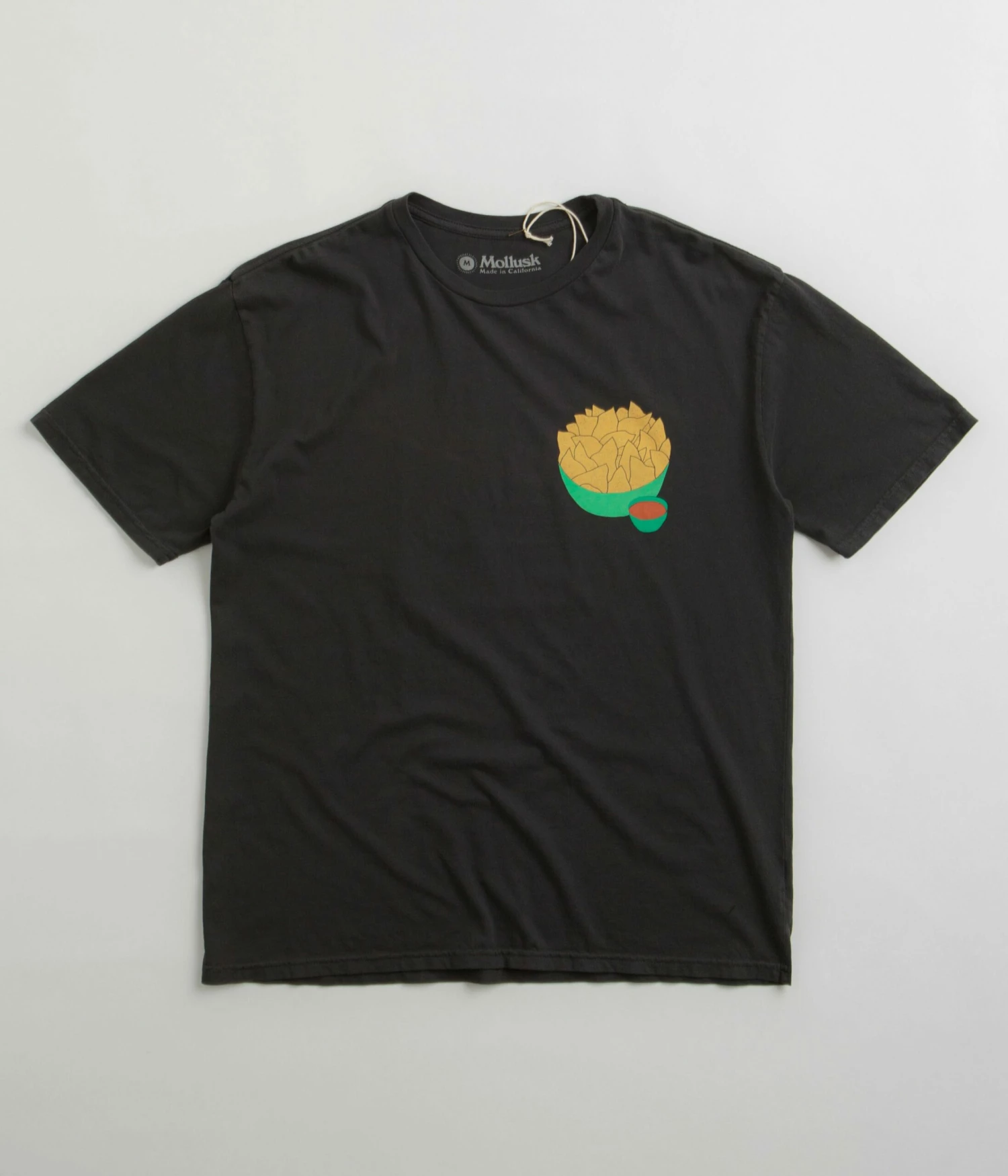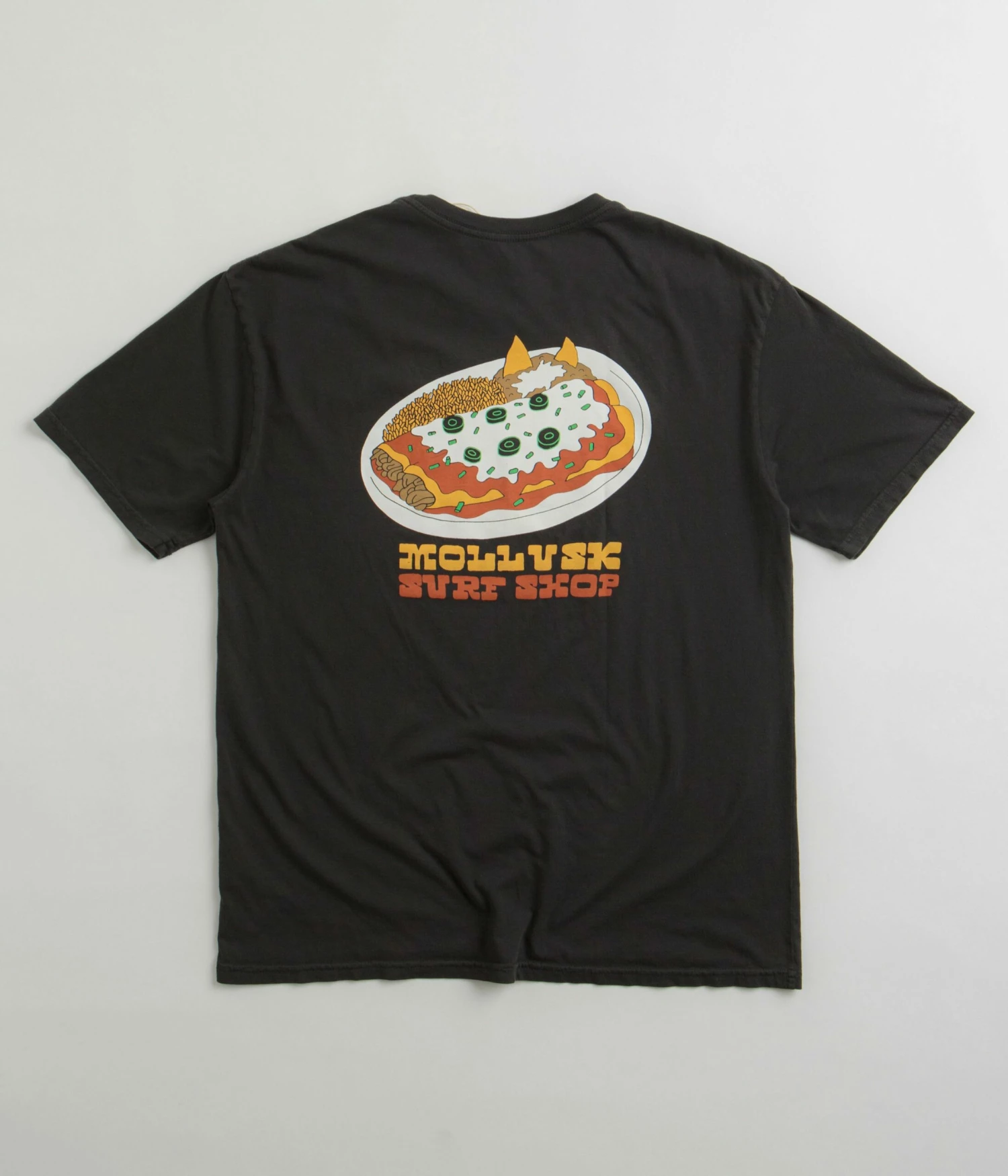 Mollusk Enchilada T-Shirt in Black. Tailored to a regular fitting with custom artwork by Nathaniel Russell, this Mollusk t-shirt is made from 100% cotton. Featuring a flexible rib knit collar and a straight cut hem, this black Mollusk t-shirt is finished with printed front and rear graphics.