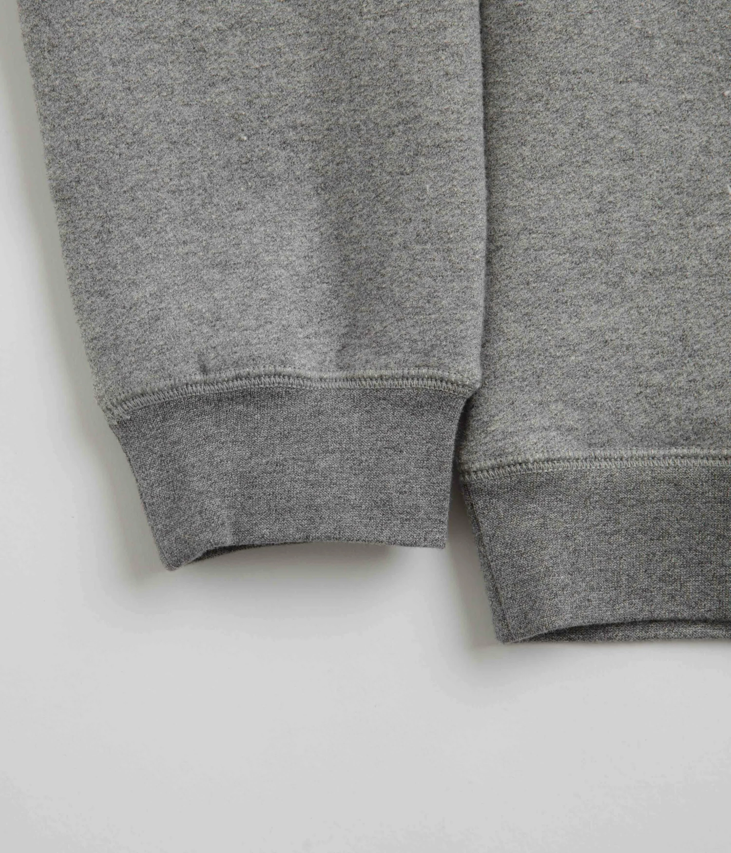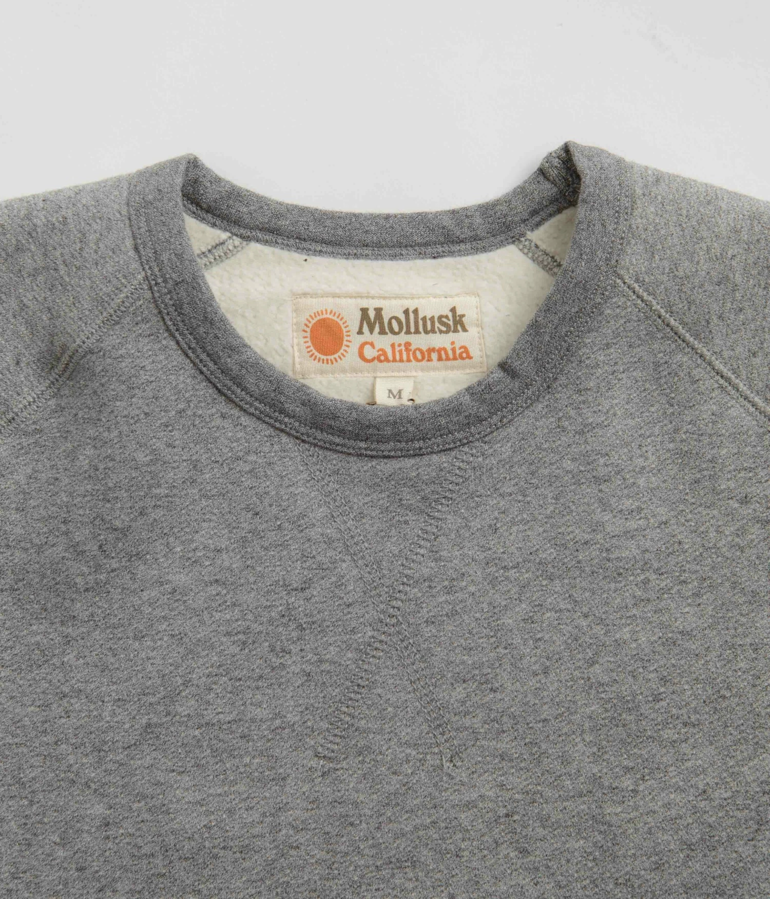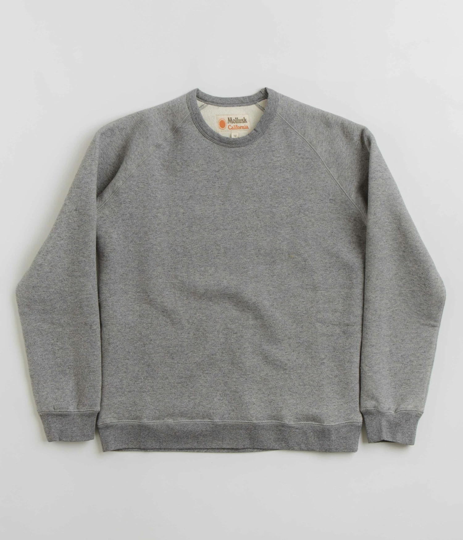 Mollusk Heavy Terry Crewneck Sweatshirt in Heather Grey. Made from a cotton-polyester blend, this regular fitting Mollusk sweatshirt is designed with a yarn dyed fabrication and with a classic rib knit collar. Featuring raglan sleeves, ribbed cuffs and a woven elastic hem, this grey Mollusk sweater is finished with tonal stitched seams.