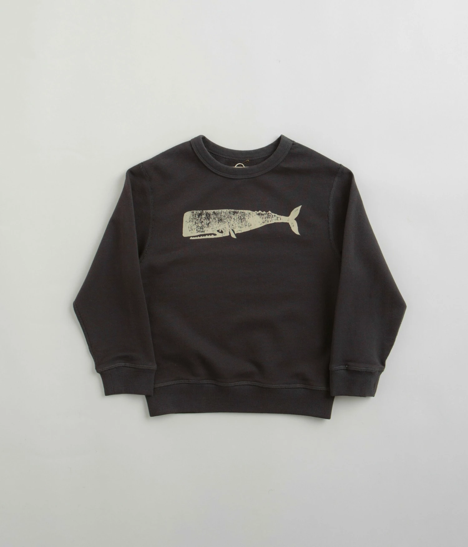 Mollusk Kids Whale Crewneck Sweatshirt in Faded Navy. Tailored to a regular fitting from 100% cotton, this peached French terry Mollusk sweatshirt is designed with a classic crew collar and ribbed cuffs. Finished in a shade of navy with a woven elastic hem and with a printed whale chest graphic.