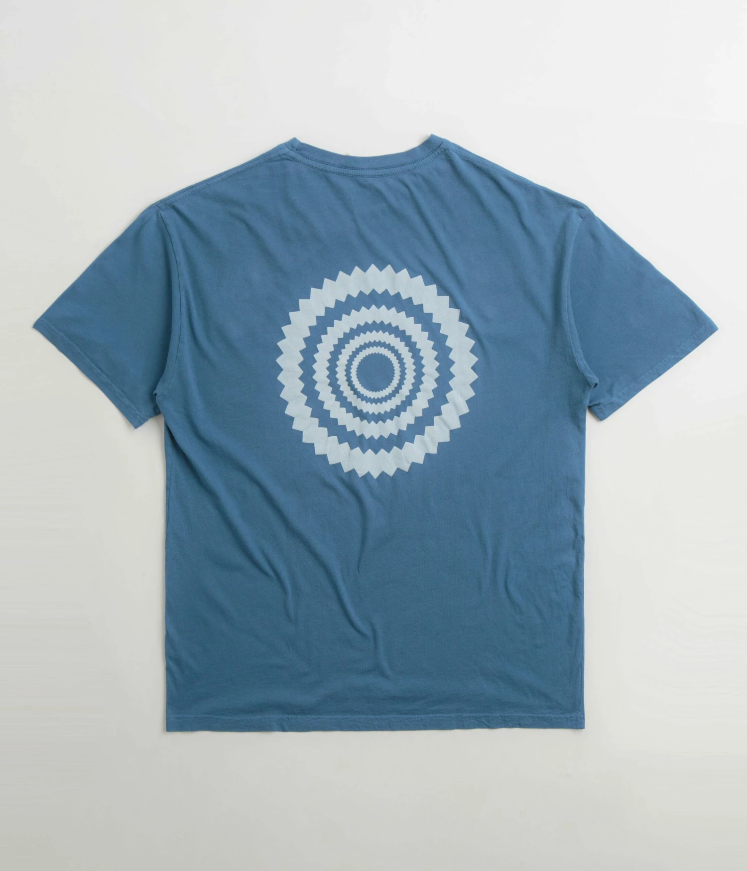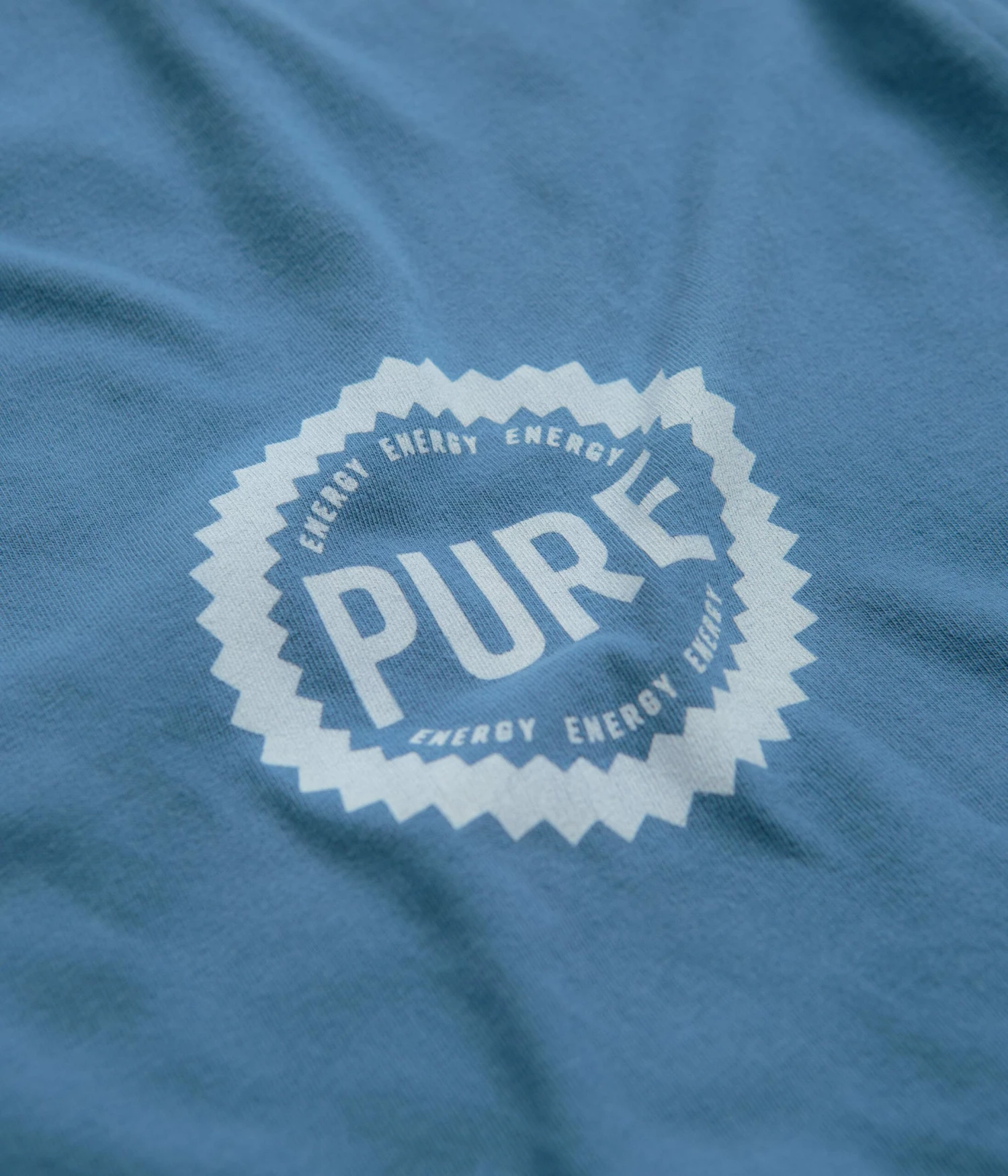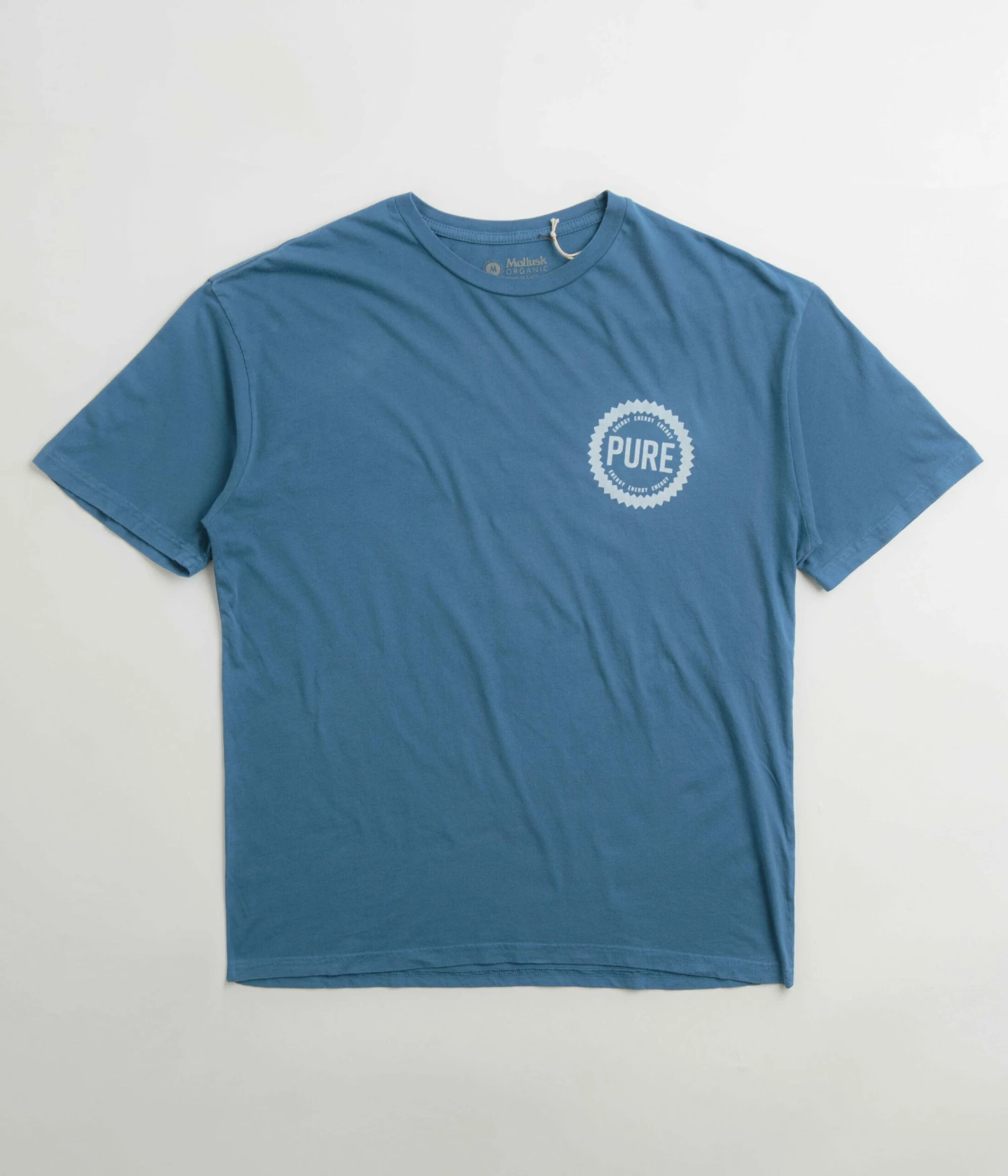 Mollusk Pure Energy T-Shirt in True Blue. Made from 100% cotton, this preshrunk Mollusk t-shirt arrives as part of the brand’s latest release. Featuring a classic crew collar and a straight cut hem, this blue Mollusk t-shirt is finished with printed graphics displayed across both the left chest and rear.