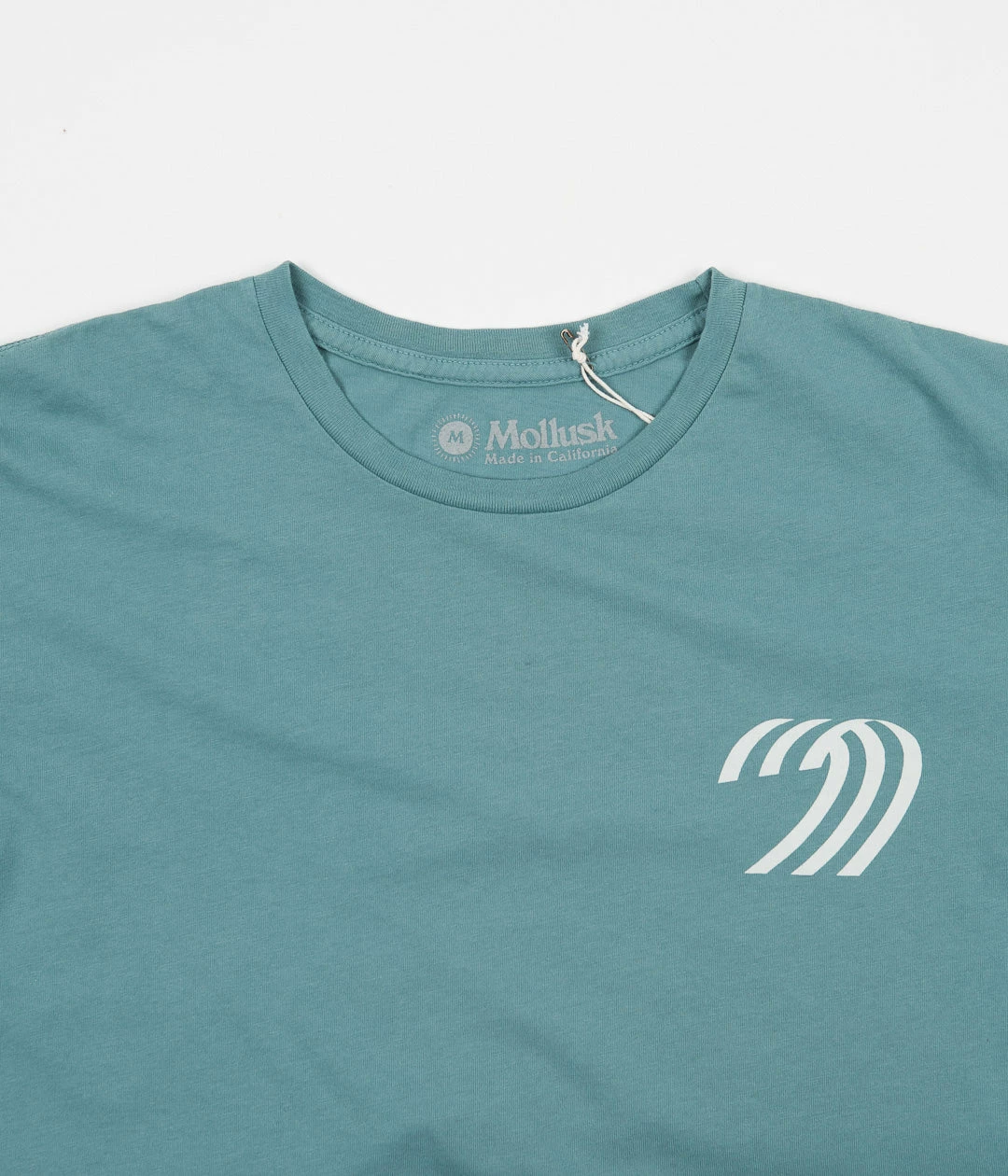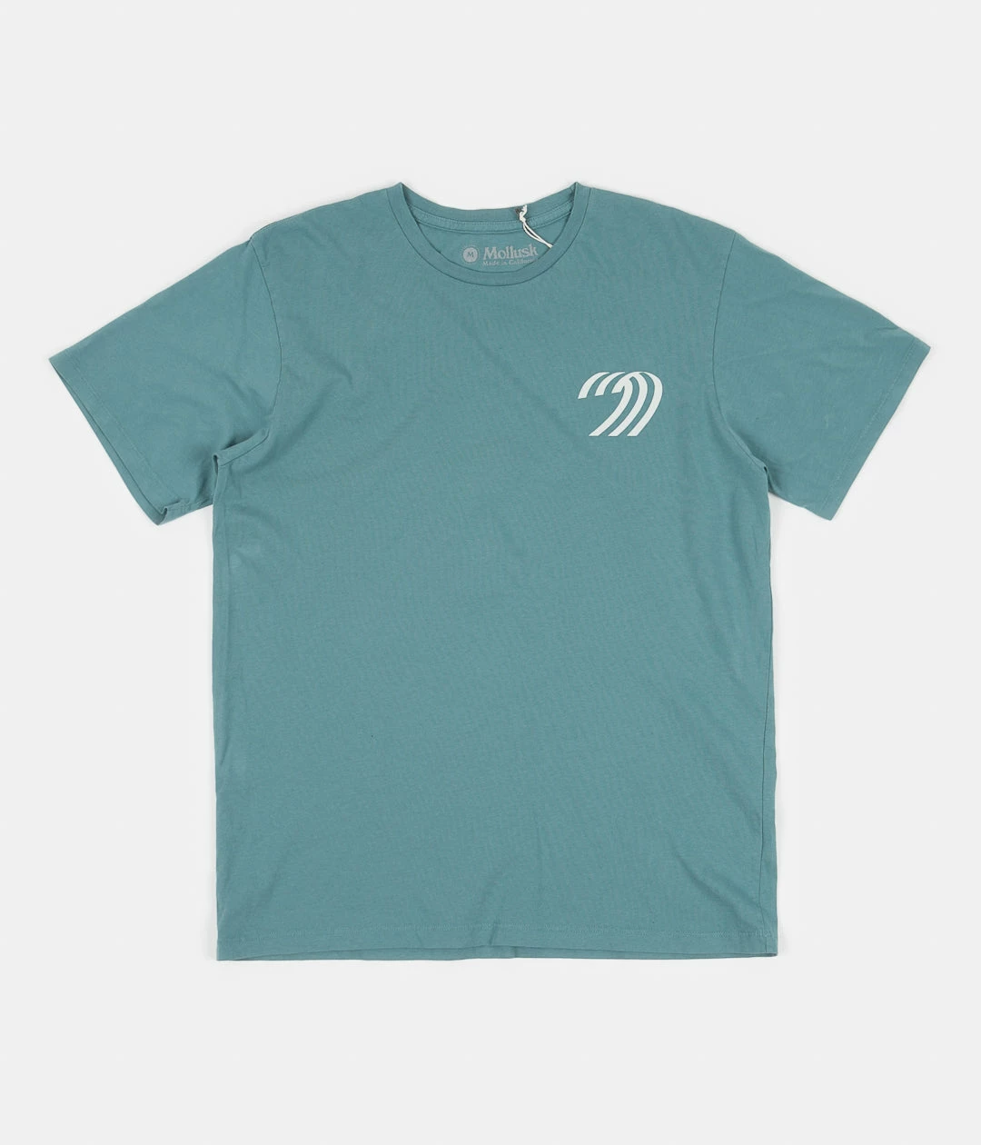 Crafted and constructed in California from 100% US cotton, the preshrunk Mollusk Team T-Shirt in a washed sapphire colourway takes inspiration from West-Coast surfing culture and its renowned charm. With bold white curved wave detailing to the upper left chest, this fully breathable tee has a comfortable crew neckline, and a crisp and clean straight hem at the waist and sleeves. Ideal for daily wear, especially during the summer months, or as part of a constructed layered look.