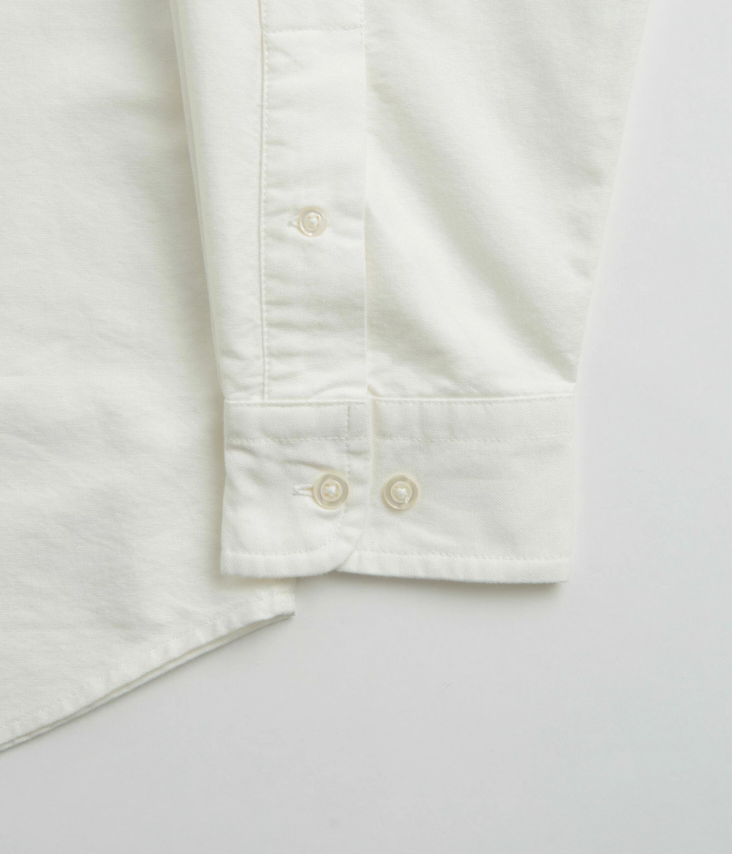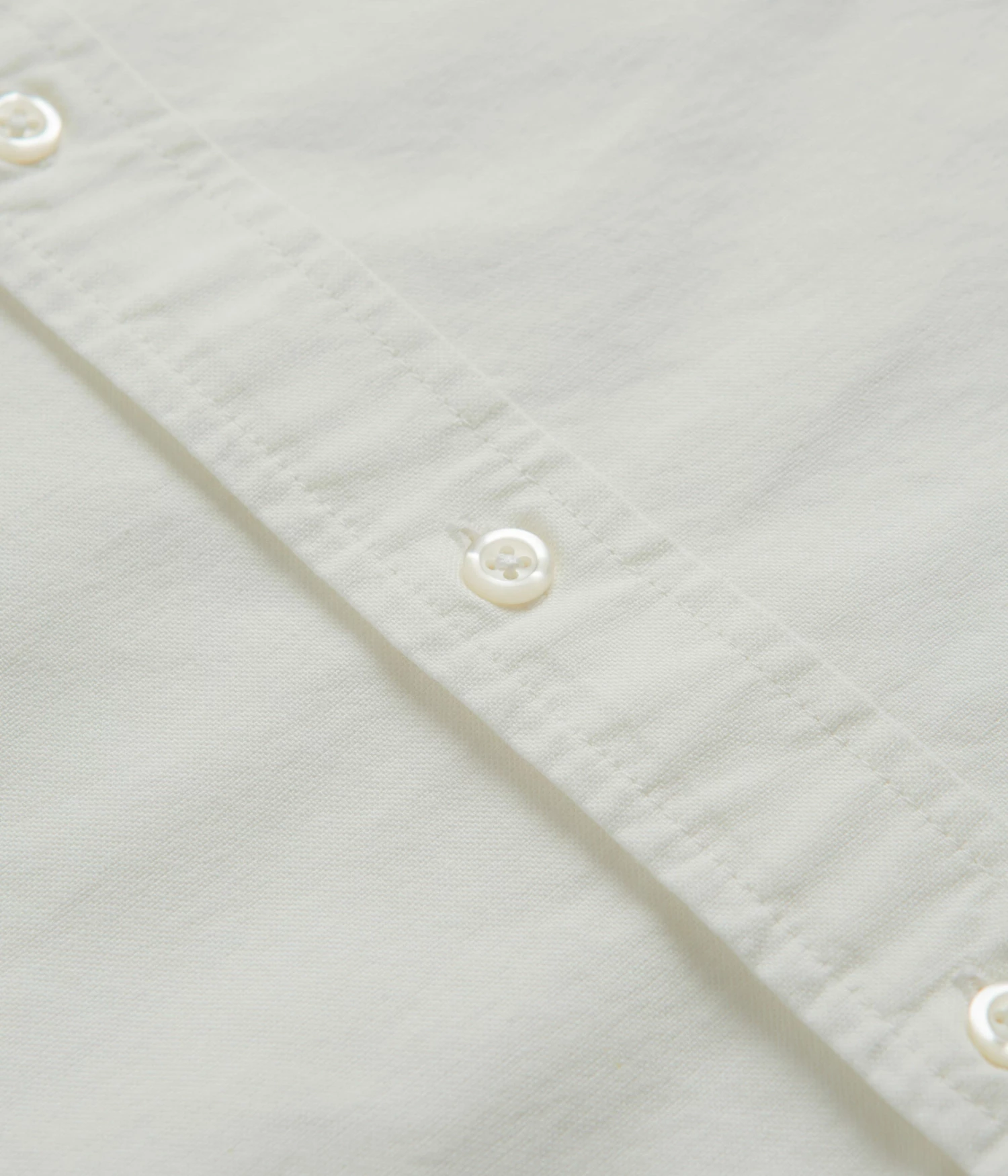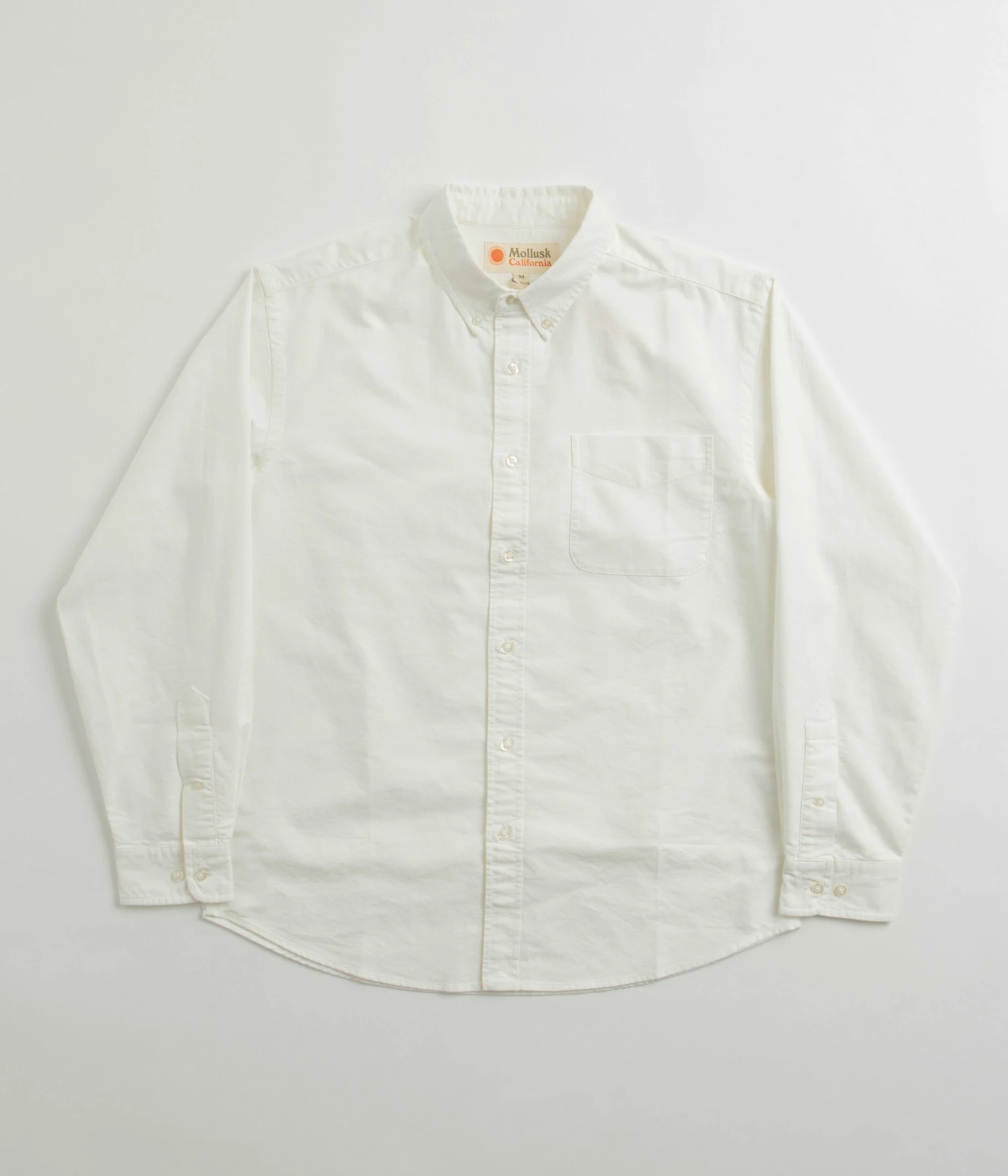 Mollusk Thurston Shirt in White. Tailored to a regular fitting from 100% cotton, this Mollusk shirt is designed with a relaxed fabric construction. Featuring a button-down collar, a full length button fastening and adjustable cuffs, this white Mollusk shirt is finished with a single left chest pocket and with a curved hem.