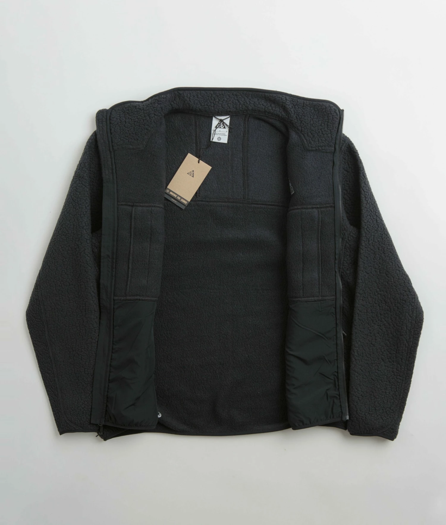 Nike ACG Arctic Wolf Full Zip Fleece in Black, Anthracite and Summit White. Tailored to a relaxed fitting from 100% polyester Polartec®, this Nike ACG fleece is designed with a full length zipper fastening and fold-over elastic cuffs. Featuring an elasticated hem, dropped shoulders and a panelled profile, this black Nike ACG fleece is finished with two waist pockets, two zippered chest pockets and with embroidered logo branding.
