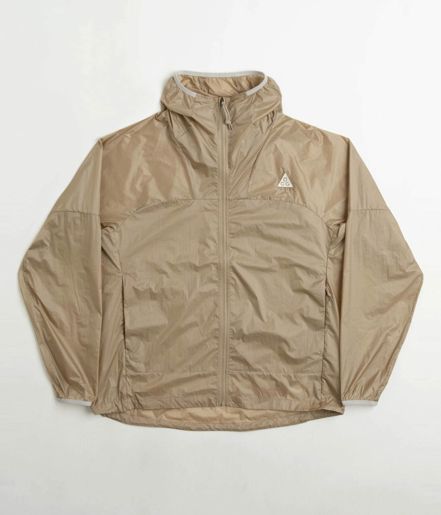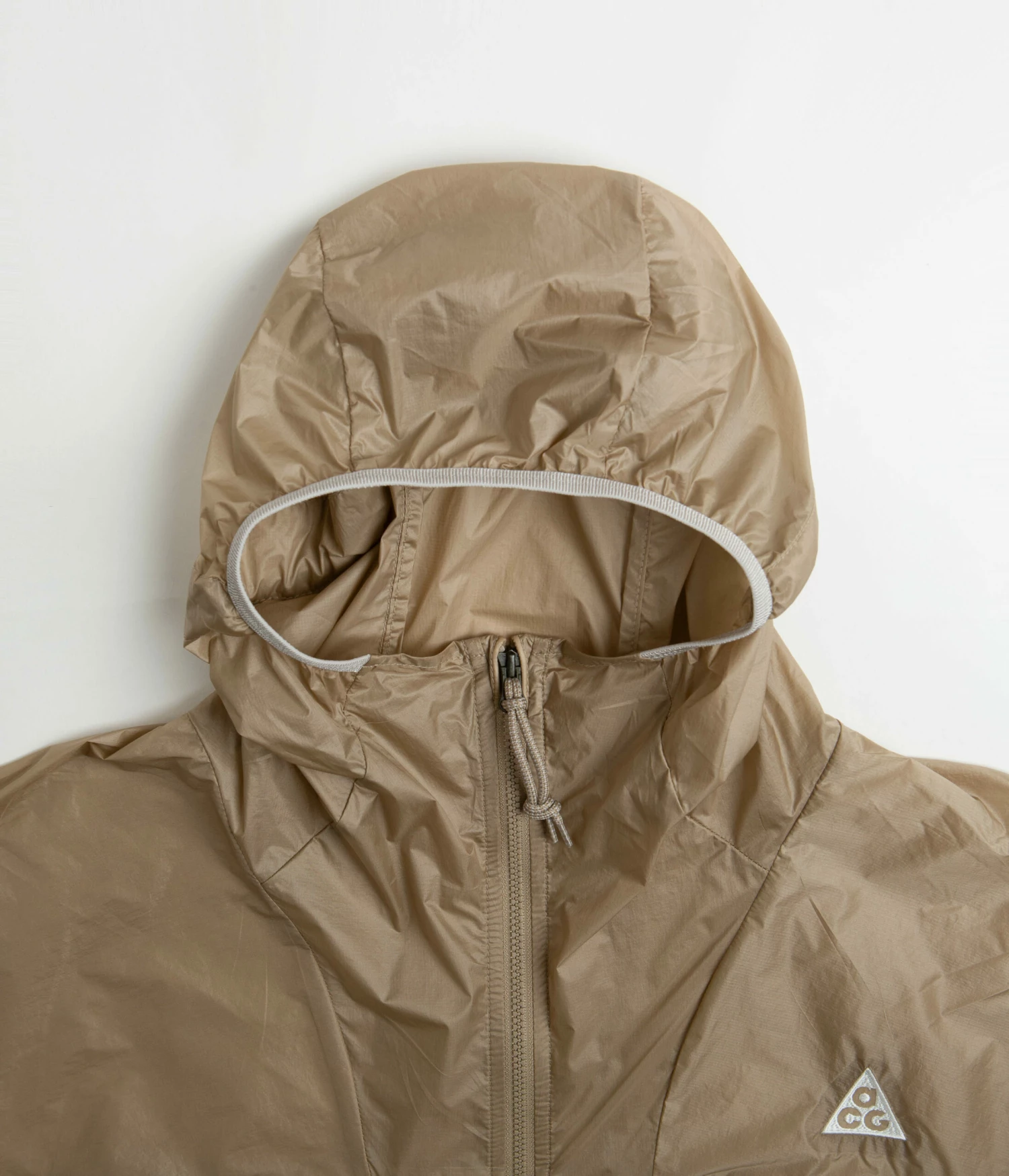 Nike ACG Cinder Cone Windproof Jacket in Khaki and Summit White. Lightweight and made from 100% recycled nylon, this packable Nike ACG jacket is a water-repellent and windproof layer tailored to a regular fitting. Featuring a full length zipper fastening, elasticated cuffs, a bungee-cord hood and an adjustable hem, this khaki Nike ACG jacket also features two zippered front pockets. Self-storing and finished with an embroidered ACG chest logo and an ACG tri-biner attachment point.