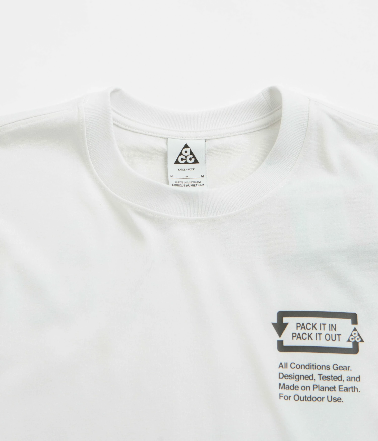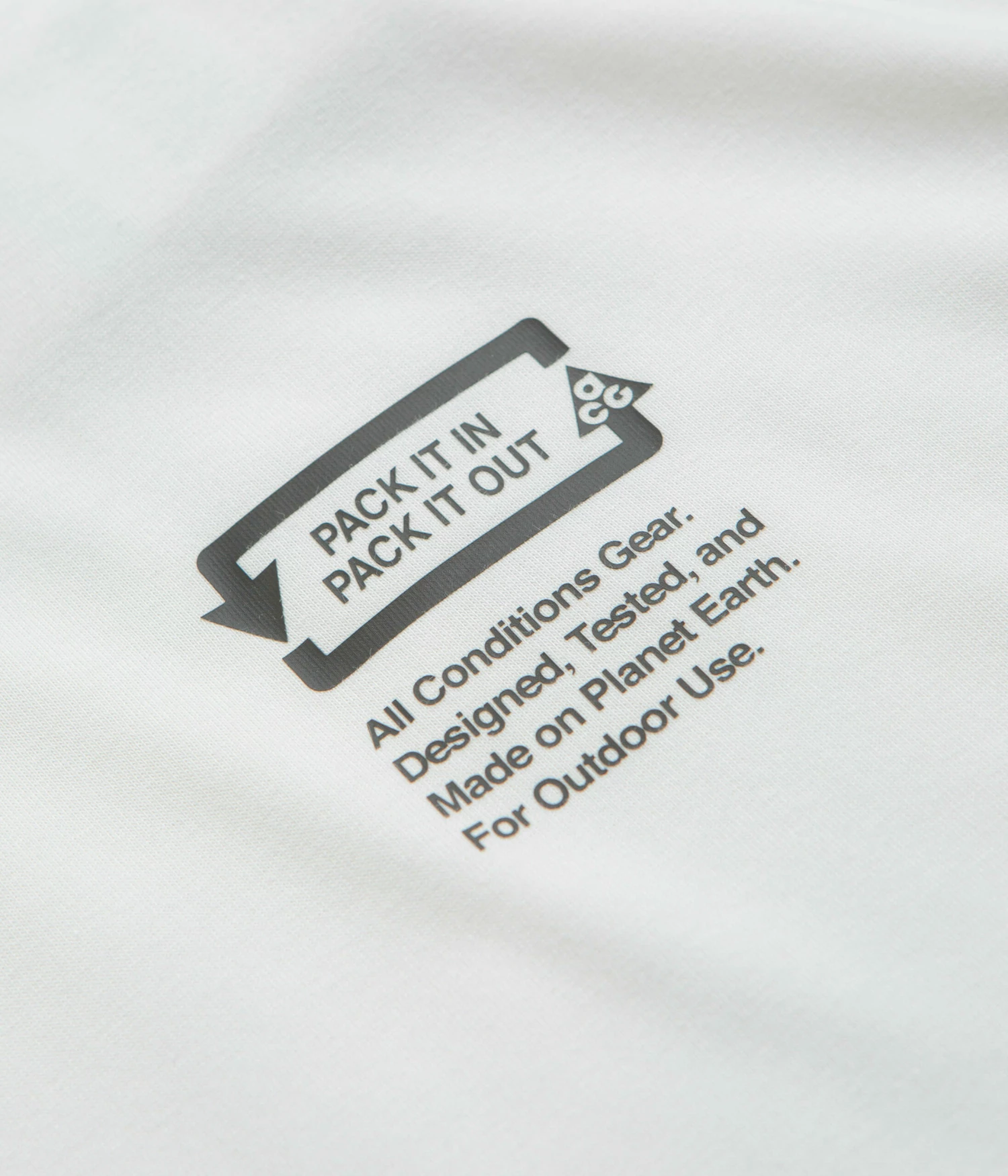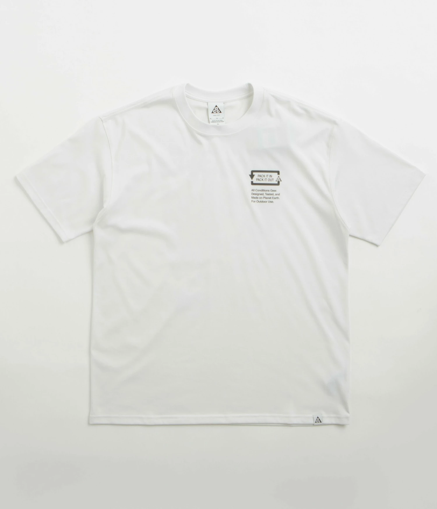 Nike ACG Pickinout T-Shirt in Summit White. Made from a polyester-cotton blend, this loose fitting Nike ACG t-shirt is designed with Dri-FIT technology. Featuring a rib knit collar and a flag labelled hem, this white Nike ACG t-shirt is finished with a printed left chest graphic.