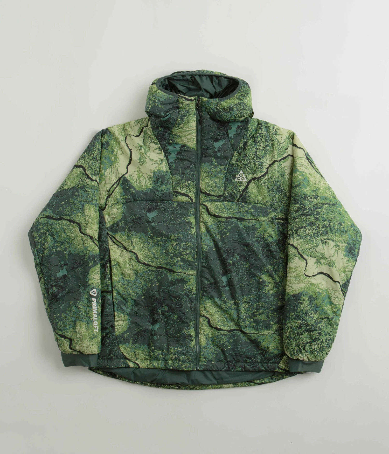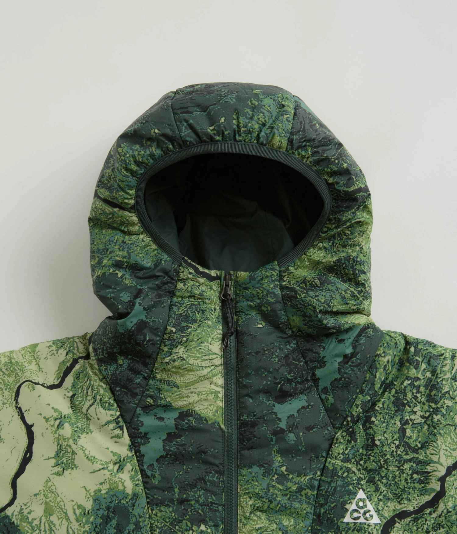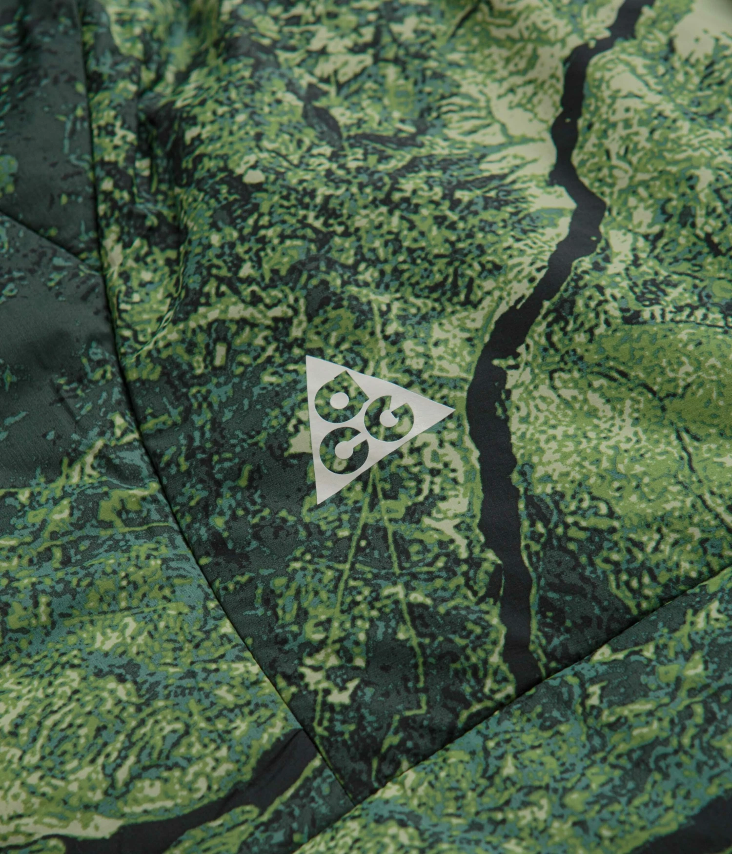 Nike ACG Rope de Dope Print Jacket in Vintage Green and Summit White. Designed with an all-over print, this loose fitting Nike ACG jacket is made from 100% nylon with PrimaLoft® insulation with Nike Therma-FIT ADV technology. Featuring a triple panelled hood, a full length zipper fastening, an extended collar and a bungee-cord adjustable hem, this green Nike ACG jacket also features two zippered waist pockets. Finished with an ACG carabiner clip, embroidered chest branding and with woven Rope de Dope inner detailing.