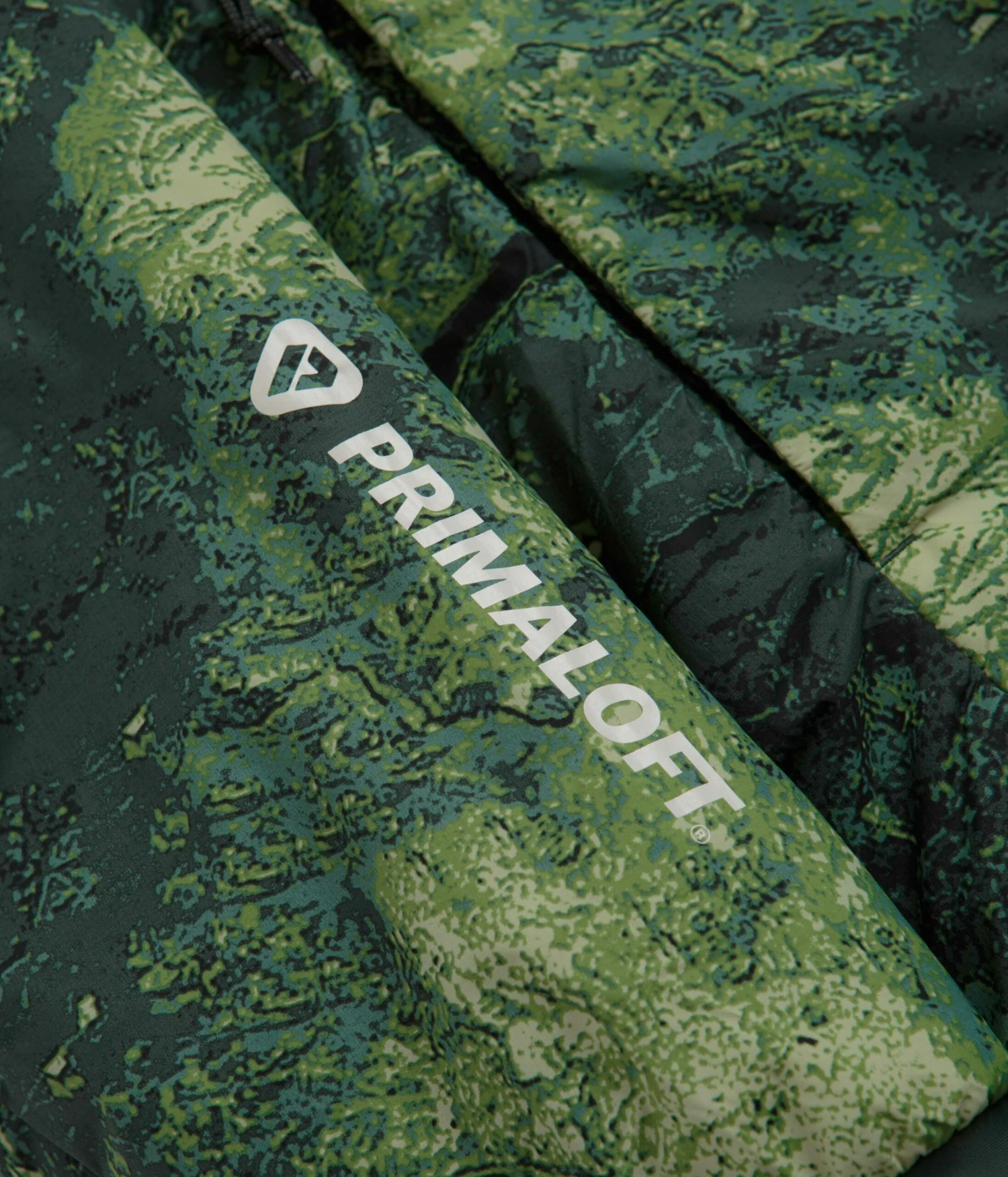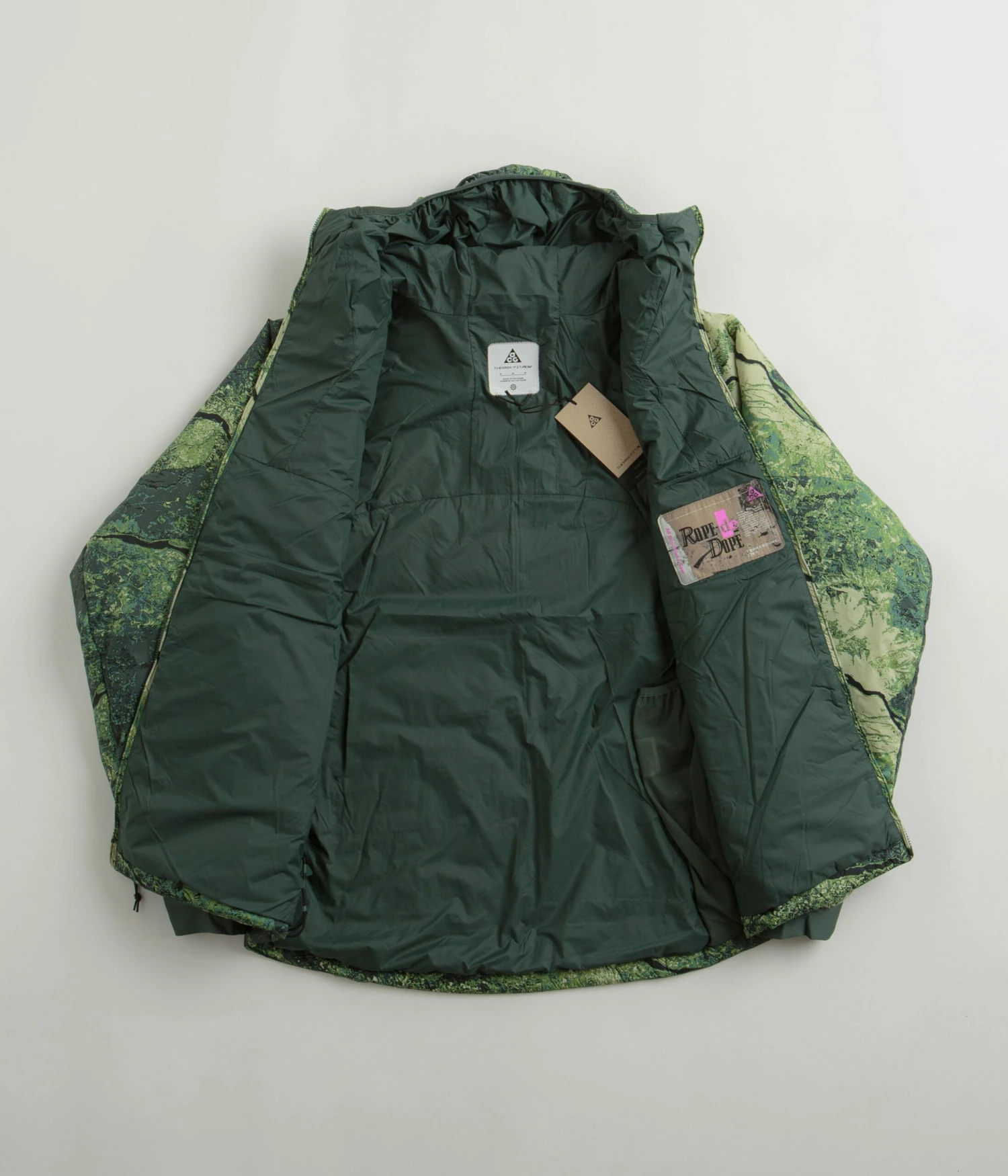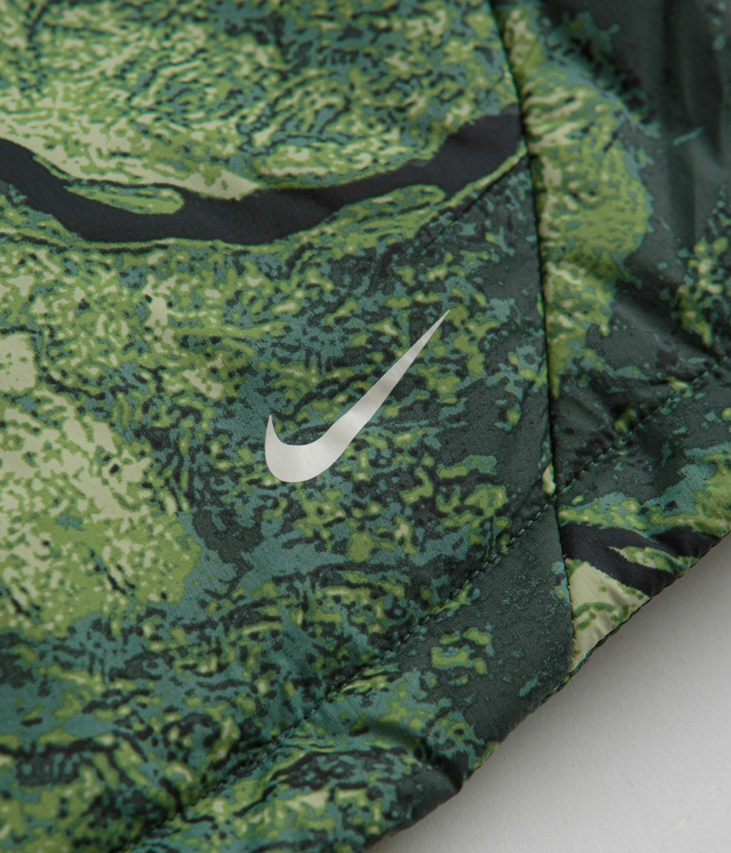 Nike ACG Rope de Dope Print Jacket in Vintage Green and Summit White. Designed with an all-over print, this loose fitting Nike ACG jacket is made from 100% nylon with PrimaLoft® insulation with Nike Therma-FIT ADV technology. Featuring a triple panelled hood, a full length zipper fastening, an extended collar and a bungee-cord adjustable hem, this green Nike ACG jacket also features two zippered waist pockets. Finished with an ACG carabiner clip, embroidered chest branding and with woven Rope de Dope inner detailing.