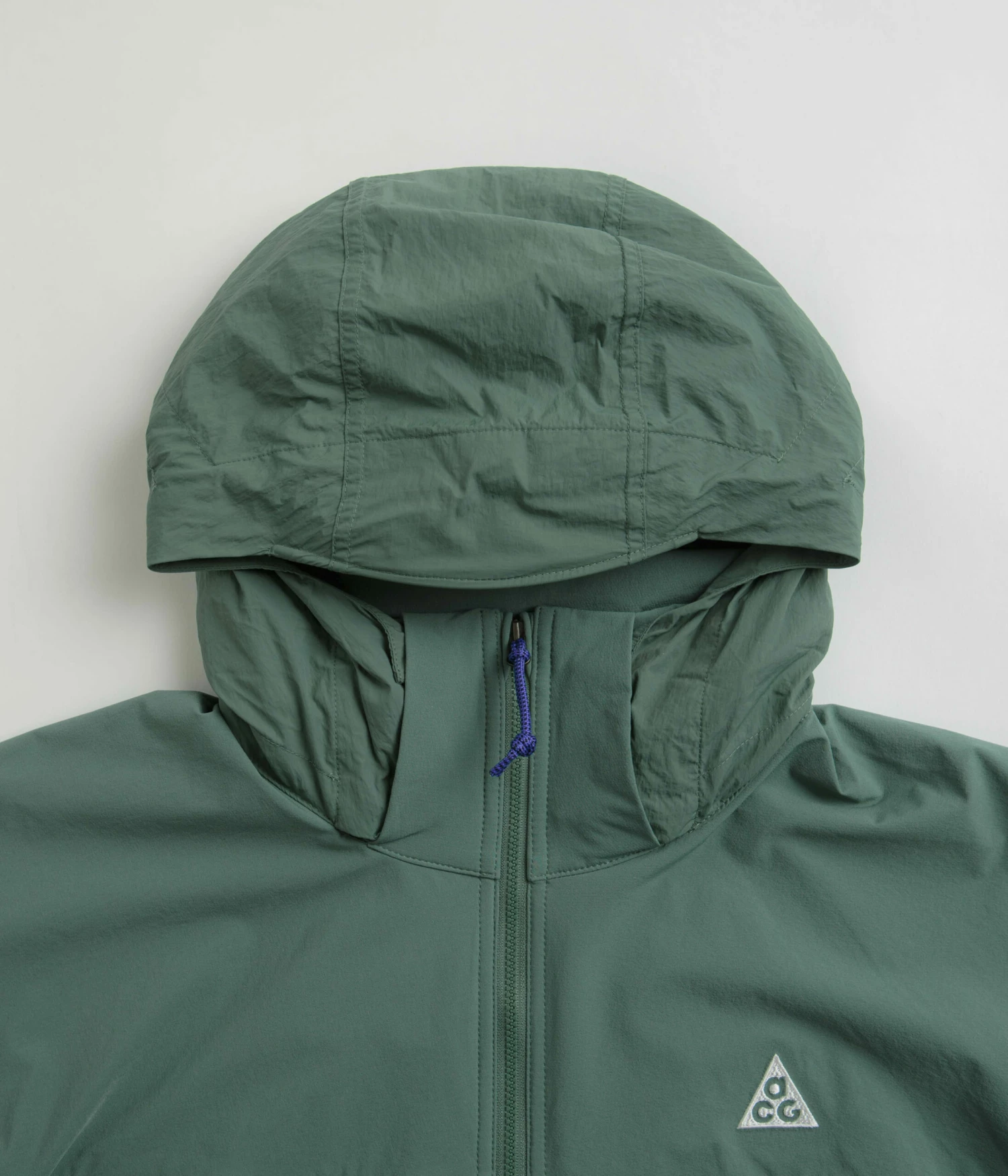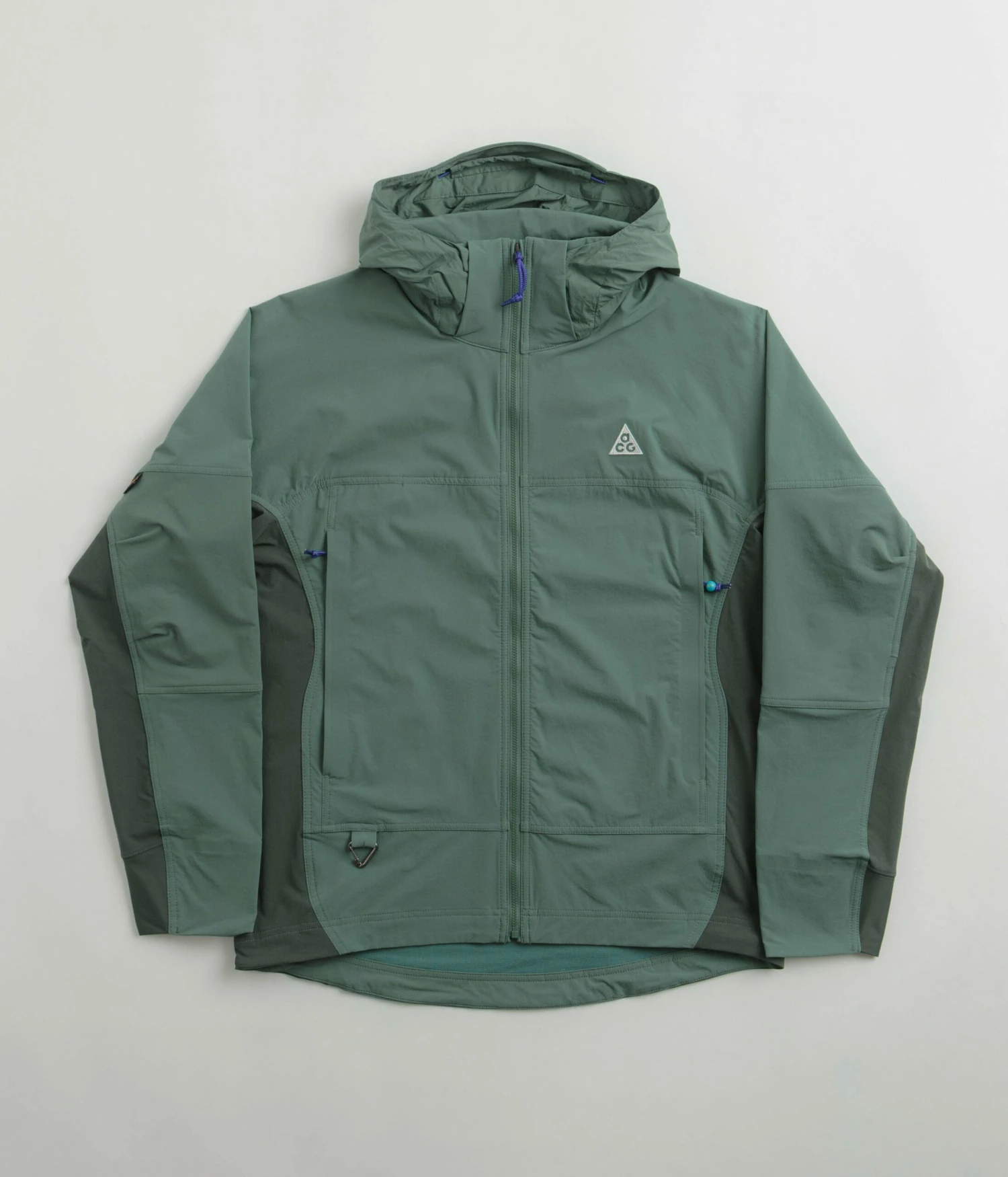Nike ACG Sun Farer Jacket in Bicoastal, Vintage Green and Summit White. Outdoor inspired and tailored to a regular fitting, this Nike ACG jacket is made from a nylon-elastane blend. Featuring a three-panel hood, data-mapped seams and panelled sides, this green Nike ACG jacket also features a bungee-cord hem. Finished with two zippered waist pockets, cordura elbow patches, an ACG carabiner attachment and with ACG branding.