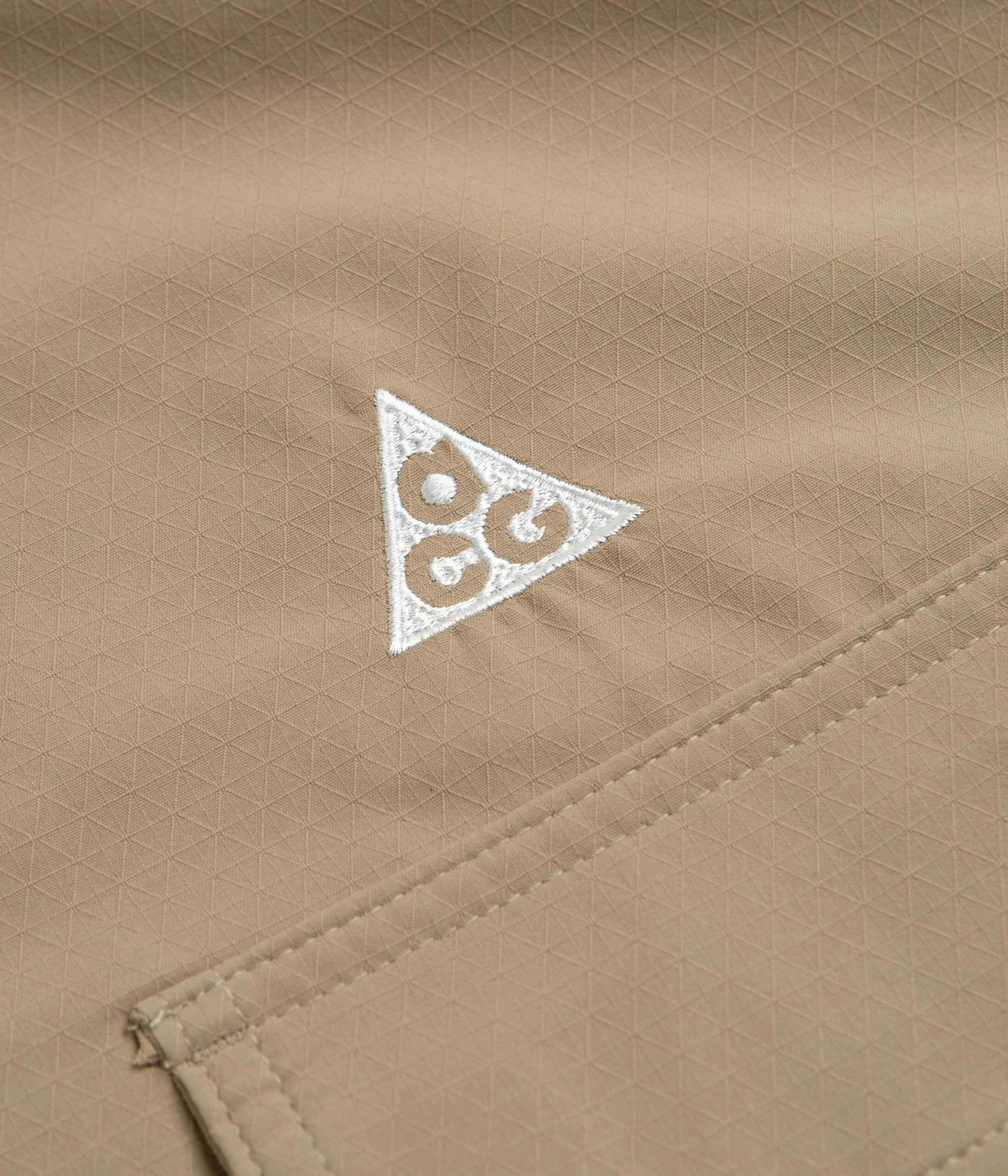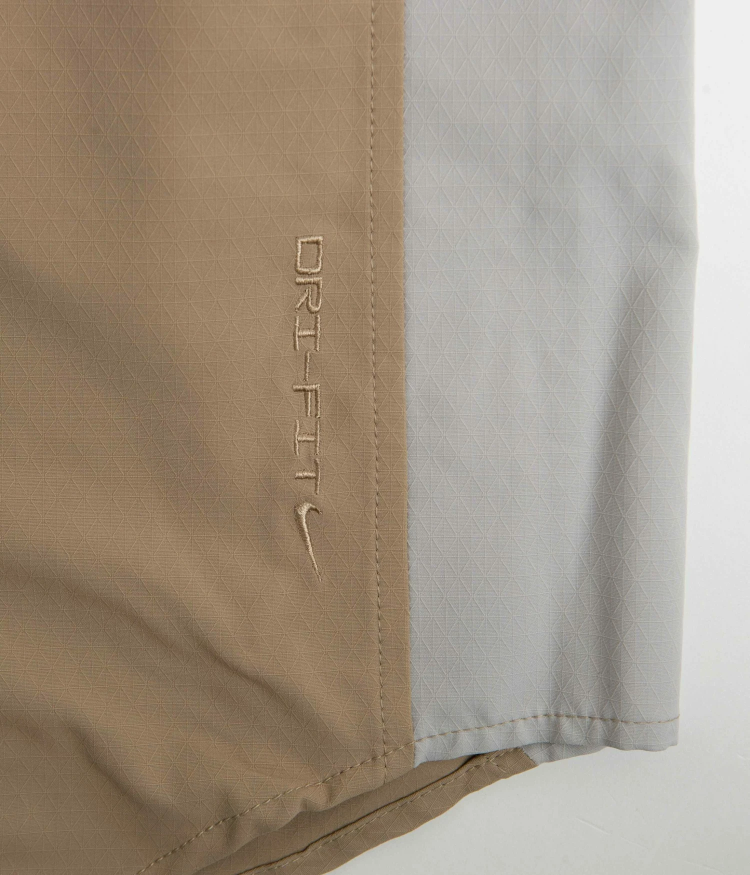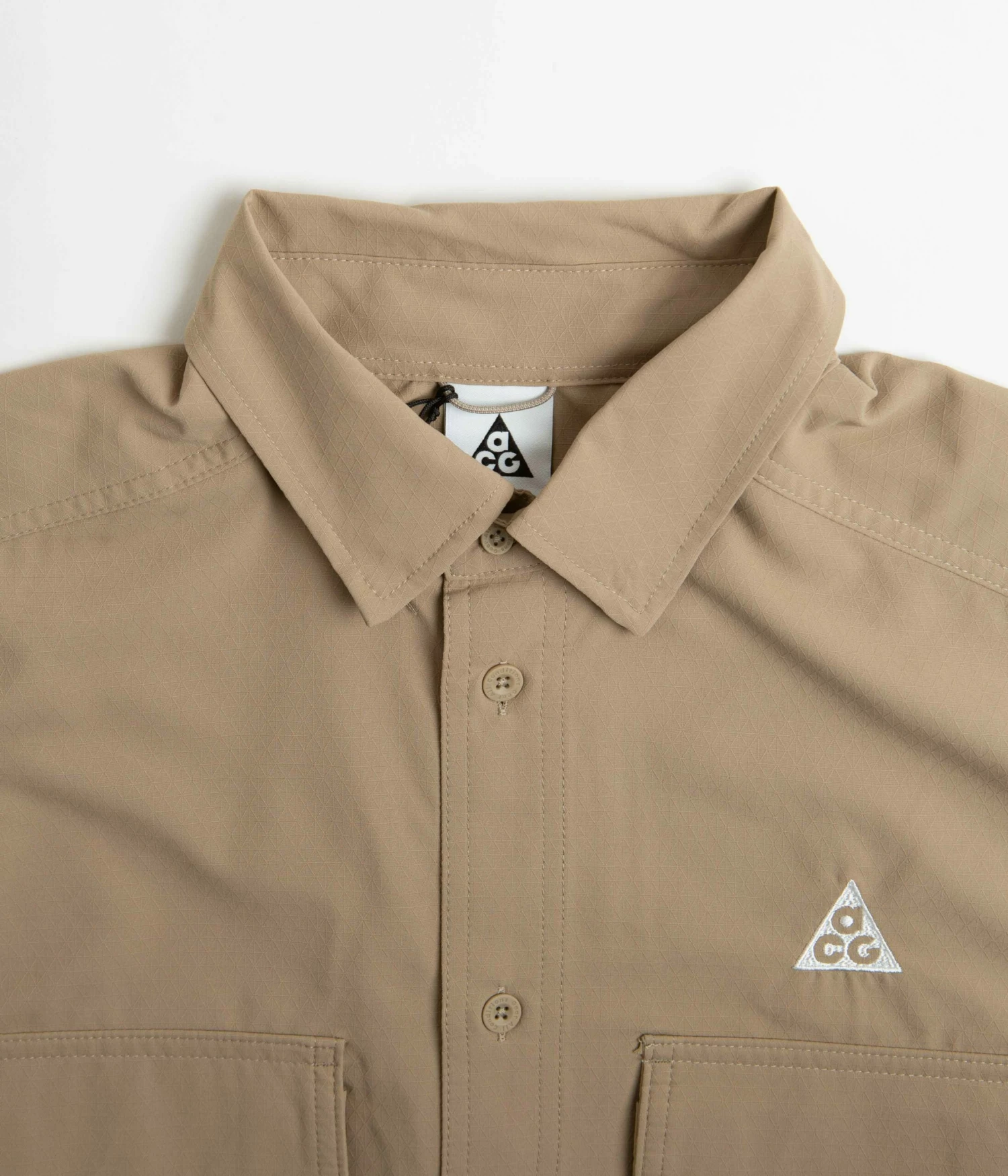 Nike ACG UV Devastation Trail Shirt in Khaki, Light Iron Ore and Summit White. Named after a Hawaii Volcanoes National Park trail, this regular fitting Nike ACG shirt is made from at least 75% recycled fabric with Nike Dri-FIT technology built in. Featuring UVA and UVB protection with a full length button fastening, a button-down collar and a curved hem, this khaki Nike ACG trail shirt is finished with adjustable cuffs, multiple chest pockets, embroidered branding and with an ACG tri-biner attachment point.