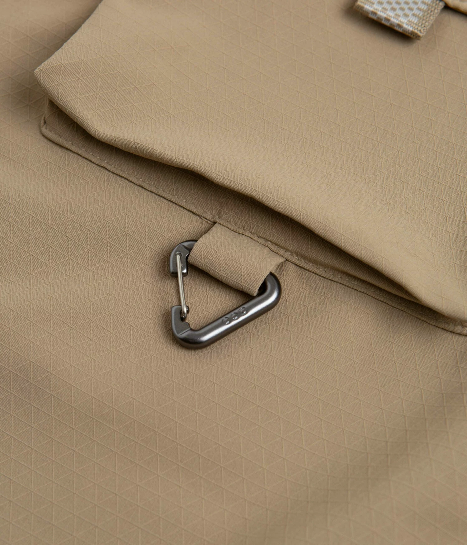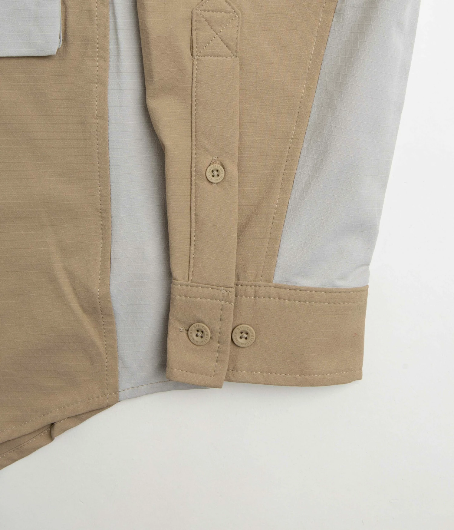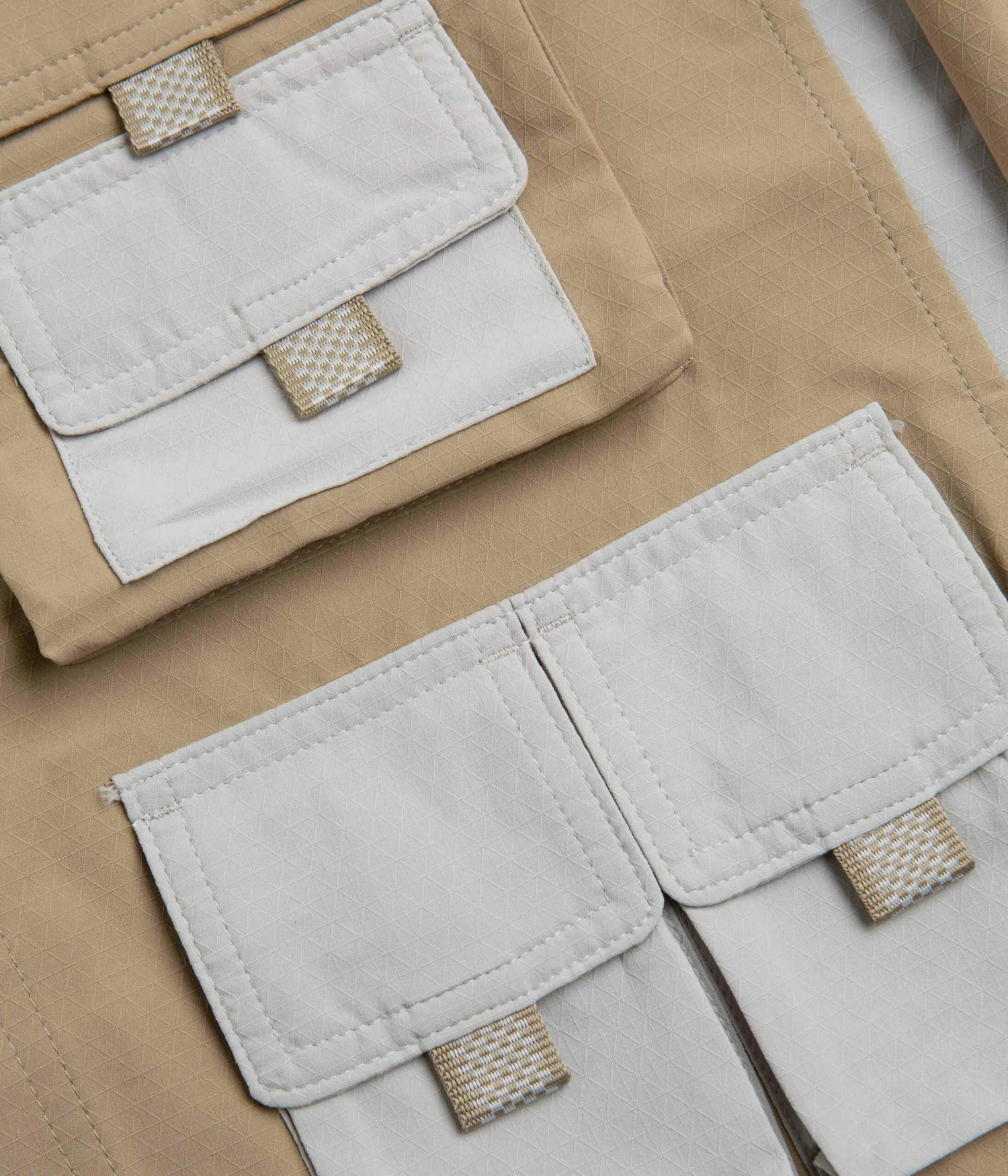Nike ACG UV Devastation Trail Shirt in Khaki, Light Iron Ore and Summit White. Named after a Hawaii Volcanoes National Park trail, this regular fitting Nike ACG shirt is made from at least 75% recycled fabric with Nike Dri-FIT technology built in. Featuring UVA and UVB protection with a full length button fastening, a button-down collar and a curved hem, this khaki Nike ACG trail shirt is finished with adjustable cuffs, multiple chest pockets, embroidered branding and with an ACG tri-biner attachment point.